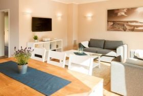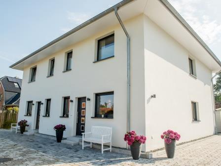 In den jeweils modern eingerichteten 110 qm Doppelhaushälften befinden sich im 1. OG ein Vollbad, ein Schlafzimmer mit Doppelbett 1,80× 2,00 Meter mit TV, ein Schlafzimmer mit Doppelbett 1,60× 2,00 Meter sowie ein Zimmer mit zwei Einzelbetten 0,90× 2,00 Meter.(Haus A und B) Haus C bietet ein Schlafzimmer mit Doppelbett 1,80 × 2,00 Meter und TV,sowie 2 Schlafzimmer mit jeweils 2 Einzelbetten 0,90× 2,00 Meter.