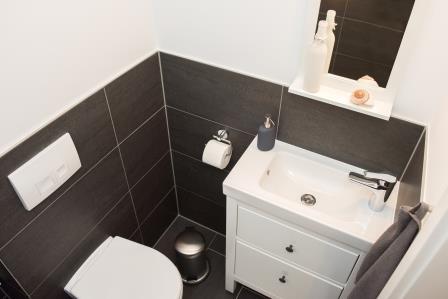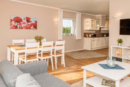 Im Erdgeschoss führt Sie ein kleiner Flur mit Gäste WC direkt in den freundlichen und großzügigen offenen Wohn-und Essbereich. Es erwartet Sie eine komplett ausgestattete Einbauküche. Der große Esstisch bietet Platz für bis zu 6 Personen. Im gemütlichen Wohnbereich warten zwei Couchgarnituren und TV zum entspannen und verweilen auf Sie.