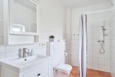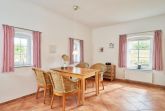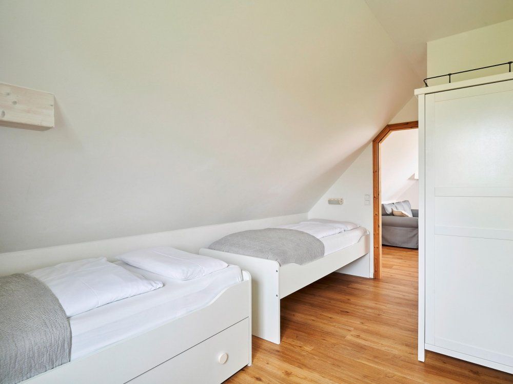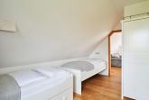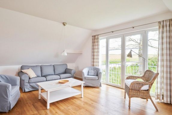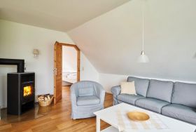 Die Wohnung befindet sich im Kutscherhaus, welches um 1900 erbaut wurde. Sie hat im EG eine Wohnküche sowie ein Doppelschlafzimmer und ein Bad. Im OG befindet sich ein großes Wohnzimmer mit Fensterfront nach Osten sowie ein Schlafzimmer mit 1 Einzelbett und ein Schlafzimmer mit 2 Einzelbetten - beide haben den Blick nach Westen auf eine Pferdeweide. Dazu gehören 2 Terrassen - eine nach Osten und eine nach Westen.