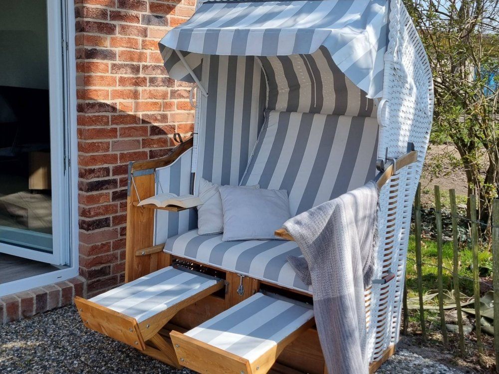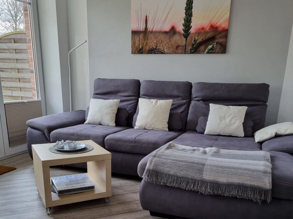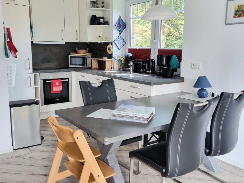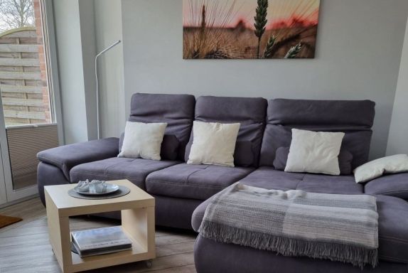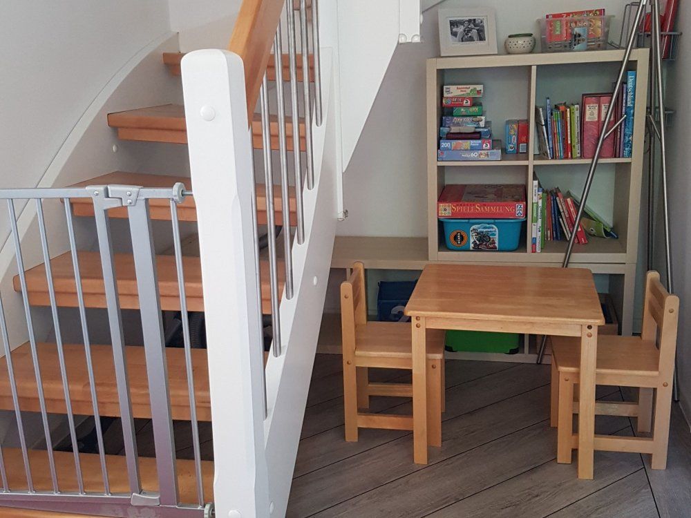 Diese DHH erstreckt sich über Erdgeschoss und den 1. Stock. Sie haben oben einen Eltern-Schlafraum mit großem Spiegelschrank und Boxspringbetten. In diesem Raum steht ein zusätzlicher Flachbildschirm. Ein zusätzliches Kinderbett können wir hier aufbauen. Das Kinderzimmer verfügt über zwei Einzelbetten und ein zusätzliches Reservebett. Ein schönes großzügiges Bad mit Dusche und Badewanne, Waschbecken und WC befindet sich auch im ersten Stock. Der Eingangsbereich ist hell und freundlich, mit zwei Schuhregalen und zwei Garderoben. Der große Wohnraum hat eine gemütliche Kuschel-Couch. Gegenüber befindet sich der großem Flachbildschirm und eine kleine Stereoanlage. Die Küche mit angeschlossenen Esstisch, ist im Wohnraum untergebracht. Die Küche hat eine gute Ausstattung mit wirklich allen Küchengeräten. Oben und unten kann die Treppe auf Wunsch, mit einem Treppenschutzgitter verschlossen werden. Unter der Treppe ist eine Kinderspieleecke. Zusätzlich haben Sie im Eingangsbereich ein großzügiges Gäste WC. Die Terrasse ist gut möbliert und hat einen wunderschönen Blick in die unbebaute Natur und einen eigenen neuen Strandkorb und Hängematte. Im Garten ist eine Spielküche und eine kleine Sandkiste zur allgemeinen Nutzung. Der Grill steht bereit. Hier kommen die Schafe direkt an den r Kinderspielplatz befindet sich in Sichtweite.
