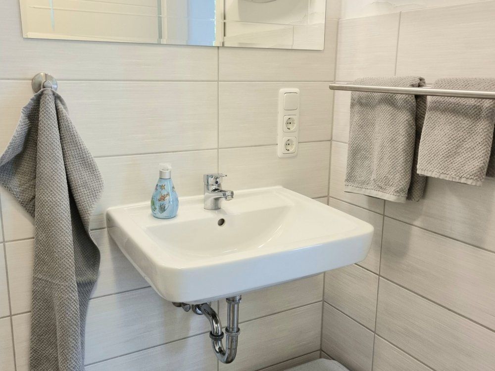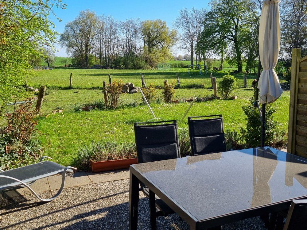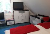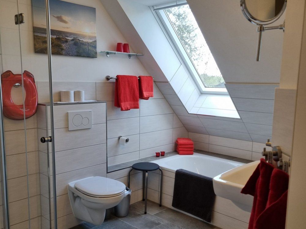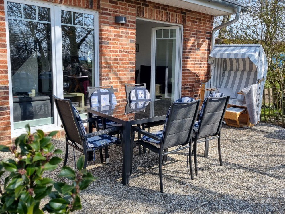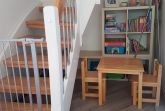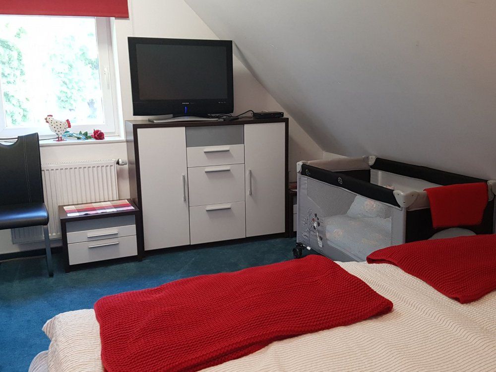 Diese DHH erstreckt sich über Erdgeschoss und den 1. Stock. Sie haben oben einen Eltern-Schlafraum mit großem Spiegelschrank und Boxspringbetten. In diesem Raum steht ein zusätzlicher Flachbildschirm. Ein zusätzliches Kinderbett können wir hier aufbauen. Das Kinderzimmer verfügt über zwei Einzelbetten und ein zusätzliches Reservebett. Ein schönes großzügiges Bad mit Dusche und Badewanne, Waschbecken und WC befindet sich auch im ersten Stock. Der Eingangsbereich ist hell und freundlich, mit zwei Schuhregalen und zwei Garderoben. Der große Wohnraum hat eine gemütliche Kuschel-Couch. Gegenüber befindet sich der großem Flachbildschirm und eine kleine Stereoanlage. Die Küche mit angeschlossenen Esstisch, ist im Wohnraum untergebracht. Die Küche hat eine gute Ausstattung mit wirklich allen Küchengeräten. Oben und unten kann die Treppe auf Wunsch, mit einem Treppenschutzgitter verschlossen werden. Unter der Treppe ist eine Kinderspieleecke. Zusätzlich haben Sie im Eingangsbereich ein großzügiges Gäste WC. Die Terrasse ist gut möbliert und hat einen wunderschönen Blick in die unbebaute Natur und einen eigenen neuen Strandkorb und Hängematte. Im Garten ist eine Spielküche und eine kleine Sandkiste zur allgemeinen Nutzung. Der Grill steht bereit. Hier kommen die Schafe direkt an den r Kinderspielplatz befindet sich in Sichtweite.