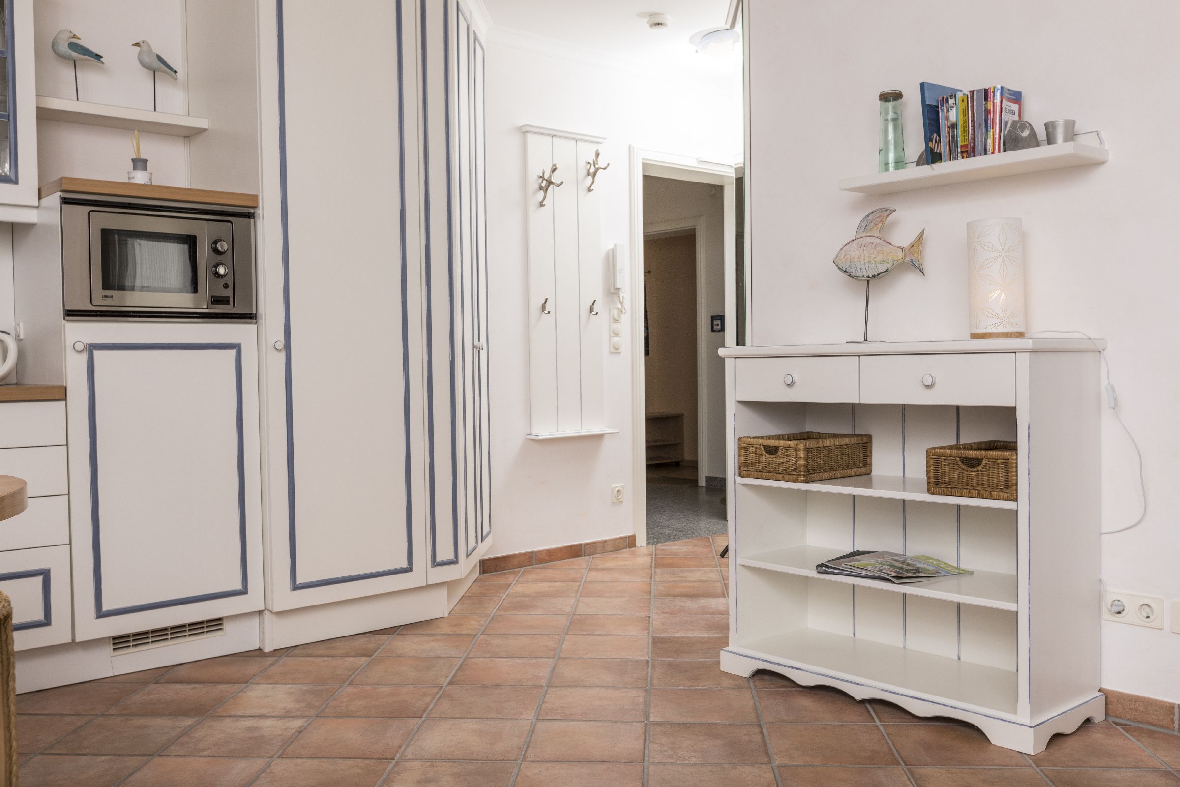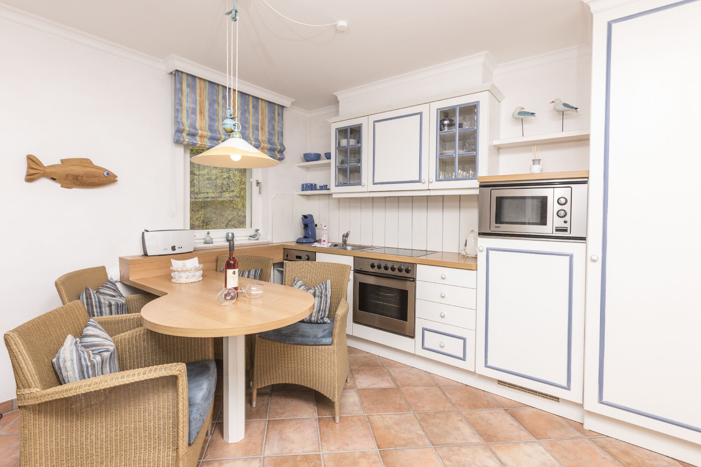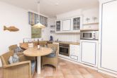 Mit hohem Wohnkomfort ausgestattete Ferienwohnung: 1 Wohnraum mit Essbereich, 1 Schlafzimmer, 1 Bad. Im Wohnzimmer eine moderne Sitzcouch, kostenloser Internetzugang vorhanden, Flachbildfernseher, Stereoanlage/CD, DVD-Player, ein großer Balkon mit Meerblick. Die Küche ist mit geräumiger Küchenzeile, Kühlschrank mit Gefrierfach, Cerankochfeld, Mikrowelle, Toaster, Wasserkocher, Kaffeemaschine, Geschirrspüler und reichlich Küchen-Utensilien ausgestattet. Bad mit Dusche, Waschbecken, WC, Heizkörper. Ein Schlafzimmer mit Doppelbett und großem Schrank. Kinderreisebett, Kinderstuhl und Kindergeschirr. Münzwaschmaschine. Münztrockner. kostenfreier außen Stellplatz.