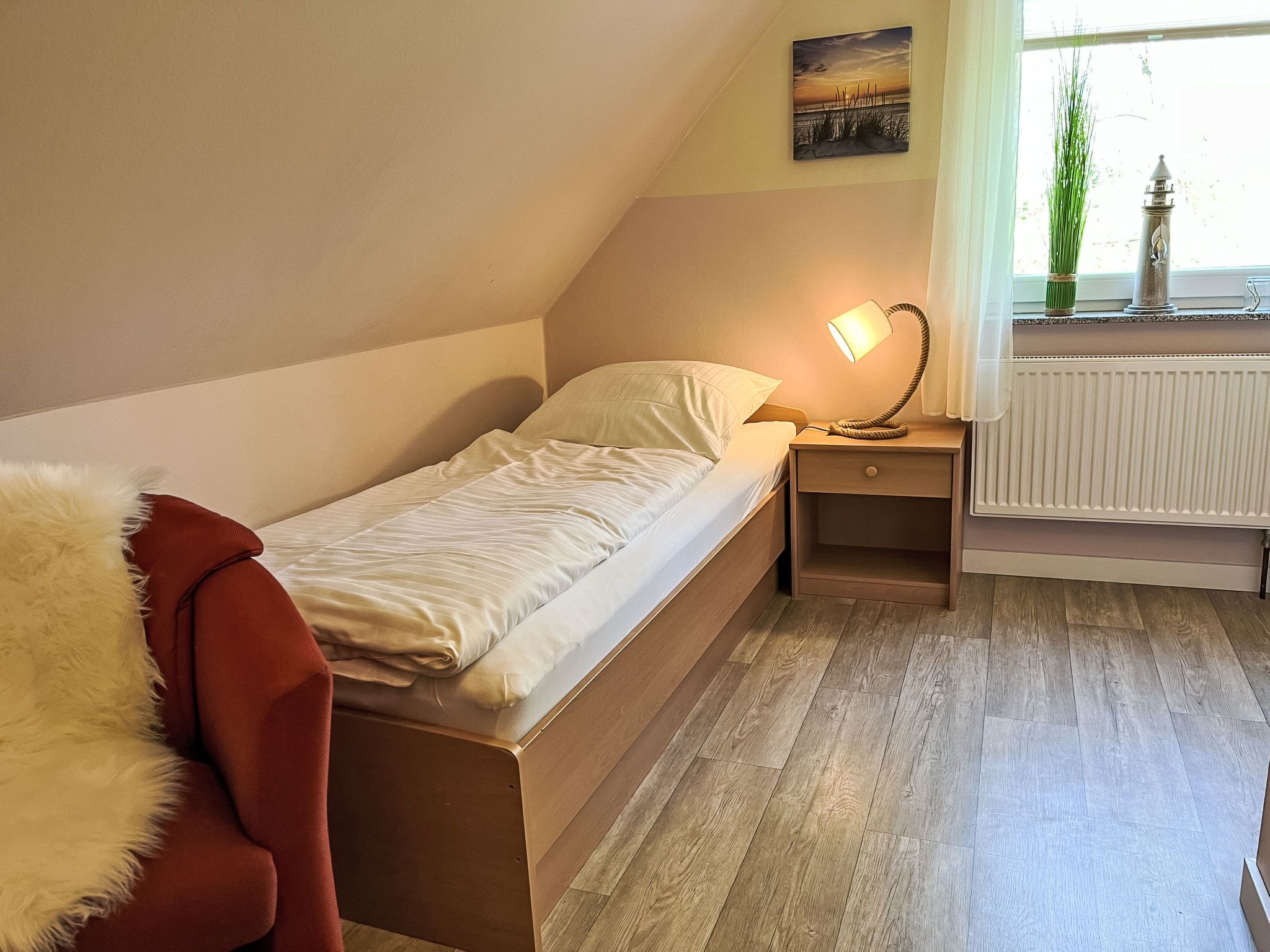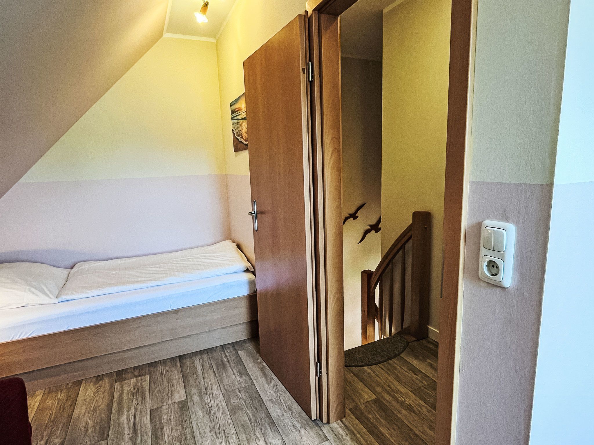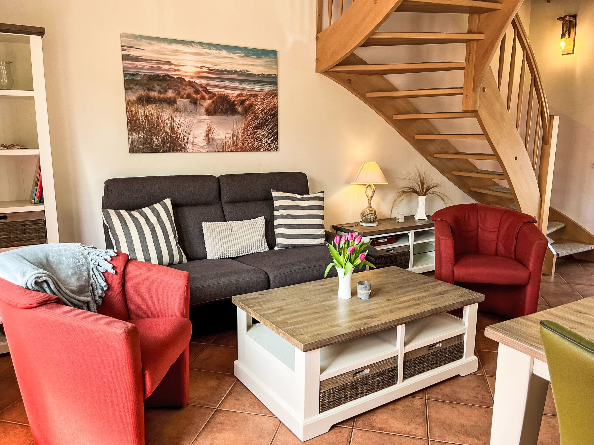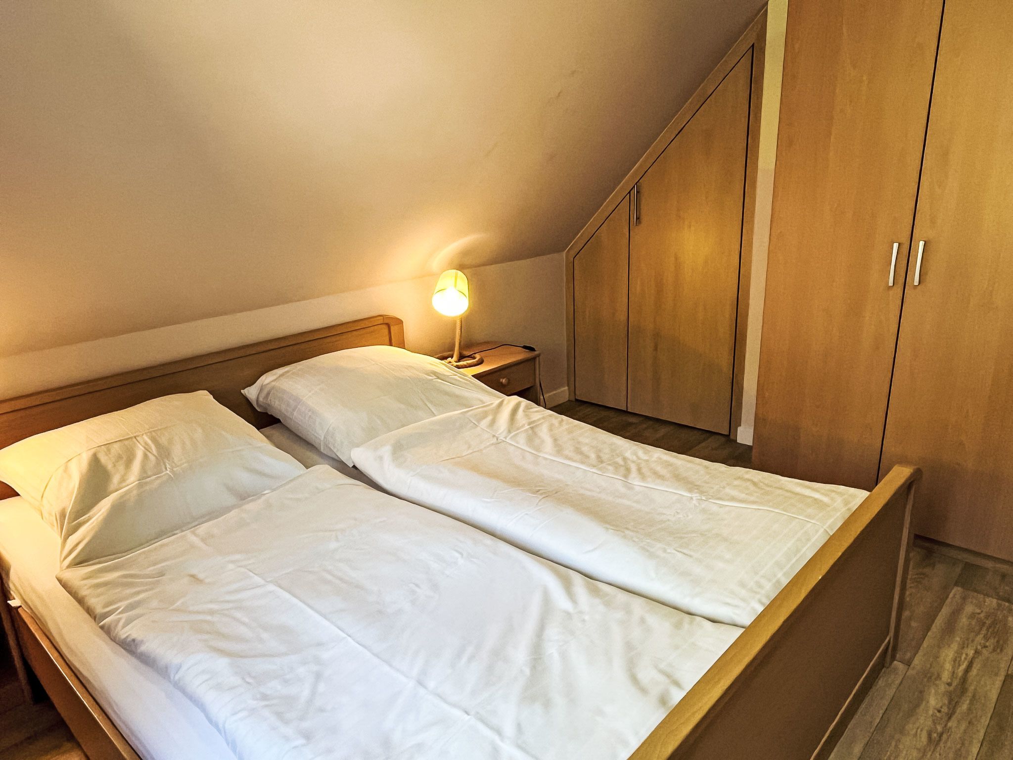 Möwennest + Muschelnest, 6-Zimmer-Haus 120 m2 auf 2 Stockwerken. Schön und geschmackvoll eingerichtet: Wohn-/Esszimmer mit Esstisch, Sat-TV, Radio und CD. Ausgang zur Terrasse. Wohn-/Esszimmer mit Sat-TV, Radio und CD. Ausgang zur Terrasse. Offene Küche (4 Kochplatten, Geschirrspüler, Toaster, Wasserkocher, Mikrowelle, elektrische Kaffeemaschine). 2 Duschen/WC. Obergeschoss: 1 abgeschrägtes Zimmer mit 1 Doppelbett. 1 abgeschrägtes Zimmer mit 2 Betten. 1 abgeschrägtes Zimmer mit 1 Doppelbett. 1 abgeschrägtes Zimmer mit 2 Betten. G-Heizung. Terrasse 8 m2 teilweise überdacht. Terrassenmöbel. Zur Verfügung: Kinderhochstuhl, Babybett (extra). Internet (Wireless LAN, gratis). Bitte beachten: Nichtraucher-Haus. Maximal 2 Haustiere/Hunde erlaubt. Rauchmelder. Keine interne Verbindung zwischen den separaten Wohneinheiten. Jede der beiden getrennten Wohneinheiten verfügt über eine Küche.