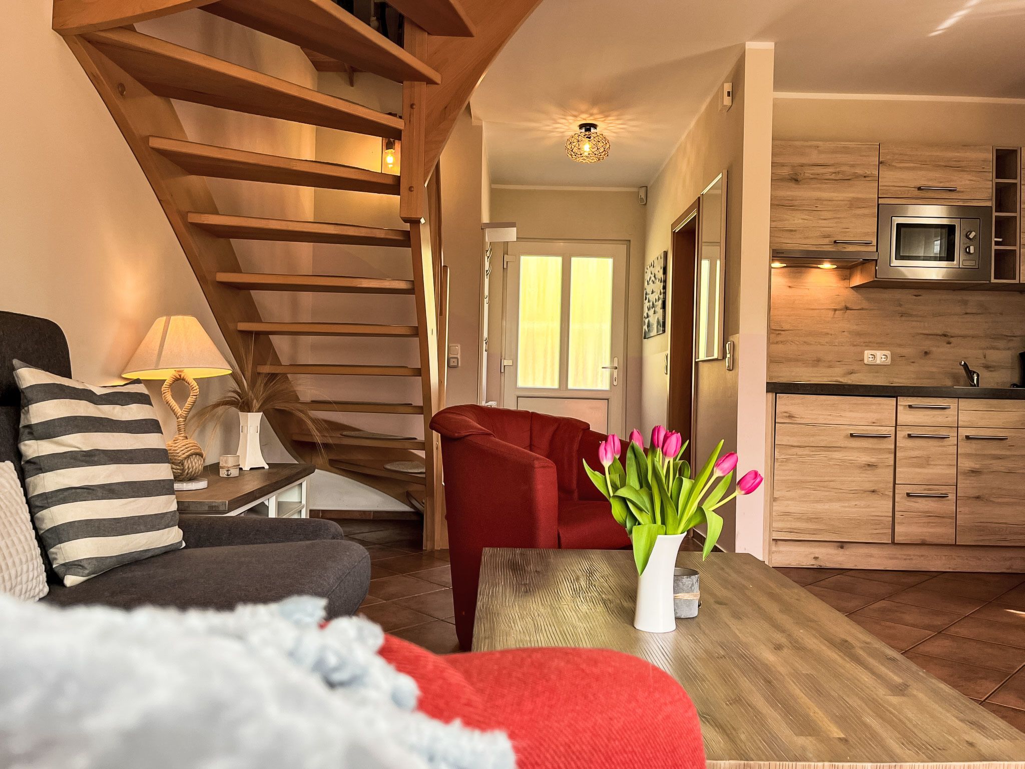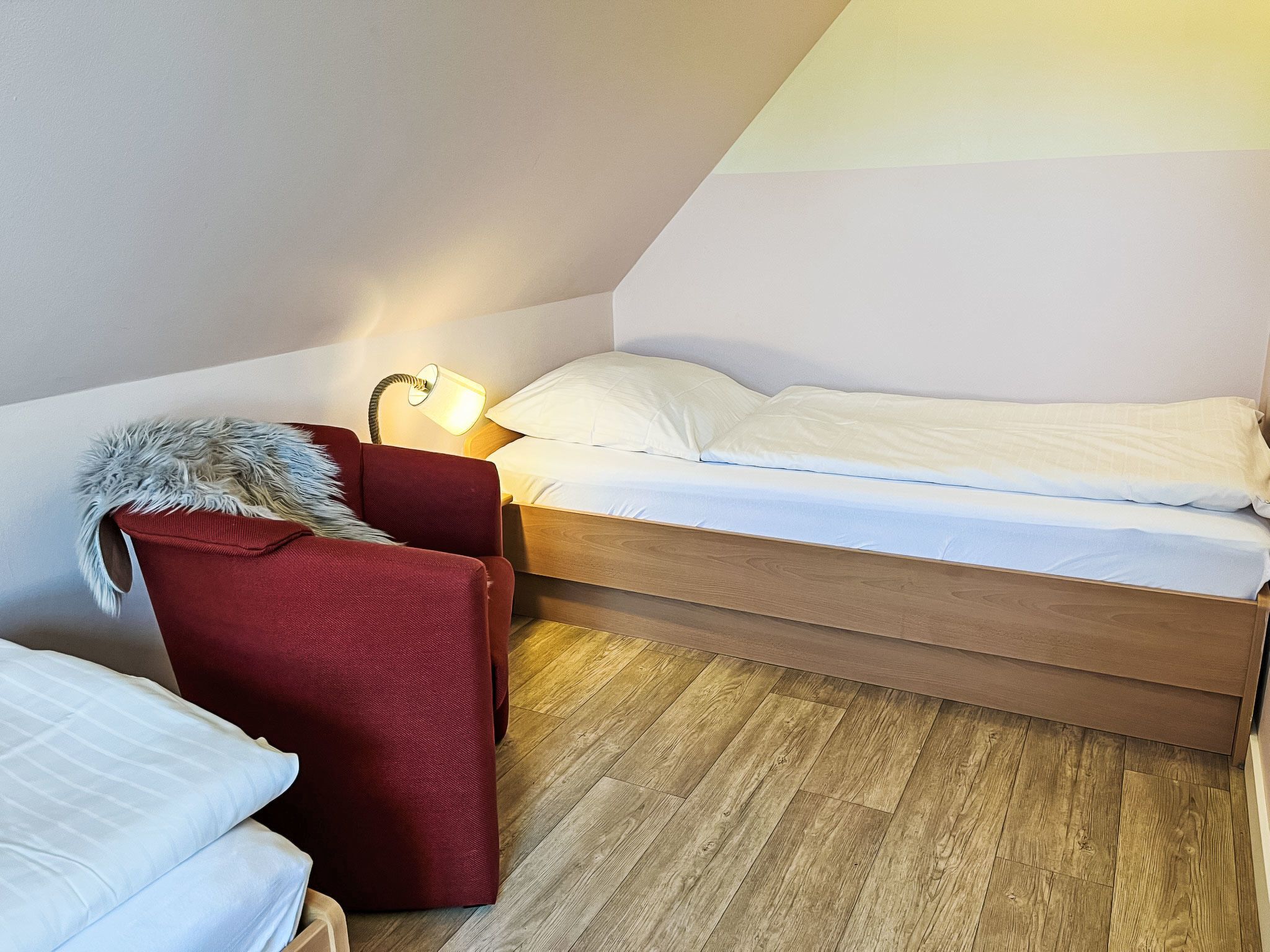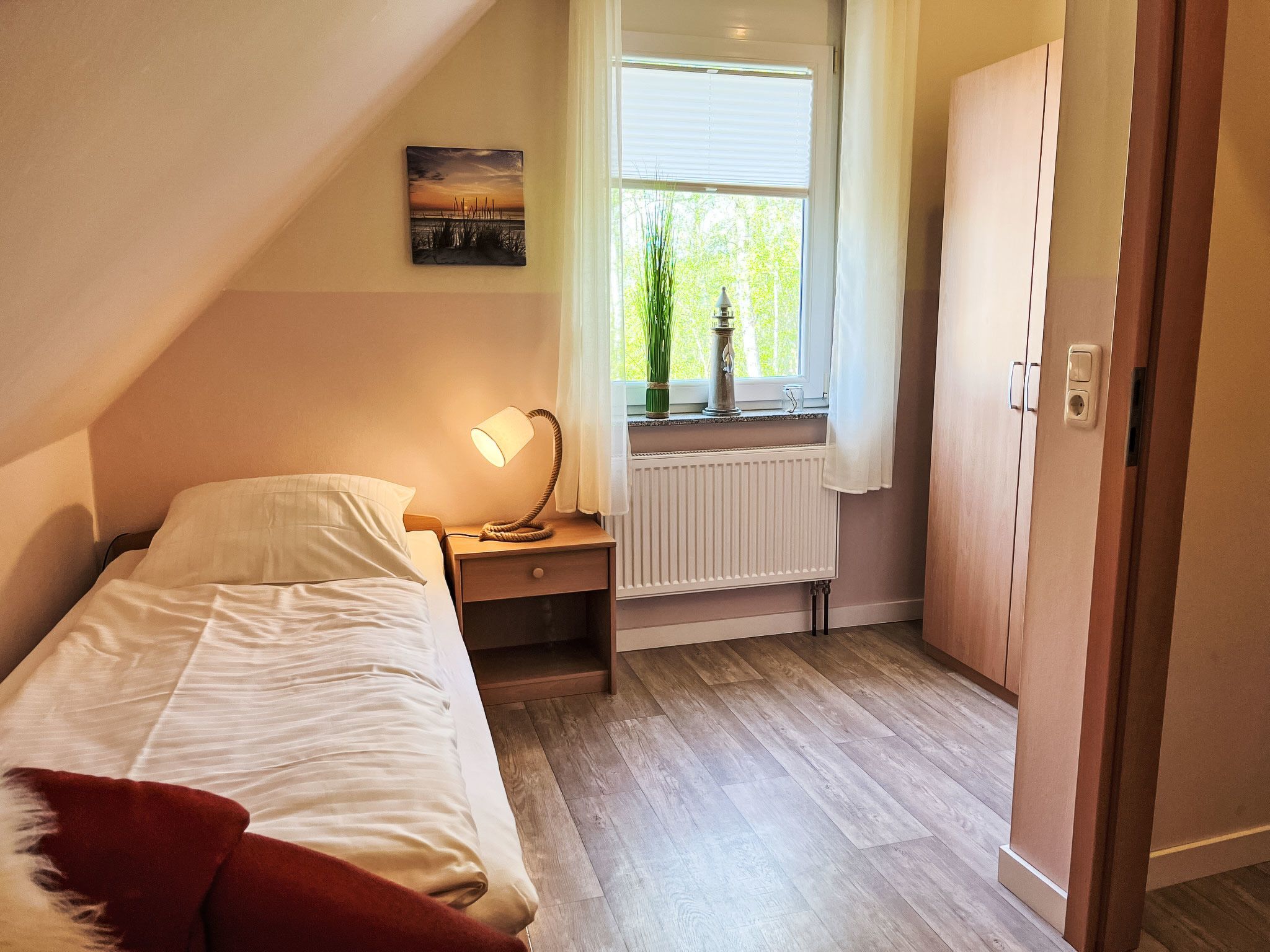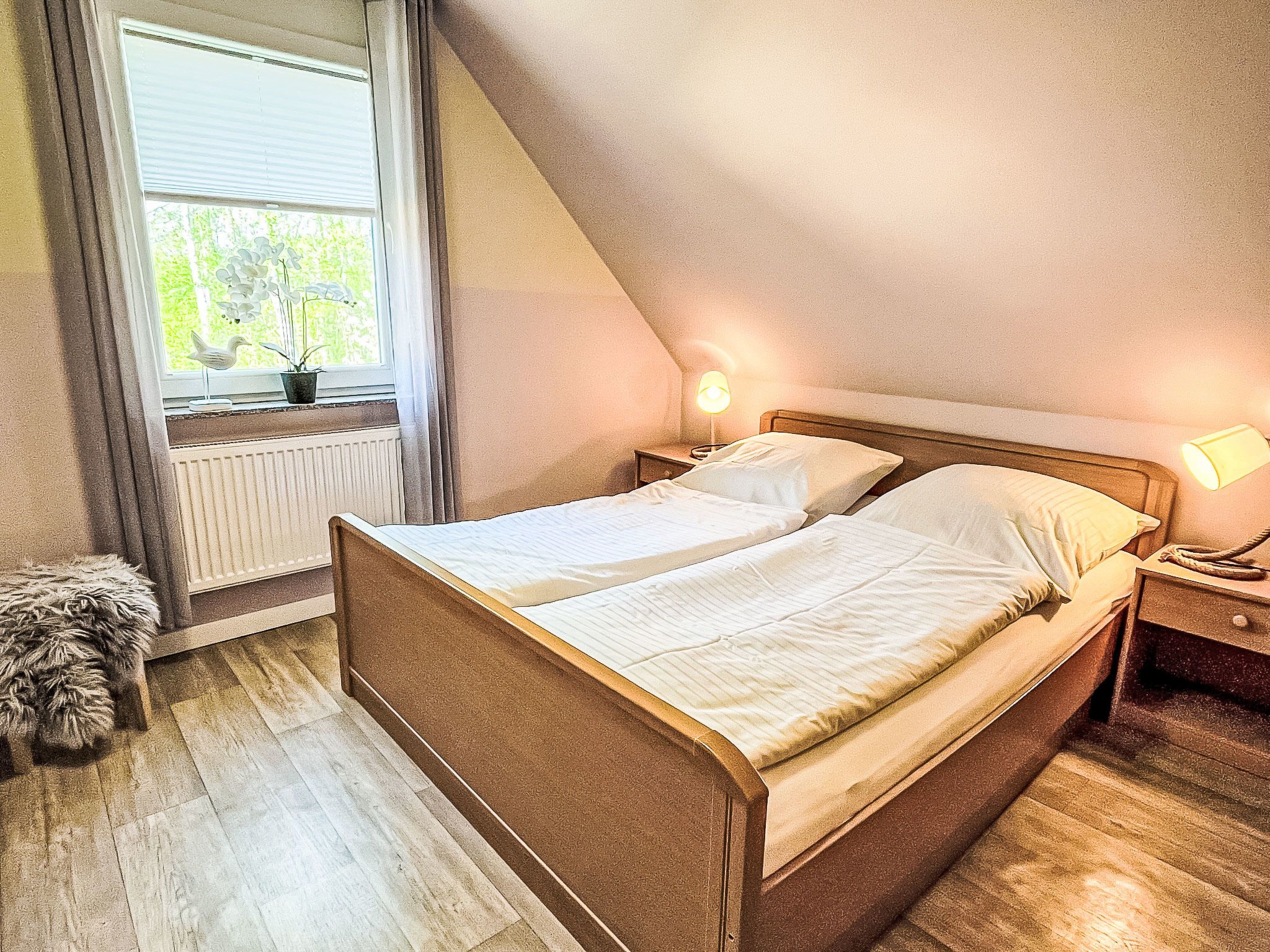 Möwennest + Muschelnest, 6-Zimmer-Haus 120 m2 auf 2 Stockwerken. Schön und geschmackvoll eingerichtet: Wohn-/Esszimmer mit Esstisch, Sat-TV, Radio und CD. Ausgang zur Terrasse. Wohn-/Esszimmer mit Sat-TV, Radio und CD. Ausgang zur Terrasse. Offene Küche (4 Kochplatten, Geschirrspüler, Toaster, Wasserkocher, Mikrowelle, elektrische Kaffeemaschine). 2 Duschen/WC. Obergeschoss: 1 abgeschrägtes Zimmer mit 1 Doppelbett. 1 abgeschrägtes Zimmer mit 2 Betten. 1 abgeschrägtes Zimmer mit 1 Doppelbett. 1 abgeschrägtes Zimmer mit 2 Betten. G-Heizung. Terrasse 8 m2 teilweise überdacht. Terrassenmöbel. Zur Verfügung: Kinderhochstuhl, Babybett (extra). Internet (Wireless LAN, gratis). Bitte beachten: Nichtraucher-Haus. Maximal 2 Haustiere/Hunde erlaubt. Rauchmelder. Keine interne Verbindung zwischen den separaten Wohneinheiten. Jede der beiden getrennten Wohneinheiten verfügt über eine Küche.