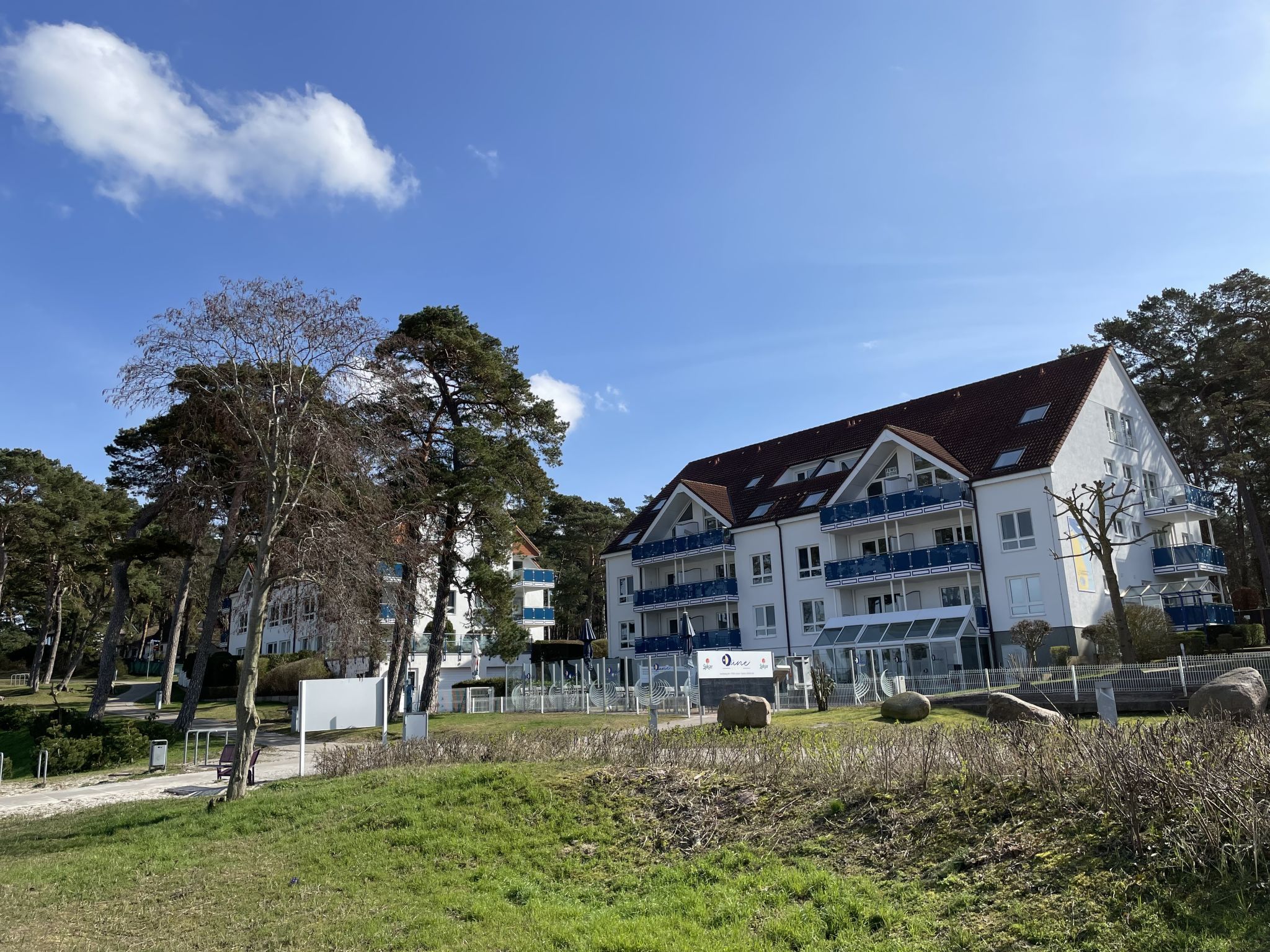 Ferienanlage Blaumuschel. 3 Häuser in der Residenz. 30 Wohnungen in der Residenz. 1 km vom Zentrum von Lubmin, am Ortsrand, 12 km vom Zentrum von Greifswald, 50 km vom Zentrum von Stralsund, 50 m vom Meer, 30 m vom Strand, direkter Zugang zum Strand. Im Hause: Empfang, Restaurant, Einstellraum für Fahrräder, Zentralheizung. Parkplatz (beschränkte Anzahl). Supermarkt 1 km, Bushaltestelle Lubmin Seebad 1.2 km, Sandstrand 30 m. Alle Häuser/Wohnungen sind individuell eingerichtet. Fahrradabstellmöglichkeit beim Haus vorhanden.