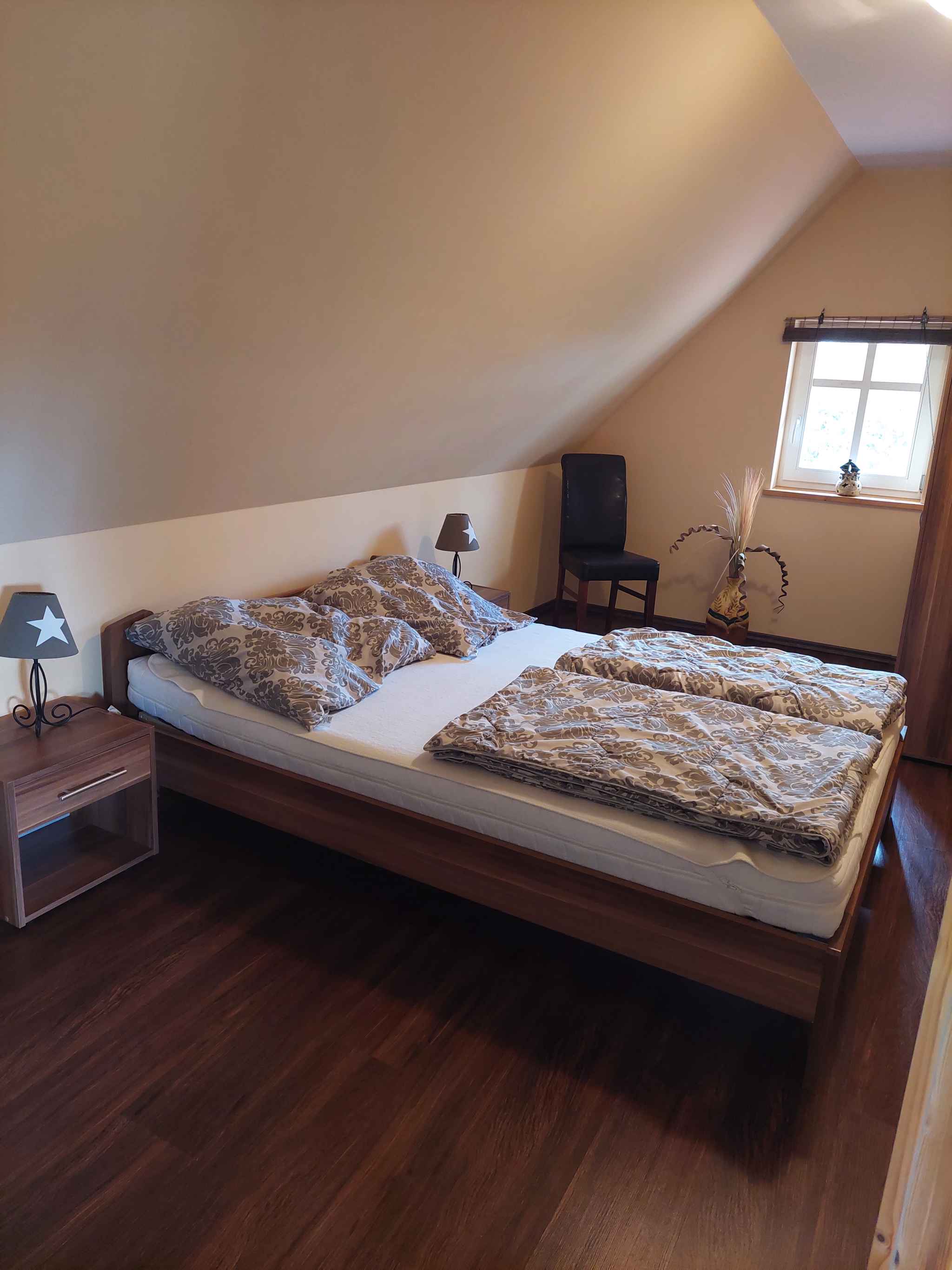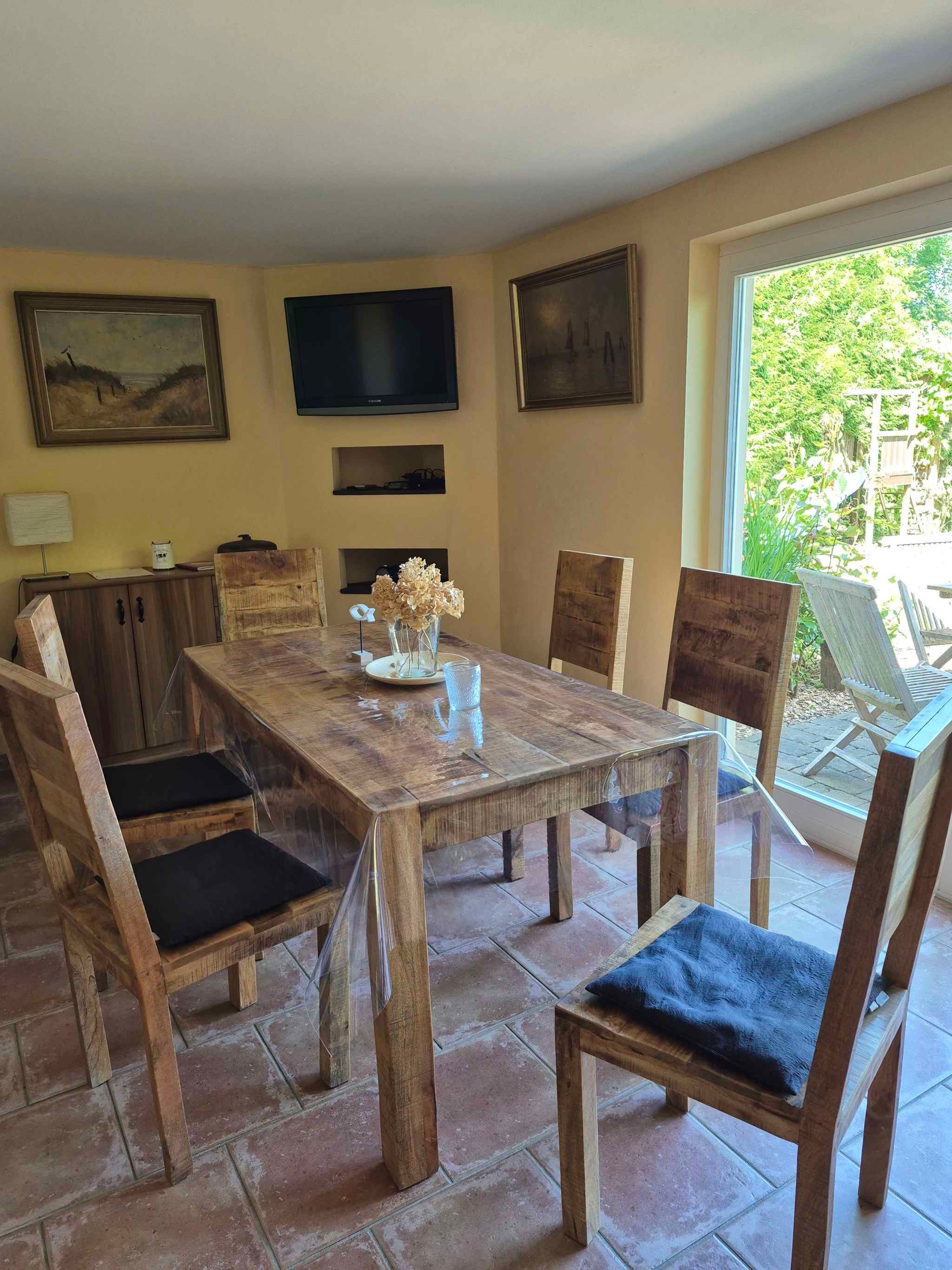 Ihr Ferienhaus hat 2 Etagen, 3 Zimmer (davon 2 Schlafzimmer), ist 80 qm groß und ist für maximal 6 Personen geeignet. Das Rauchen ist in Innenräumen nicht gestattet. Kaminofen unten, dieser heizt die gesamte Wohnung! Der Eingang führt über die 16 qm große Terrasse direkt in die Wohnküche. Die Zimmer teilen sich wie folgt auf:Erdgeschoss: Wohnküche mit Sitzecke, Essecke, TV und CD. Die Essecke bietet Platz für 6 Personen. Küche in der Wohnküche mit Geschirrspüler, Elektroherd (4 Platten), Backofen, Kühlschrank (Eisfach), Kaffeemaschine, Toaster und elektrischem Wasserkocher. Bad mit Dusche, 1 Waschbecken, WC und Fenster. Dachgeschoss: Schlafzimmer mit 3 Einzelbetten. Schlafzimmer mit 1 Doppelbett. Darüber hinaus ist Ihr Ferienhaus mit Kinderstuhl ausgestattet. TV- bzw. Rundfunksender können per Satellit empfangen werden. Babyreisebett und Kinderstuhl bitte bei Buchung reservieren.