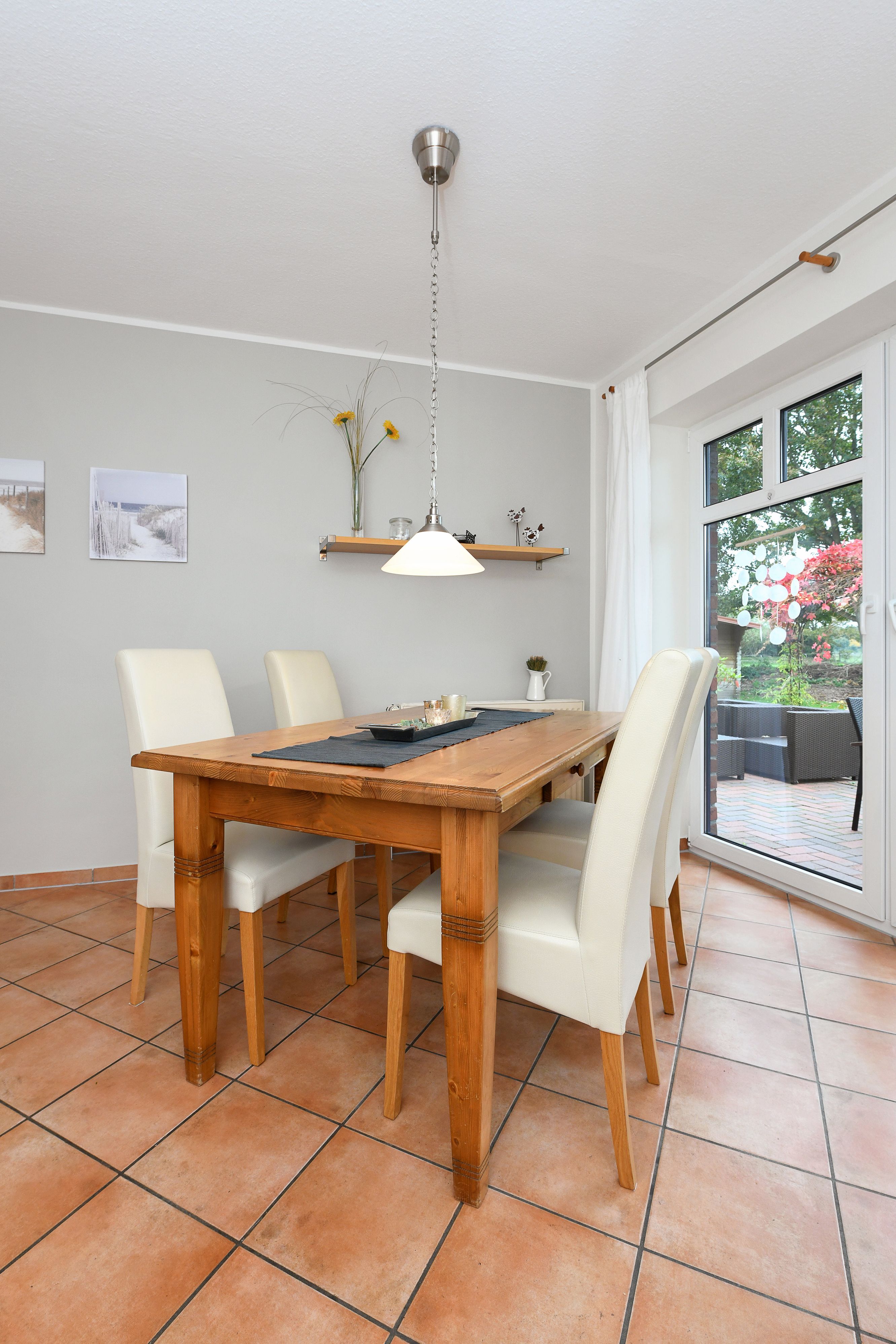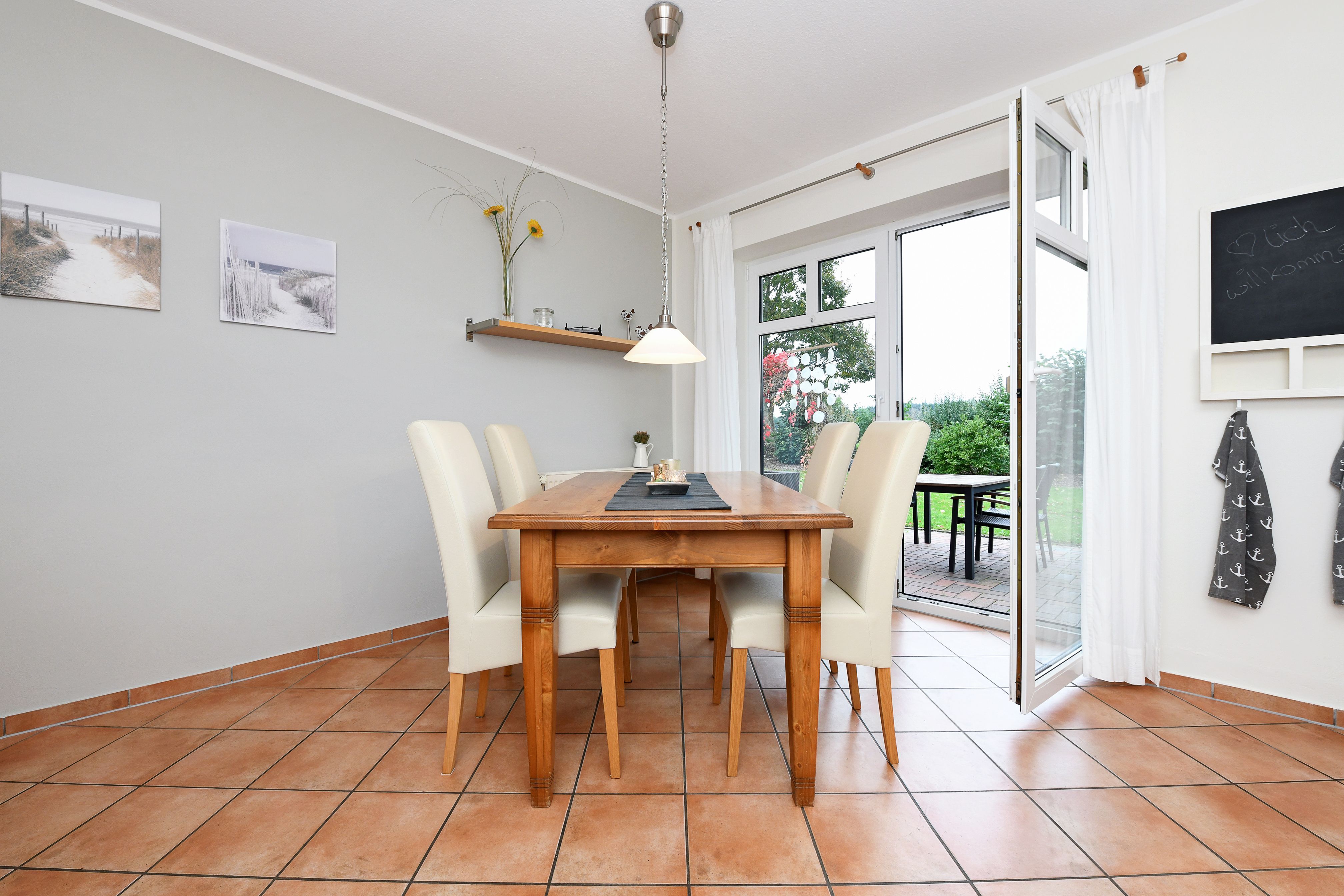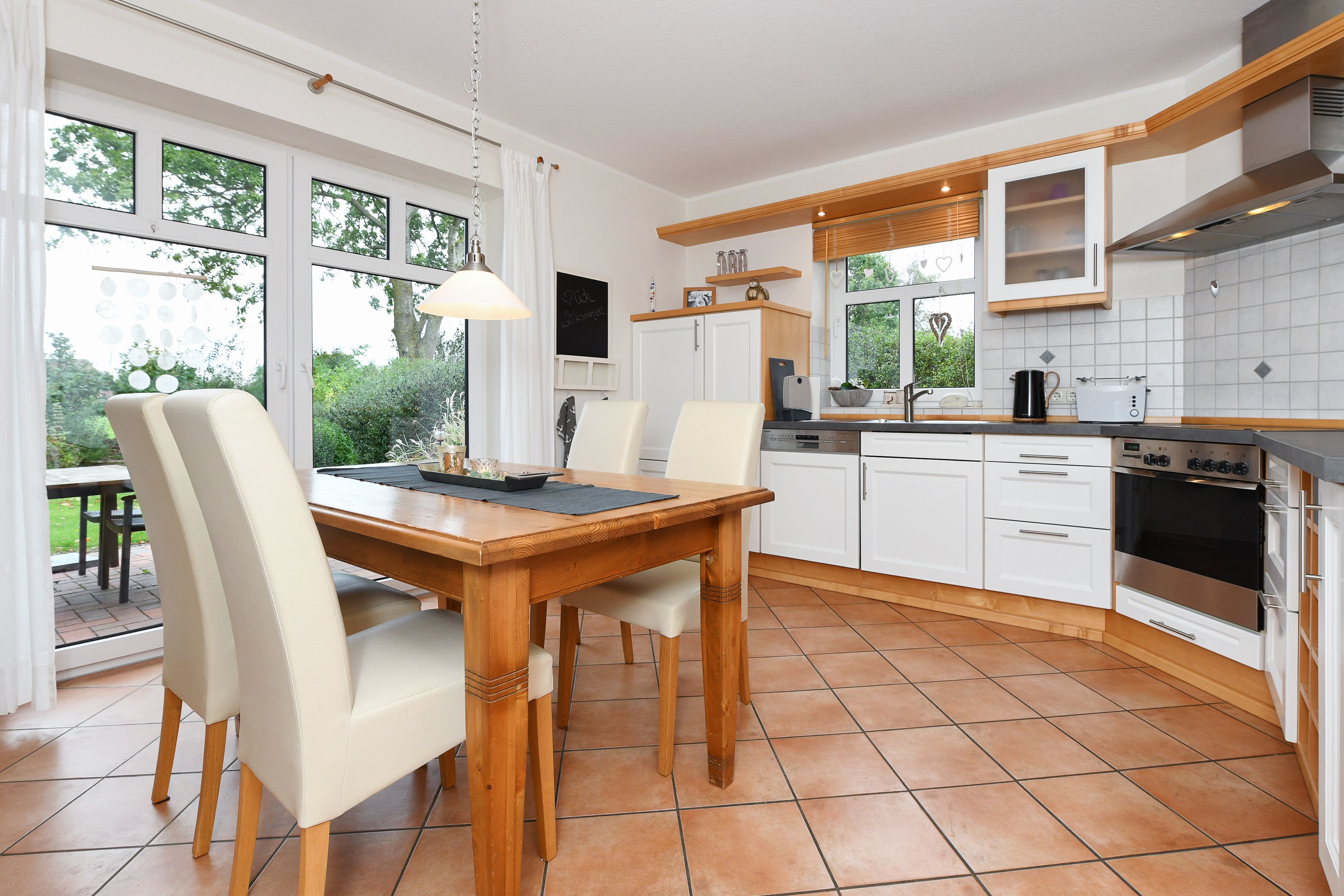 Im ganzen Haus liegt Parkett bzw. sind Fliesen oder Laminat gelegt. Der Garten mit der großen möblierten Terrasse ist eingezäunt und damit für Kinder optimal geeignet.