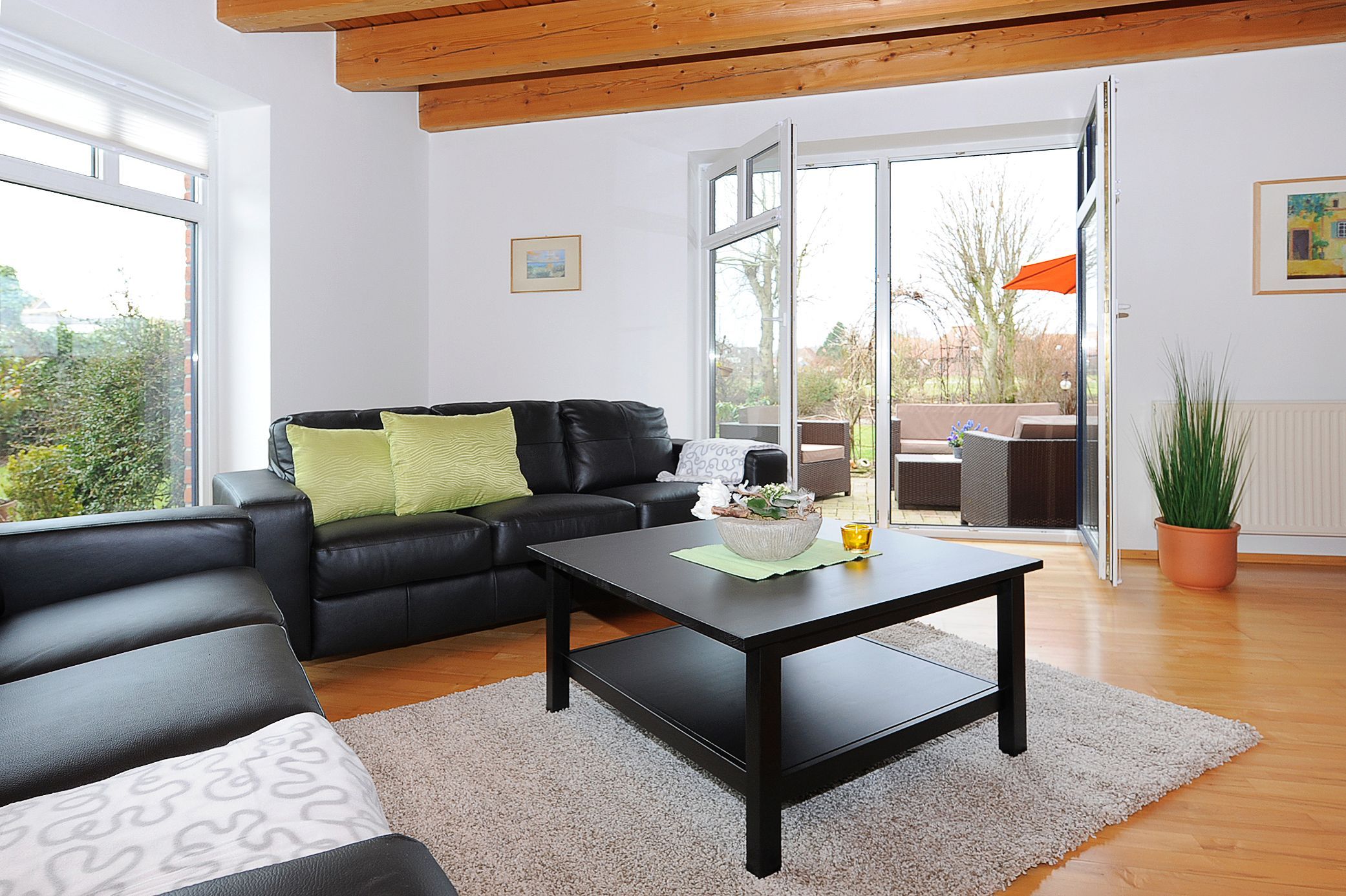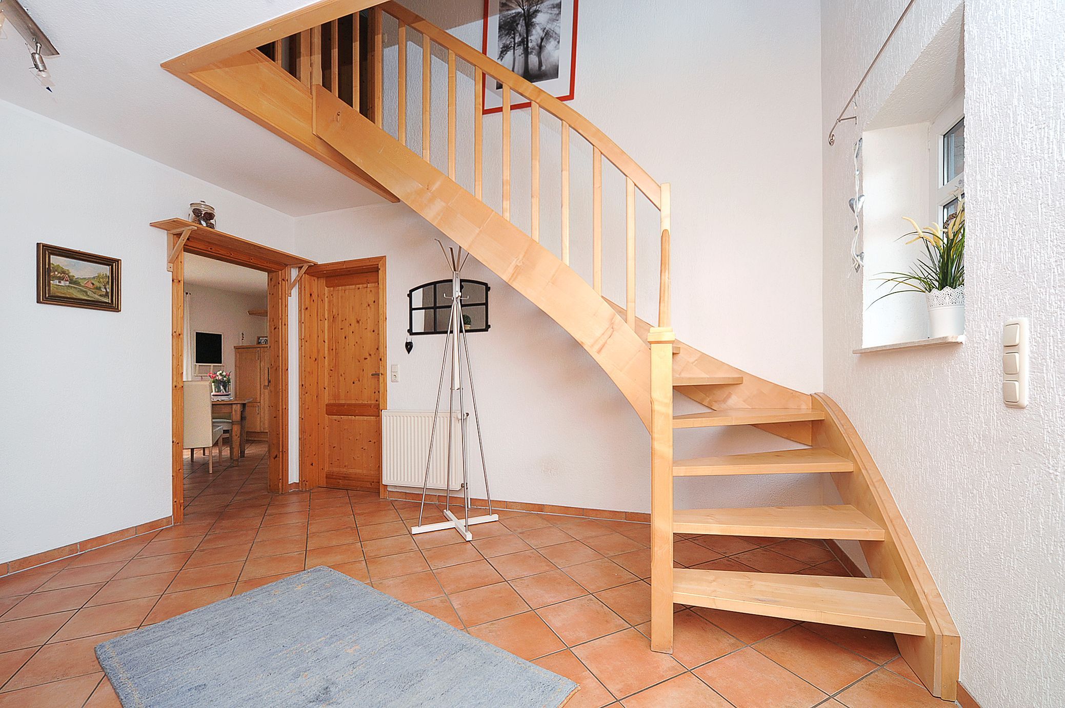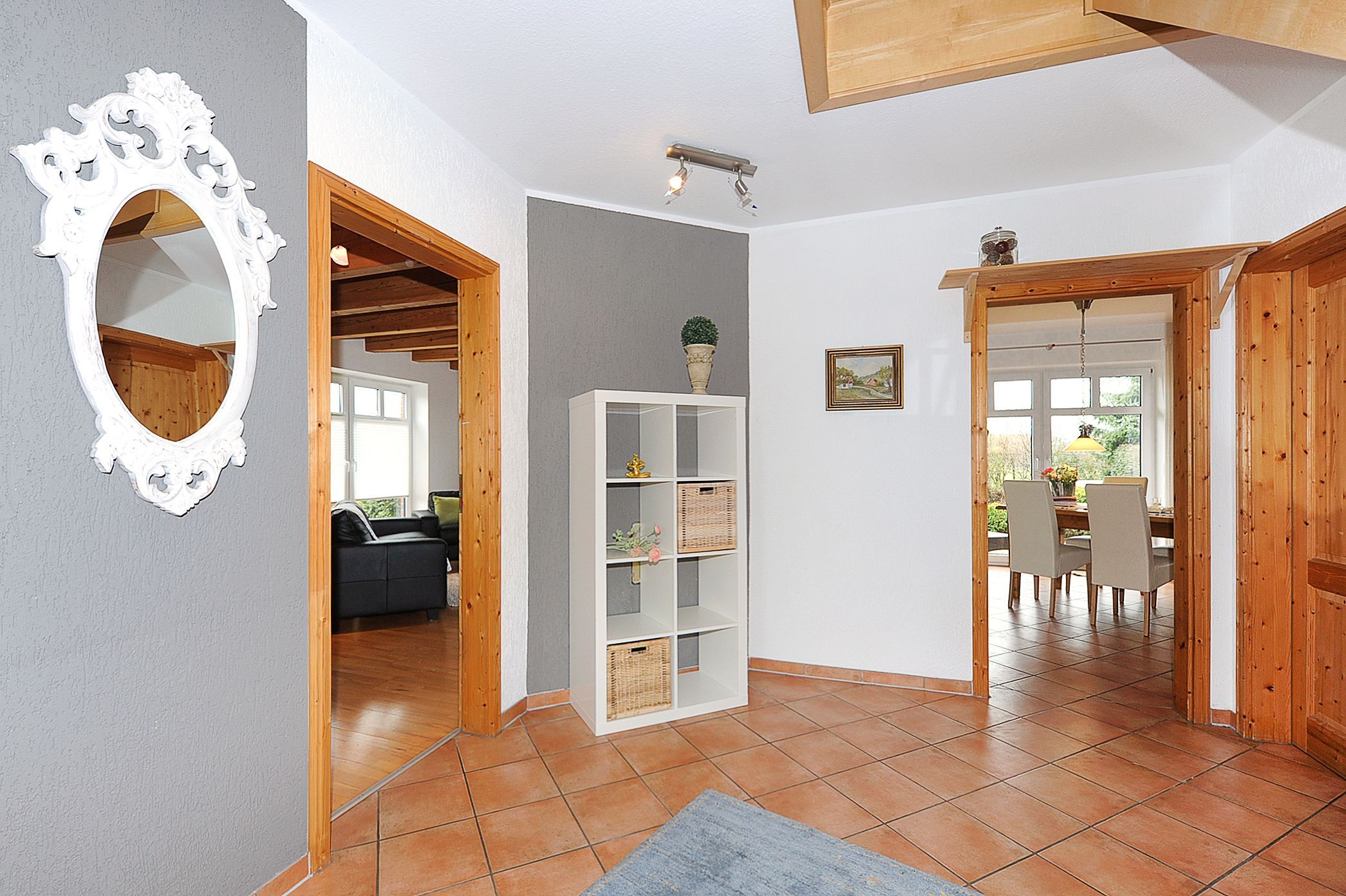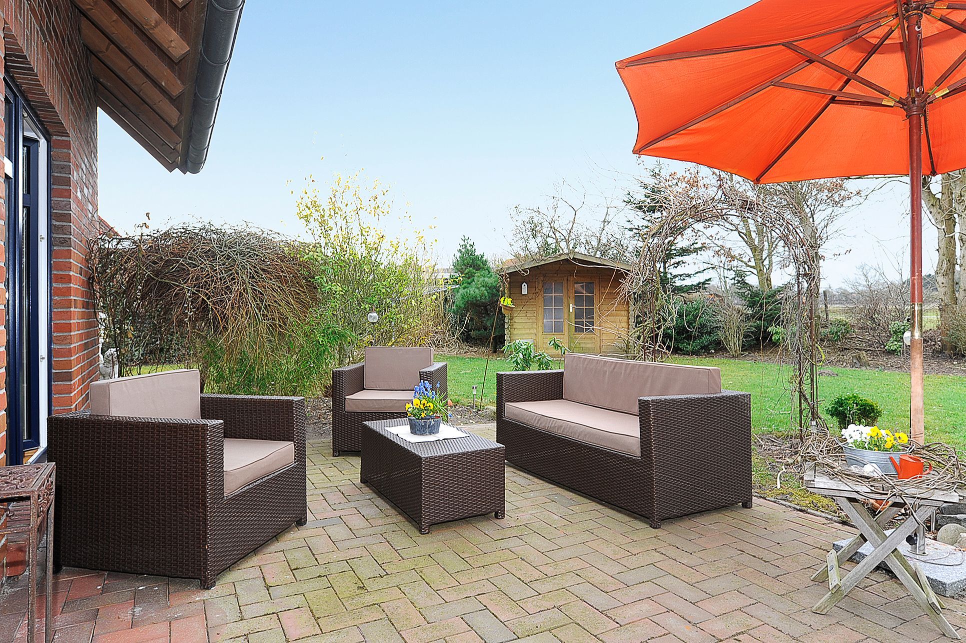 Im ganzen Haus liegt Parkett bzw. sind Fliesen oder Laminat gelegt. Der Garten mit der großen möblierten Terrasse ist eingezäunt und damit für Kinder optimal geeignet.