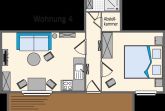 * Schlafzimmer, Wohn/ Essraum mit Couch, Esstisch, Küchenzeile mit Ceranfeld, Backofen und Geschirrspüler.