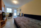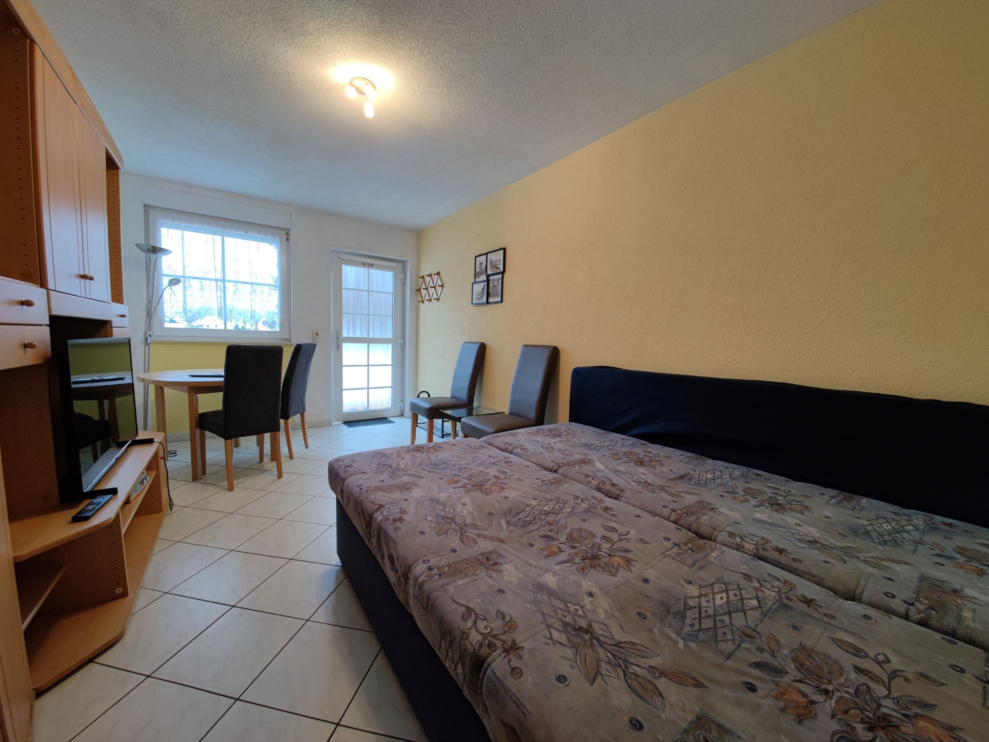 1-Zimmer-Wohnung 25 m², im Erdgeschoss. Zweckmässig eingerichtet: Wohn-/Schlafzimmer mit Doppelbett, Esstisch, Sat-TV und Radio. Ausgang zur Terrasse. Küche (Backofen, Geschirrspüler, 4 Glaskeramikherd Platten, Toaster, Wasserkocher, Mikrowelle, Tiefkühler, elektrische Kaffeemaschine). Dusche/WC. Fussbodenheizung. Zur Verfügung: Internet (Wireless LAN, gratis). Parkplatz (1 Auto) in 25 m.