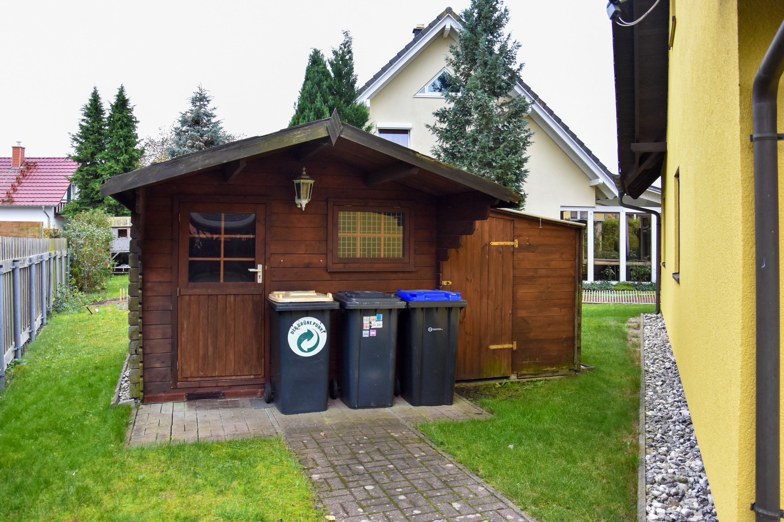 Im Außenbereich des Hauses gibt es ein Abstellhäuschen, Spielwiese, 1 Doppelcarport, sowie 2 weitere Pkw-Parkmöglichkeiten auf dem ca. 500 qm großen Grundstück.