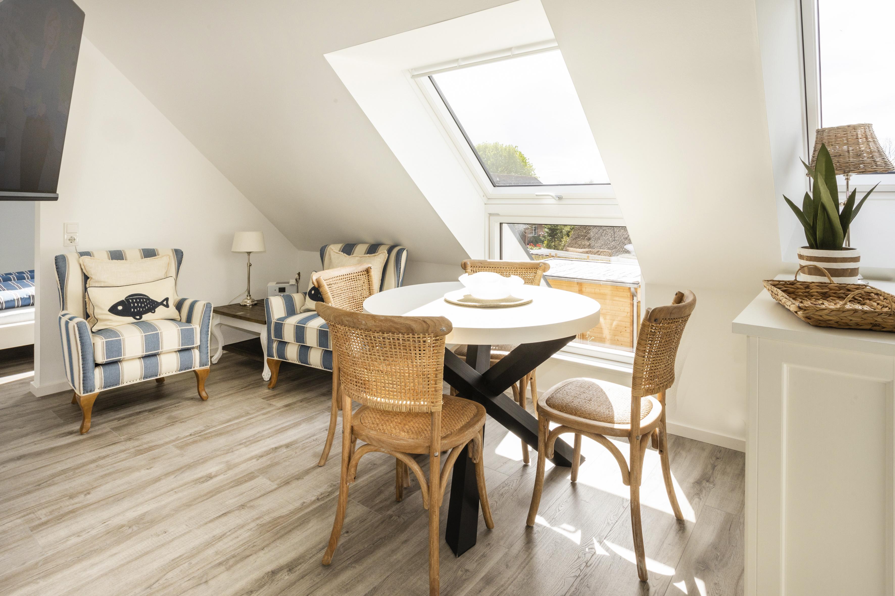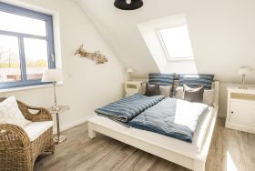 Das Appartement 4 liegt im Ober- und Dachgeschoss und ist perfekt ausgestattet für bis zu 4 Personen, es wurde einfach an alles gedacht. Im Obergeschoss finden Sie den Wohnbereich mit moderner Küchenzeile, ein Schlafzimmer mit Doppelbett sowie das Badezimmer mit Dusche/WC. Über eine Treppe erreichen Sie das zweite Schlafzimmer mit zwei Einzelbetten im Dachgeschoss. Liebevoll sind die Betten bei Anreise bezogen und Handtücher liegen bereit für einen erholsamen Urlaub von Anfang an. Wlan ist im ganzen Haus vorhanden.