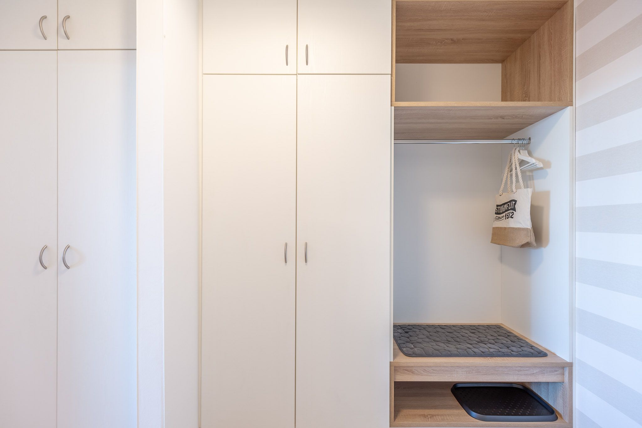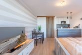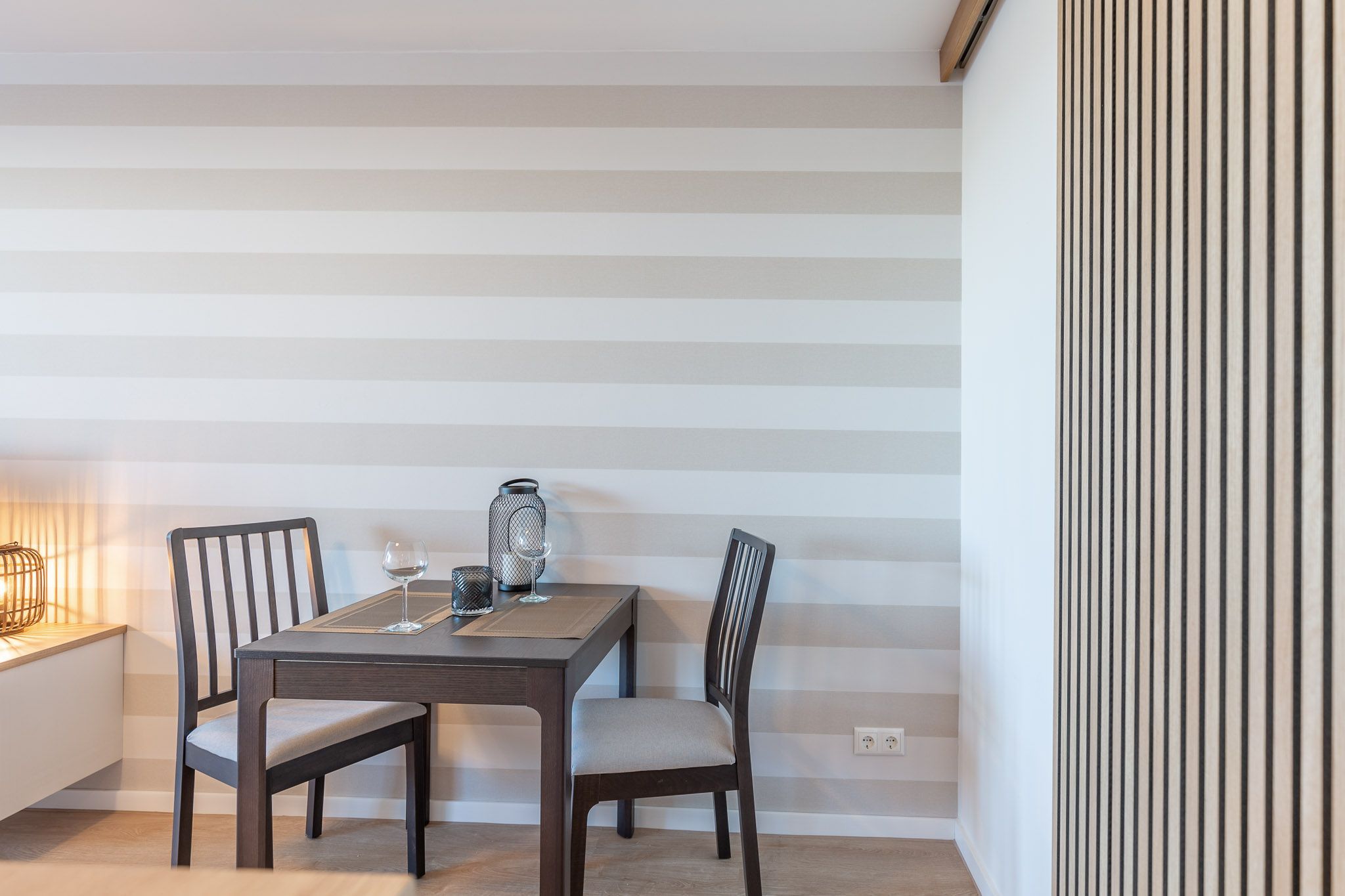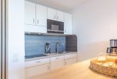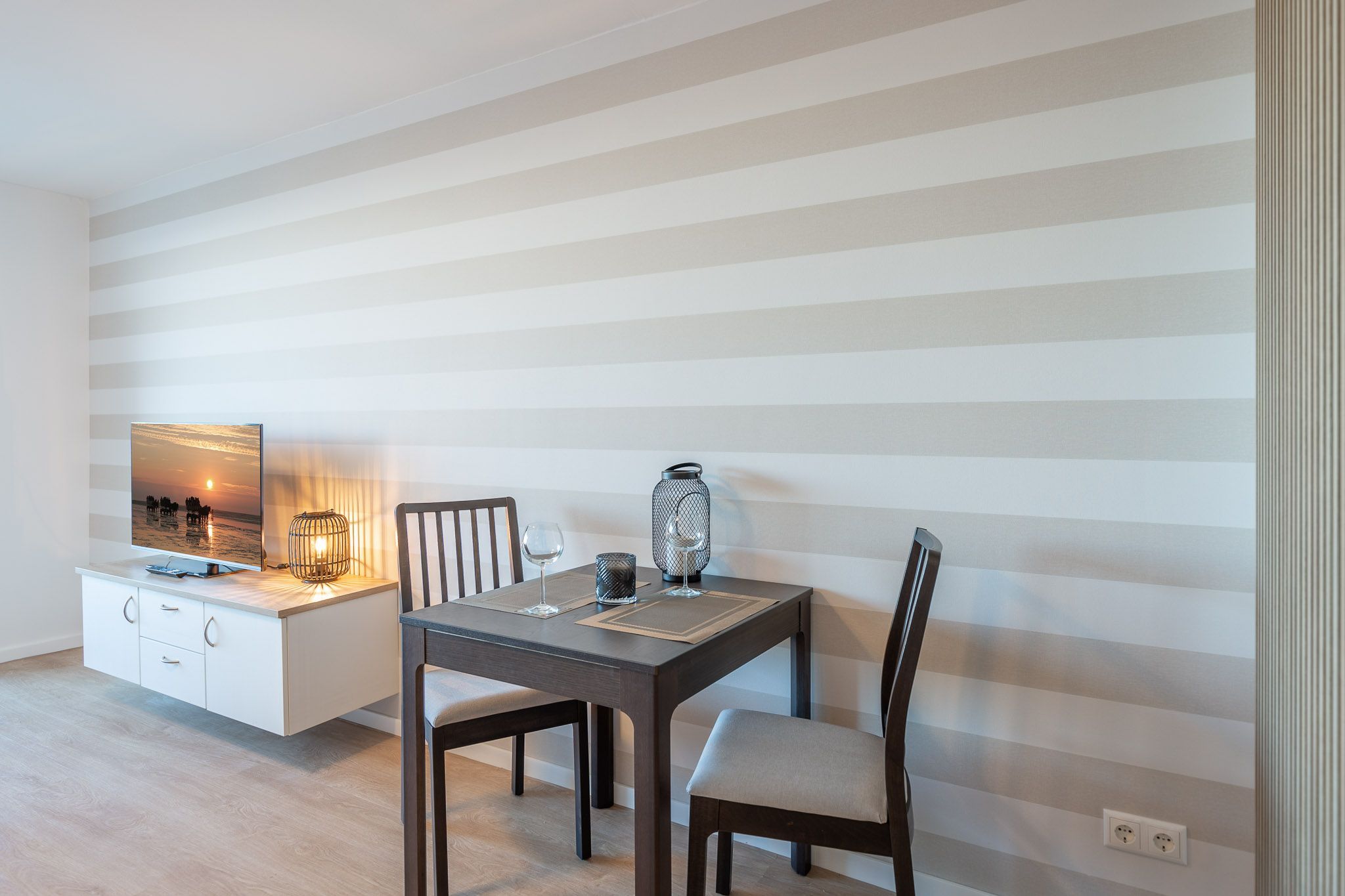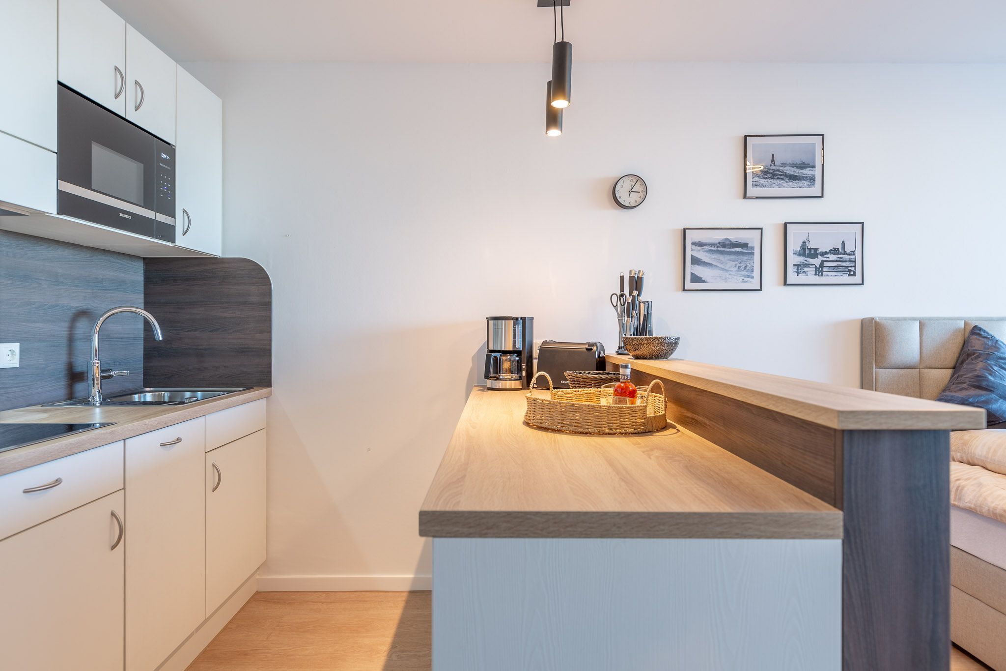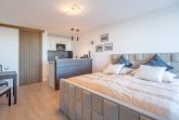 Klein, aber fein! Die 35 m² Ferienwohnung ist schlicht, modern, handfest mit allem, was es für einen erholsamen Urlaub braucht. Nicht mehr und nicht weniger. Gediegene Farben treffen auf klares Design und warme Holztöne. Und mittendrin: Da steht ein gemütliches Doppelbett in Komfortliegehöhe mit Wohlfühlfaktor und Blick auf den Deich. Ein Smart TV sorgt dafür, dass Sie auch im Urlaub nicht auf Ihre Lieblingsserie verzichten müssen. Dank kostenlosem WLAN können Sie Urlaubsfotos direkt mit Freunden teilen.