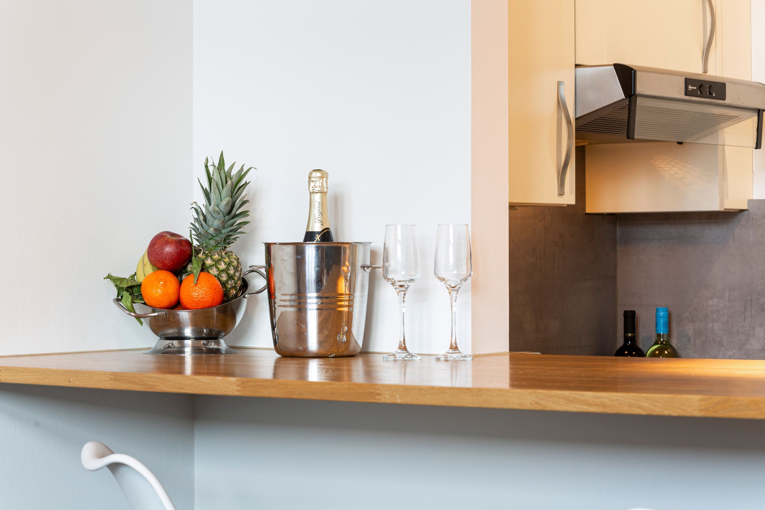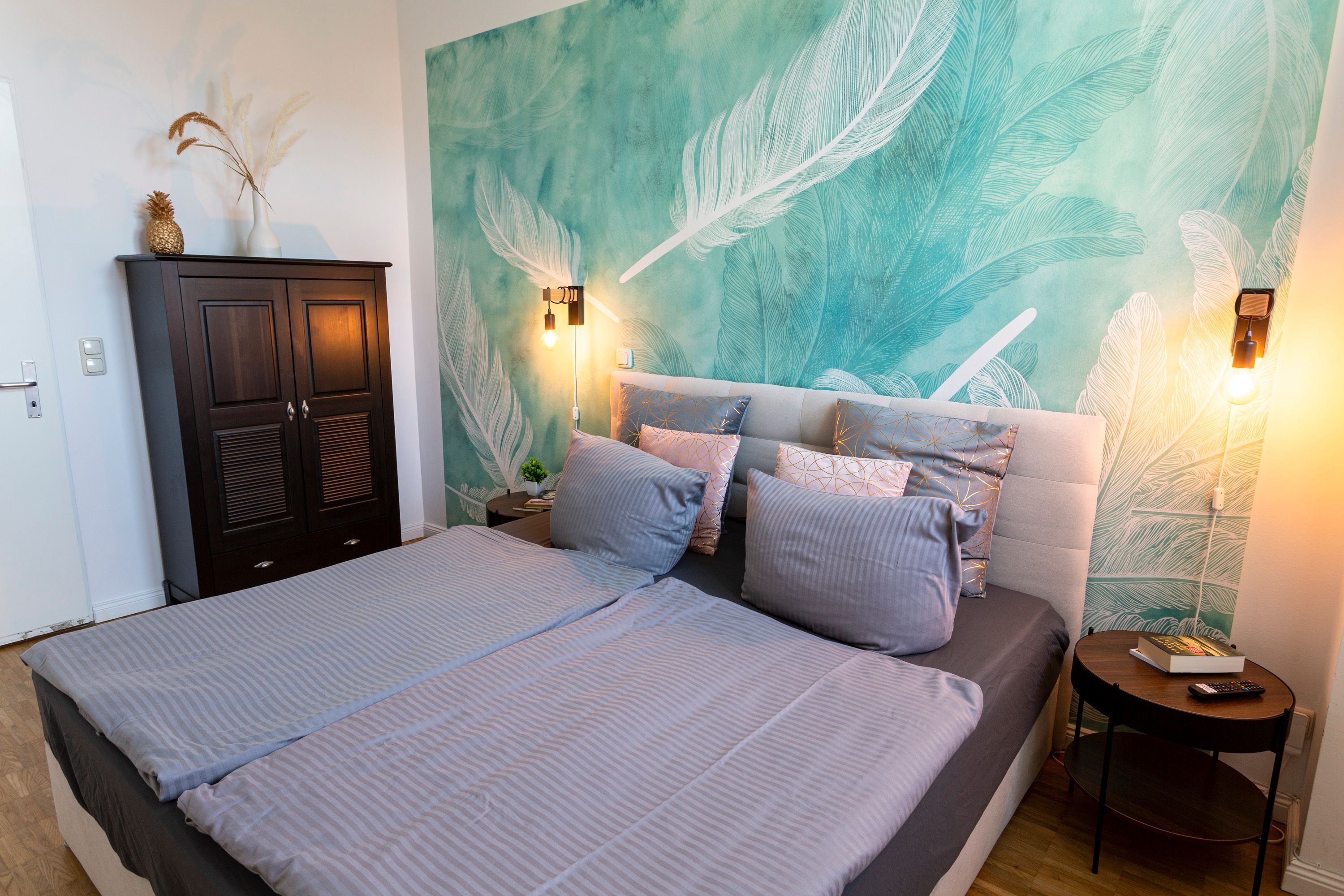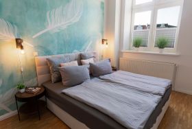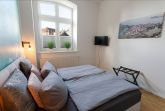 Das Altstadt-Studio 5 erreichen sie direkt über den Eingang am Neuen Markt und ist für bis zu 4 Personen geeignet. Die 56 m² große Ferienwohnung befindet sich im Erdgeschoss des Hauses und ist über eine Treppe zugänglich. Vom geräumigen Flur aus, gelangen die in das Schlafzimmer mit Doppelbett (180x200), das Bad mit Dusche, Waschbecken und WC, das Gäste-WC und das große Wohnzimmer mit offener Küche. Die Küche ist mit einem Kühlschrank, Herd, Backofen und Geschirrspüler ausgestattet. Küchenhelfer, wie Wasserkocher, Toaster und Kaffeemaschine sind ebenfalls vorhanden. Des Weiteren befinden sich ebenfalls ein Tresen und Esstisch direkt an der Küche. Auf dem Schlafsofa (140x200) können sie bequem Fernsehen oder entspannen. Das Wohnzimmer und Schlafzimmer sind zum Neuen Markt ausgerichtet und lassen viel Licht in die hellen Zimmer.