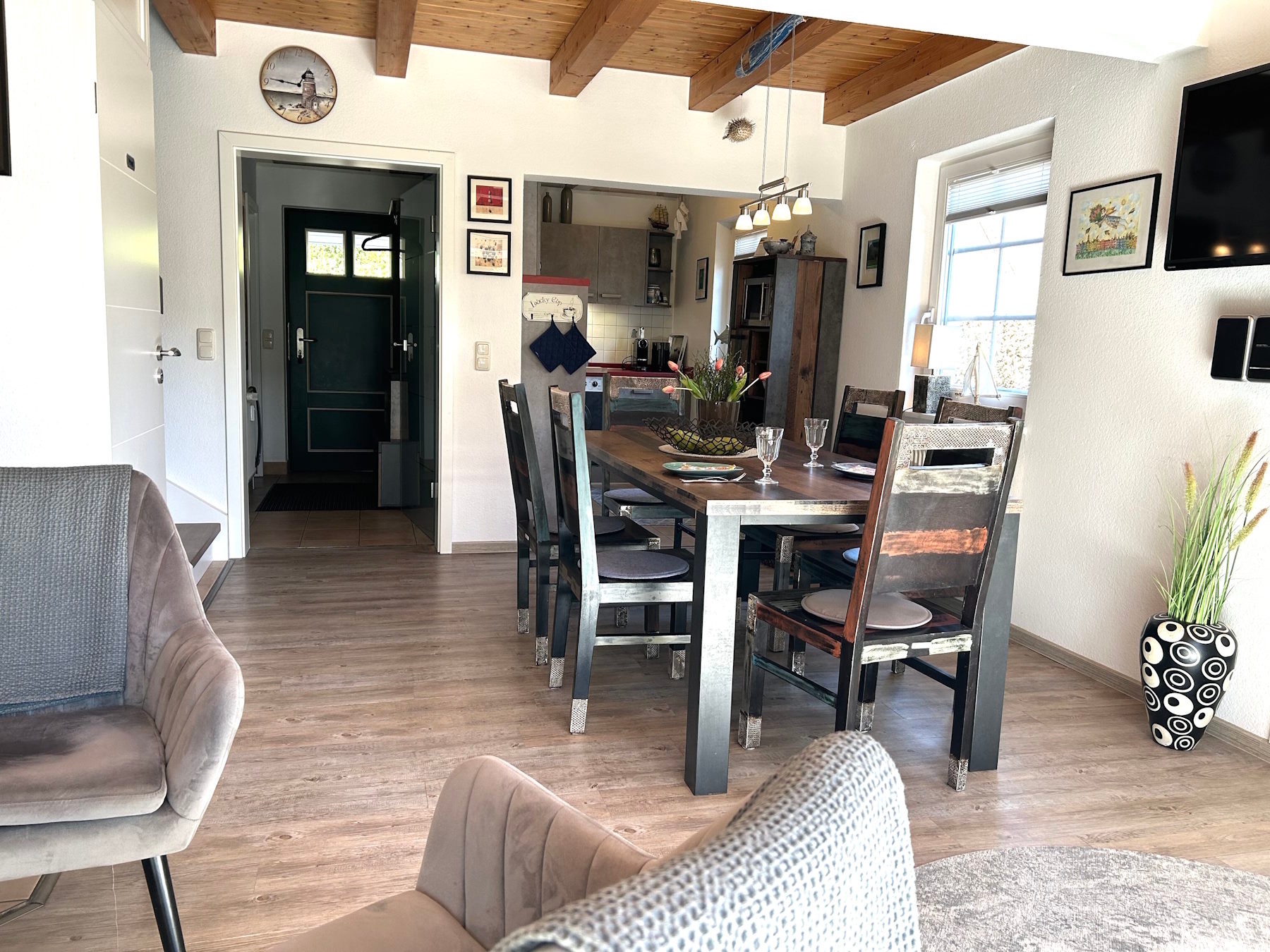 Zum Nordstrand laufen Sie ca. 7 Minuten und in 2 Minuten sind Sie im Darßwald. Das Haus ist modern eingerichtet, hat eine moderne Küche, 3 Schlafzimmer und 2 Bäder (eines mit Sauna), im Wohnzimmer einen Kamin, eine Süd-Terrasse, die in den gemeinschaftlichen Garten mündet. Dort befinden sich ein paar Spielgeräte und ein Grillplatz. Ein Parkplatz ist ebenfalls am Haus.