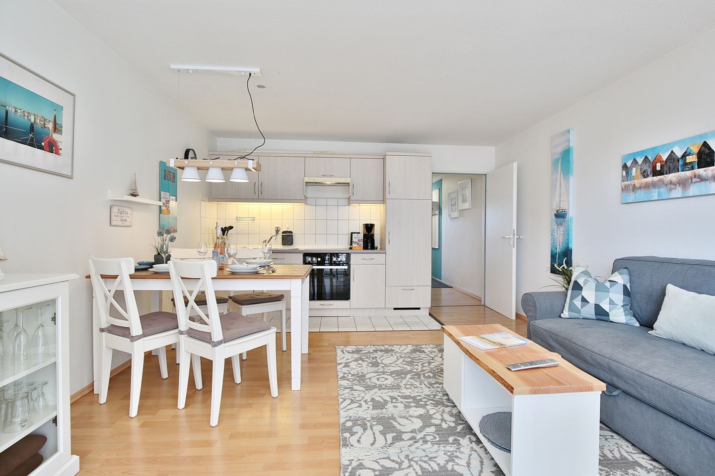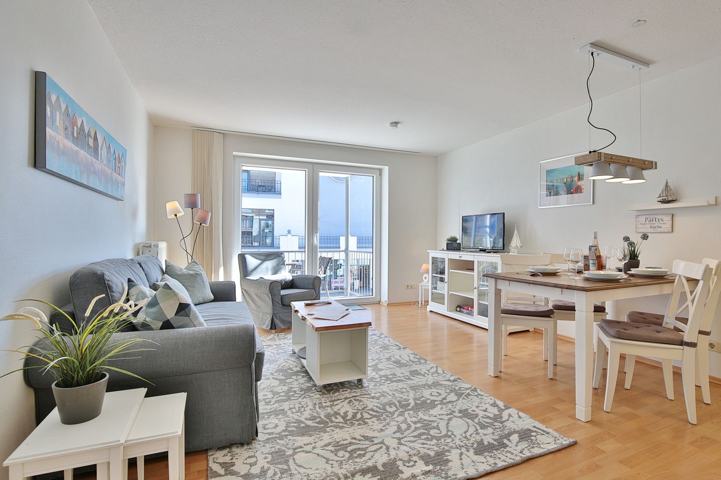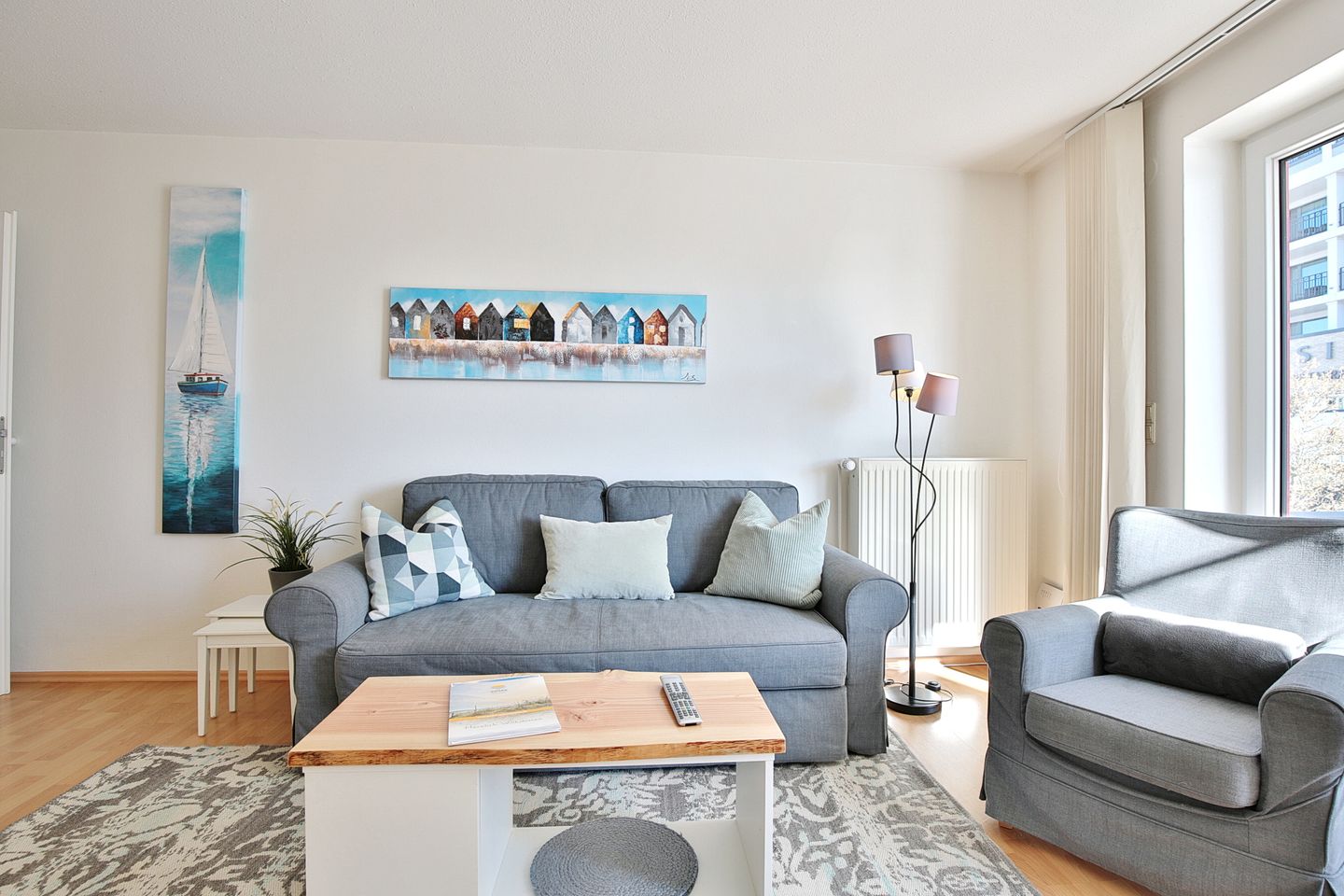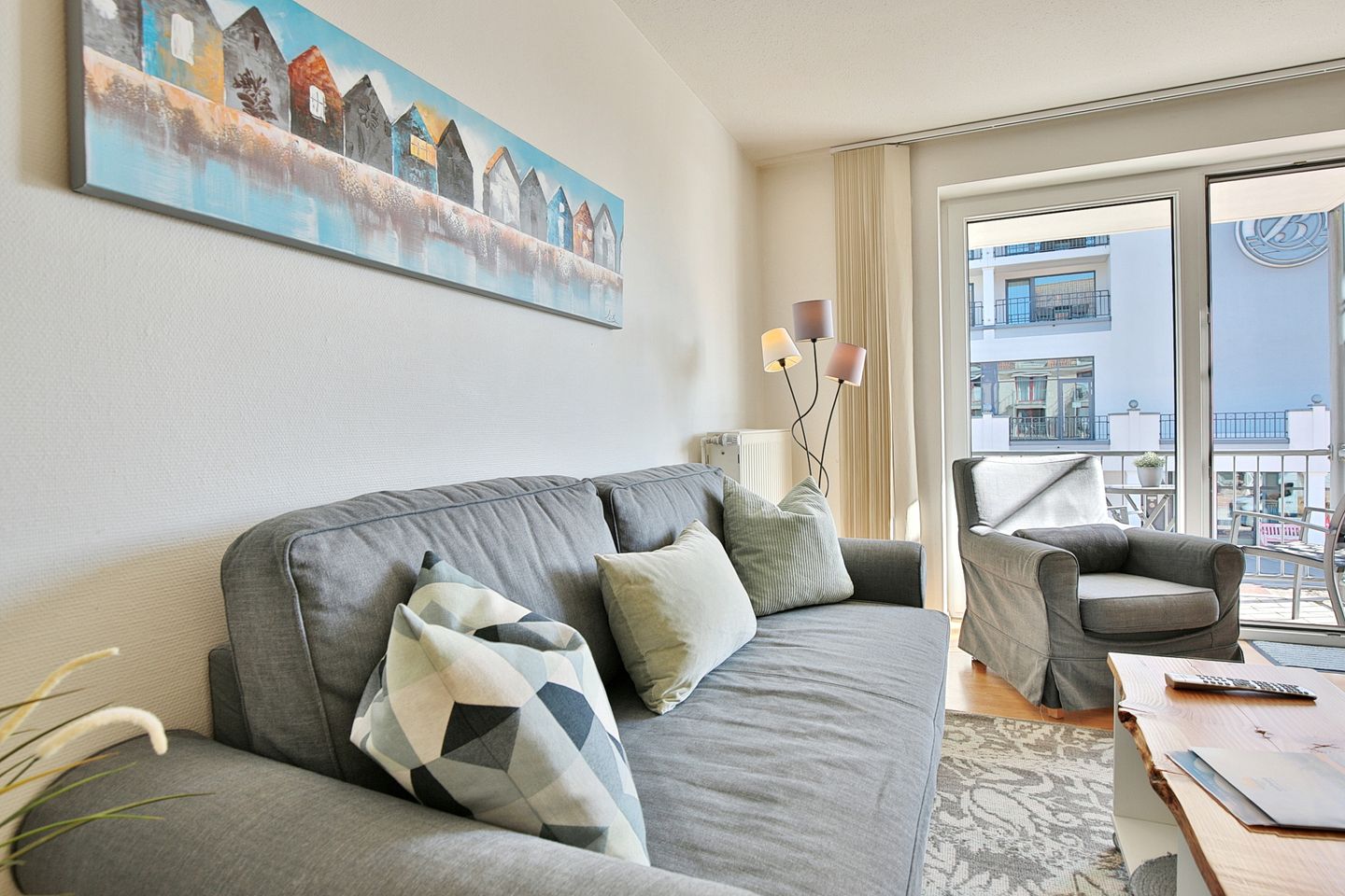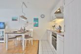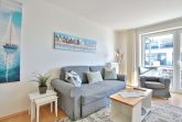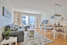 Die 2 Zimmer-Wohnung befindet sich im 1. Obergeschoss und bietet Platz für bis zu 4 Personen. Der lichtdurchflutete und modern eingerichtete Wohn- Schlafraum ist mit einer bequemen Doppelbettcouch (1,40 x 2,00 m) Flachbildfernseher, DVD-Player, Stereoanlage mit CD-Player ausgestattet. Von hier aus gelangen Sie auf den Ostbalkon mit Blick auf die Dünenmeile mit seitlichem Seeblick.