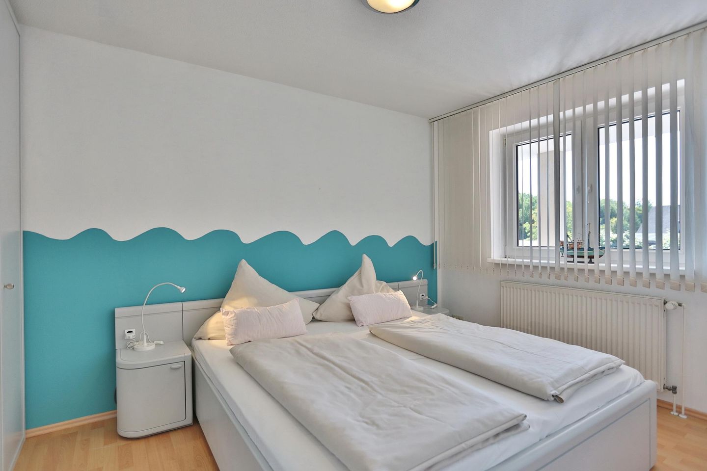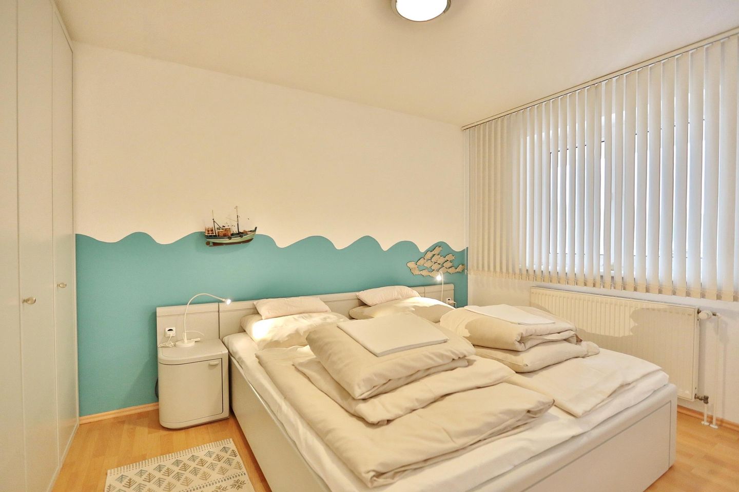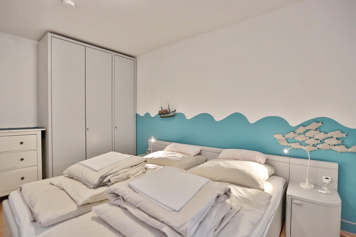 Die 2 Zimmer-Wohnung befindet sich im 1. Obergeschoss und bietet Platz für bis zu 4 Personen. Der lichtdurchflutete und modern eingerichtete Wohn- Schlafraum ist mit einer bequemen Doppelbettcouch (1,40 x 2,00 m) Flachbildfernseher, DVD-Player, Stereoanlage mit CD-Player ausgestattet. Von hier aus gelangen Sie auf den Ostbalkon mit Blick auf die Dünenmeile mit seitlichem Seeblick.