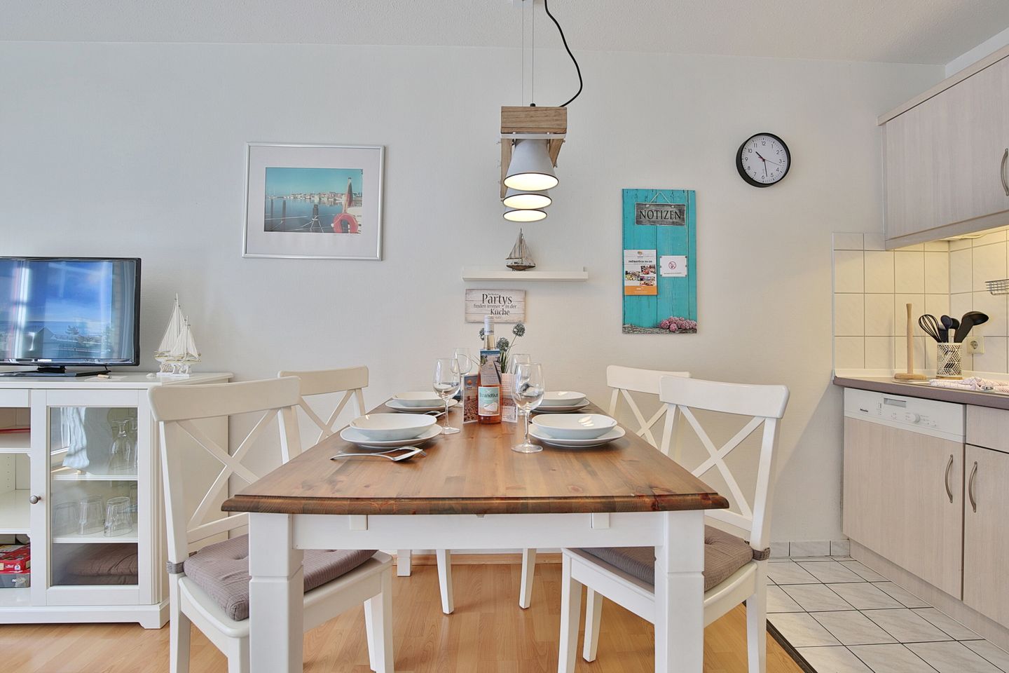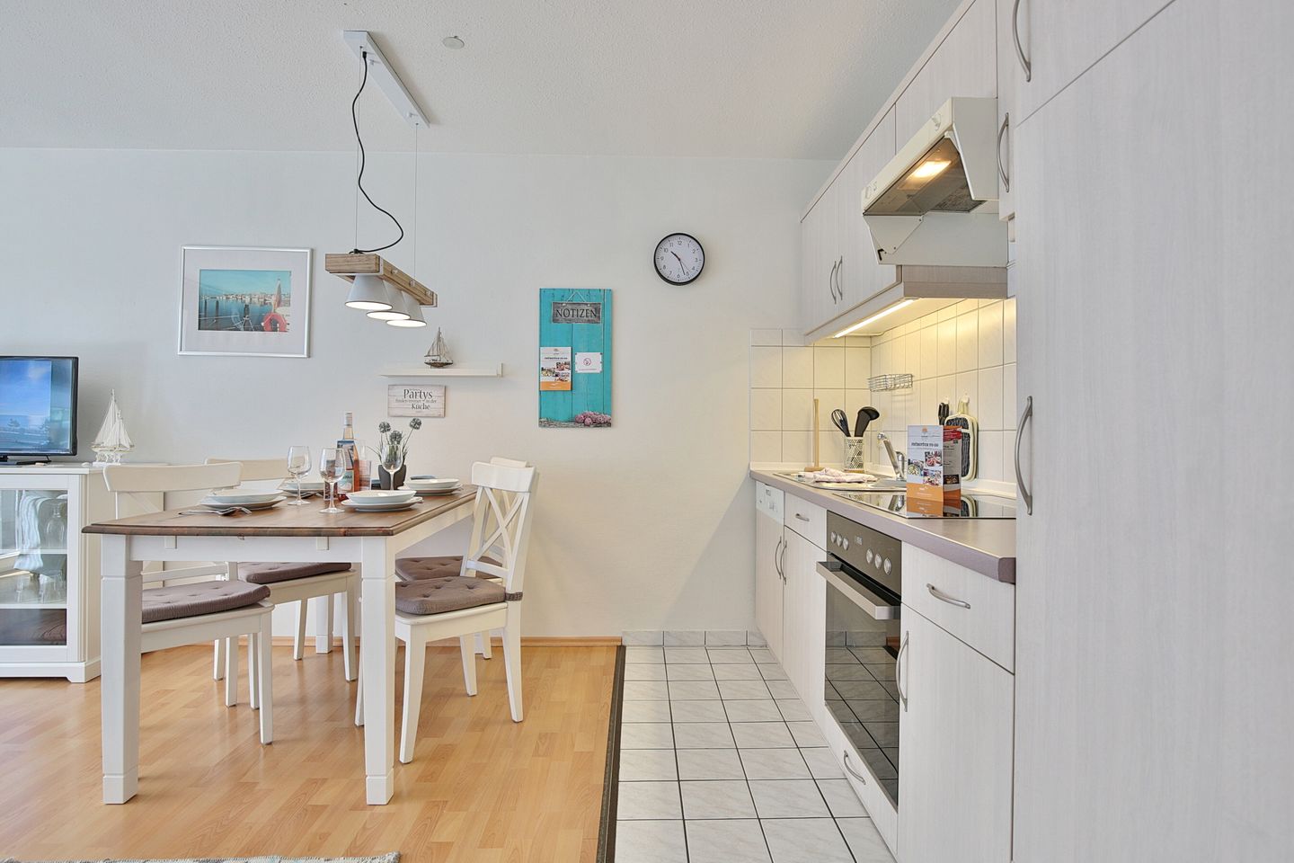 Die moderne, integrierte Küchenzeile ist ausgestattet mit Mikrowelle, Geschirrspüler, 4 Platten-Herd (Cerankochfeld) und Backofen und Essplatz für 4 Personen.
