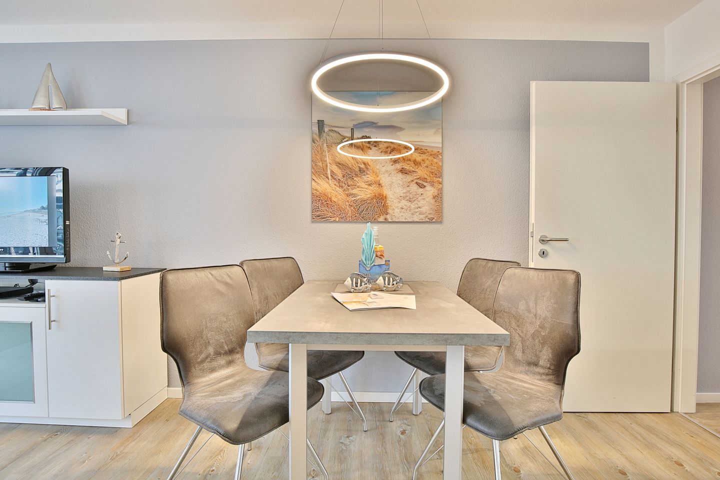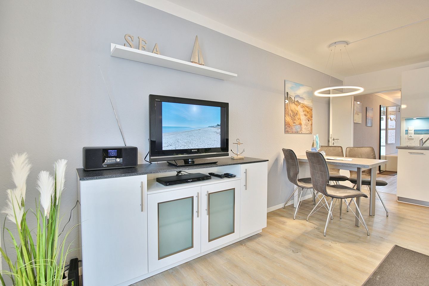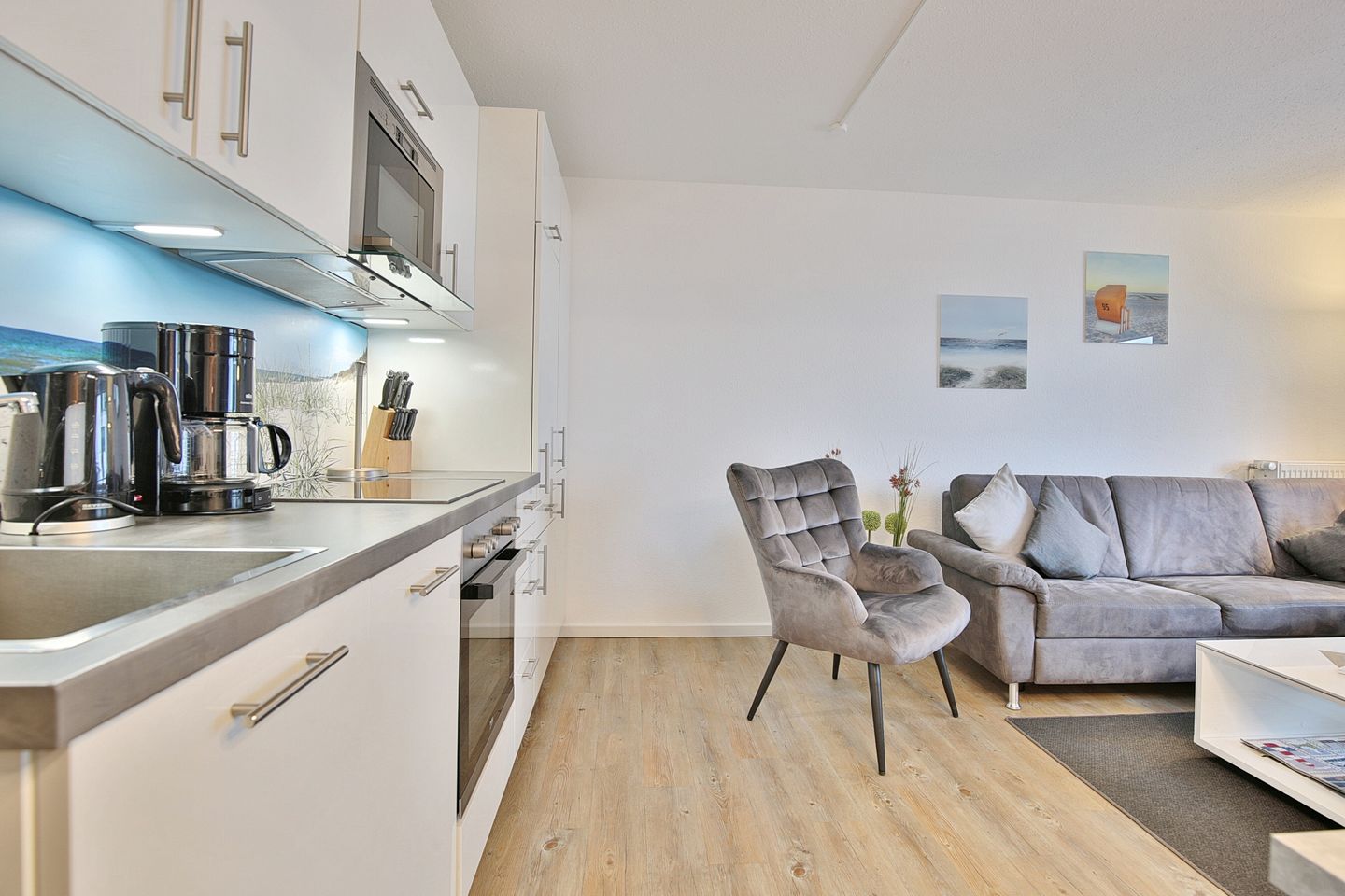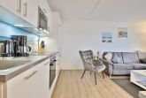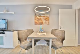 Der modern gestaltete Wohnraum verfügt über eine exklusive Einrichtung mit komfortabler Doppelbettcouch (1,60 x 2,00 m) sowie einem Flachbild- TV, CD und DVD- Player, die für gute Urlaubsstimmung sorgen.