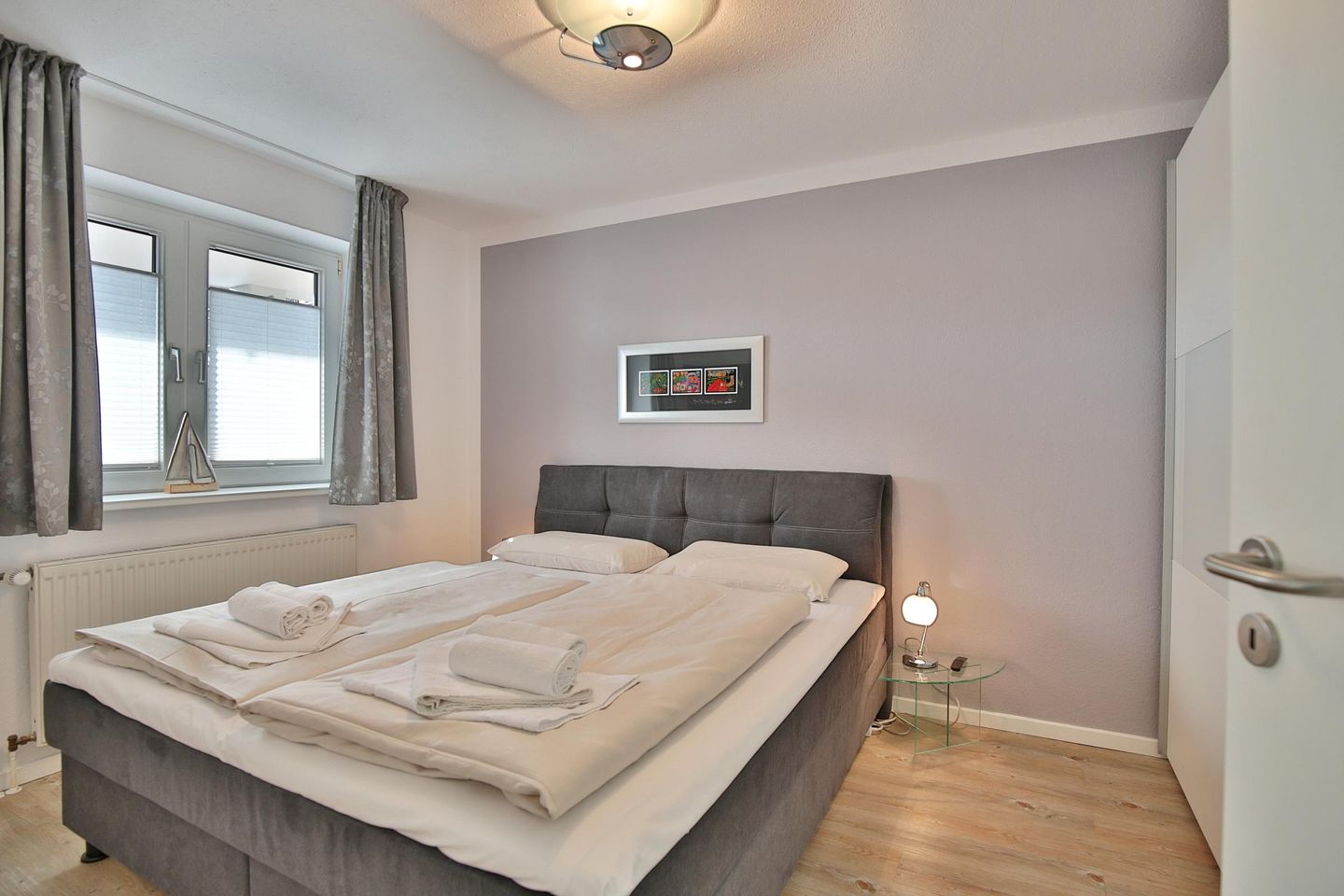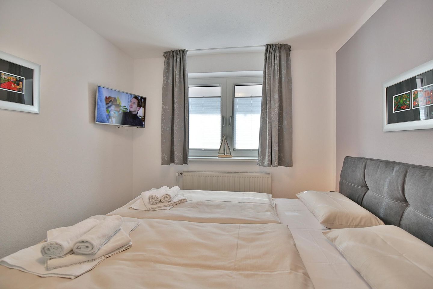 Im Schlafraum befindet sich ein gemütliches Boxspringbett mit durchgehendem Topper (1,80 x 2,00 m ) und einem geräumigen Kleiderschrank als Stauraum sowie ein weiterer TV.