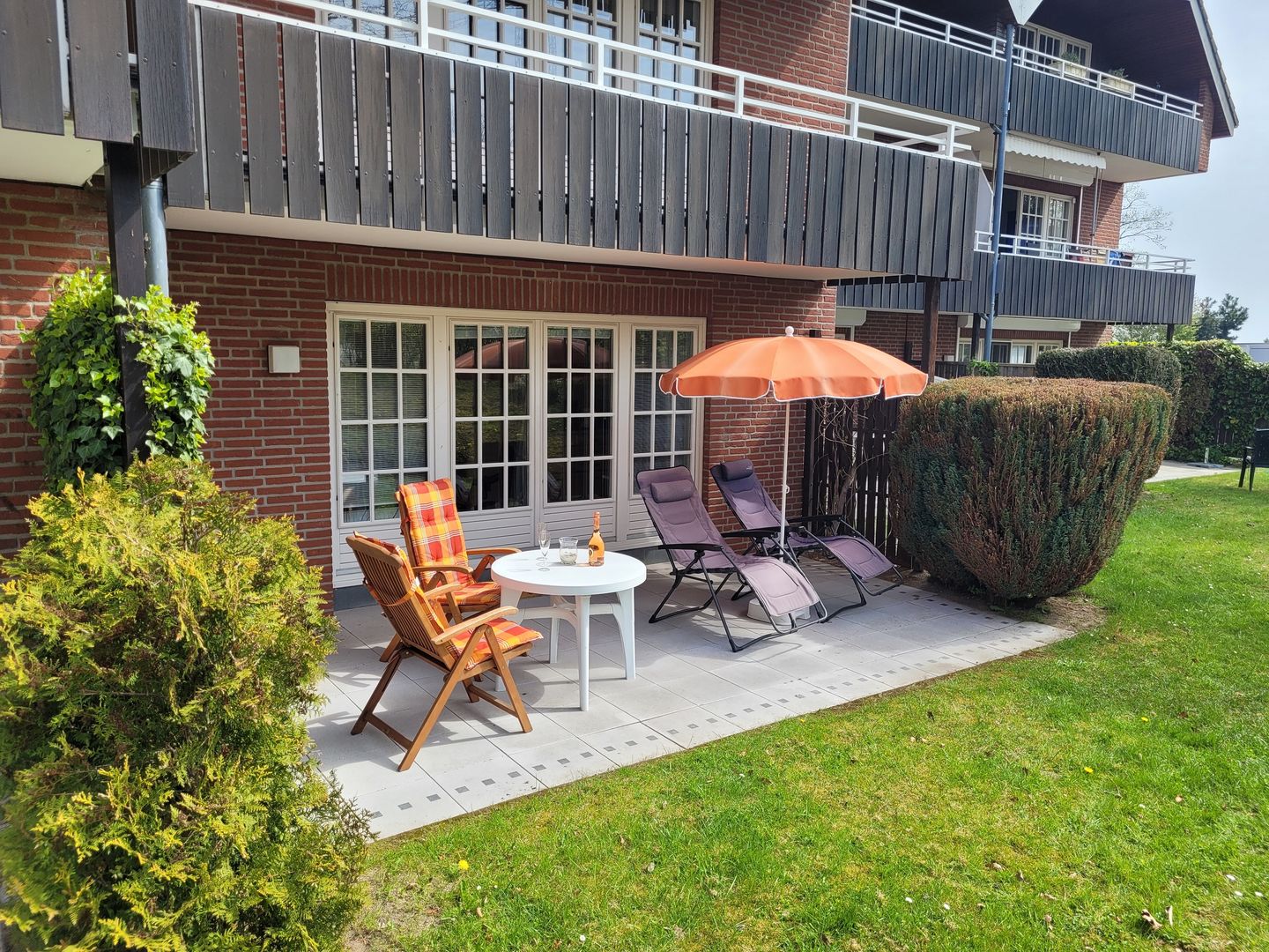 Von hier aus gelangen Sie auf die möblierte Südwestterrasse mit gemütlichen Sonnenliegen. Die Süd-West- Lage garantiert bei schönem Wetter viele Sonnenstunden von mittags bis abends.