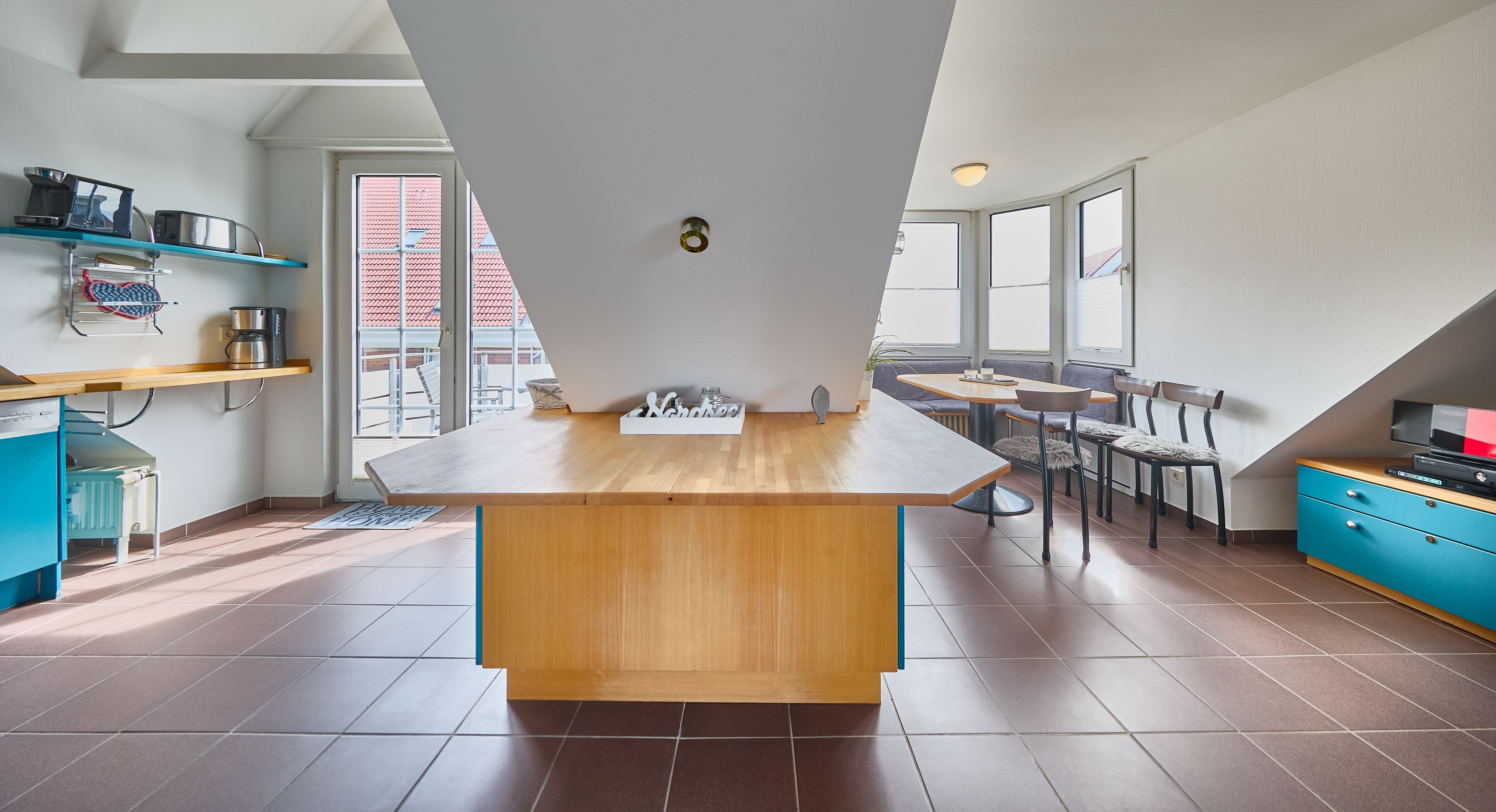 Liebe Nordseeurlauber, aufgepasst! Unsere Ferienresidenz Steinmarne beherbergt eine ca. 53 m² große Wohnung, ein perfekter Rückzugsort für Ihren Cuxhaven-Urlaub. Die stilvolle Einrichtung und die offene Küche schaffen eine einladende Atmosphäre im Wohnbereich. Entspannen Sie in unserem ausgebauten Erker mit gemütlicher Sitzbank und einer großzügigen Couch.