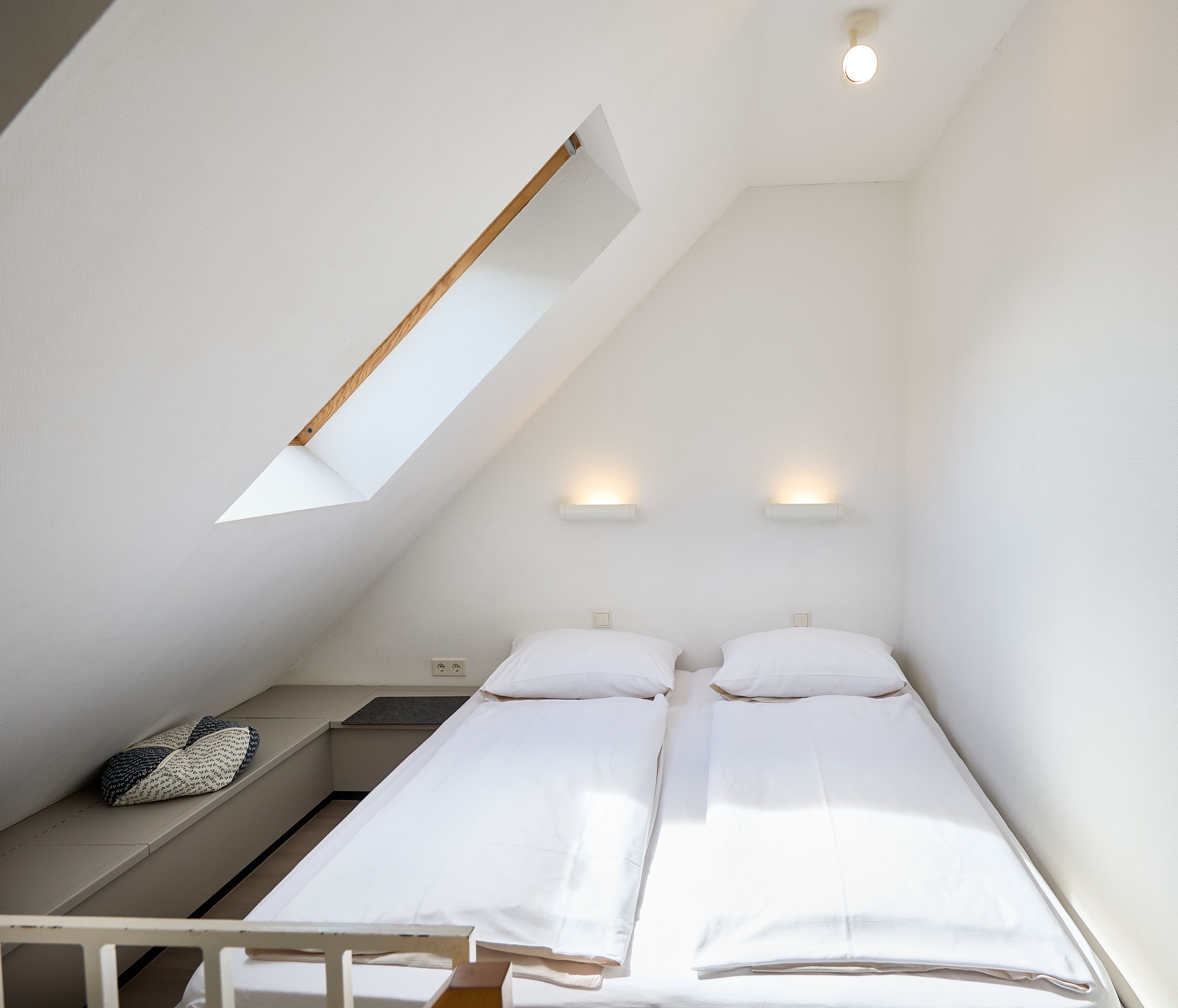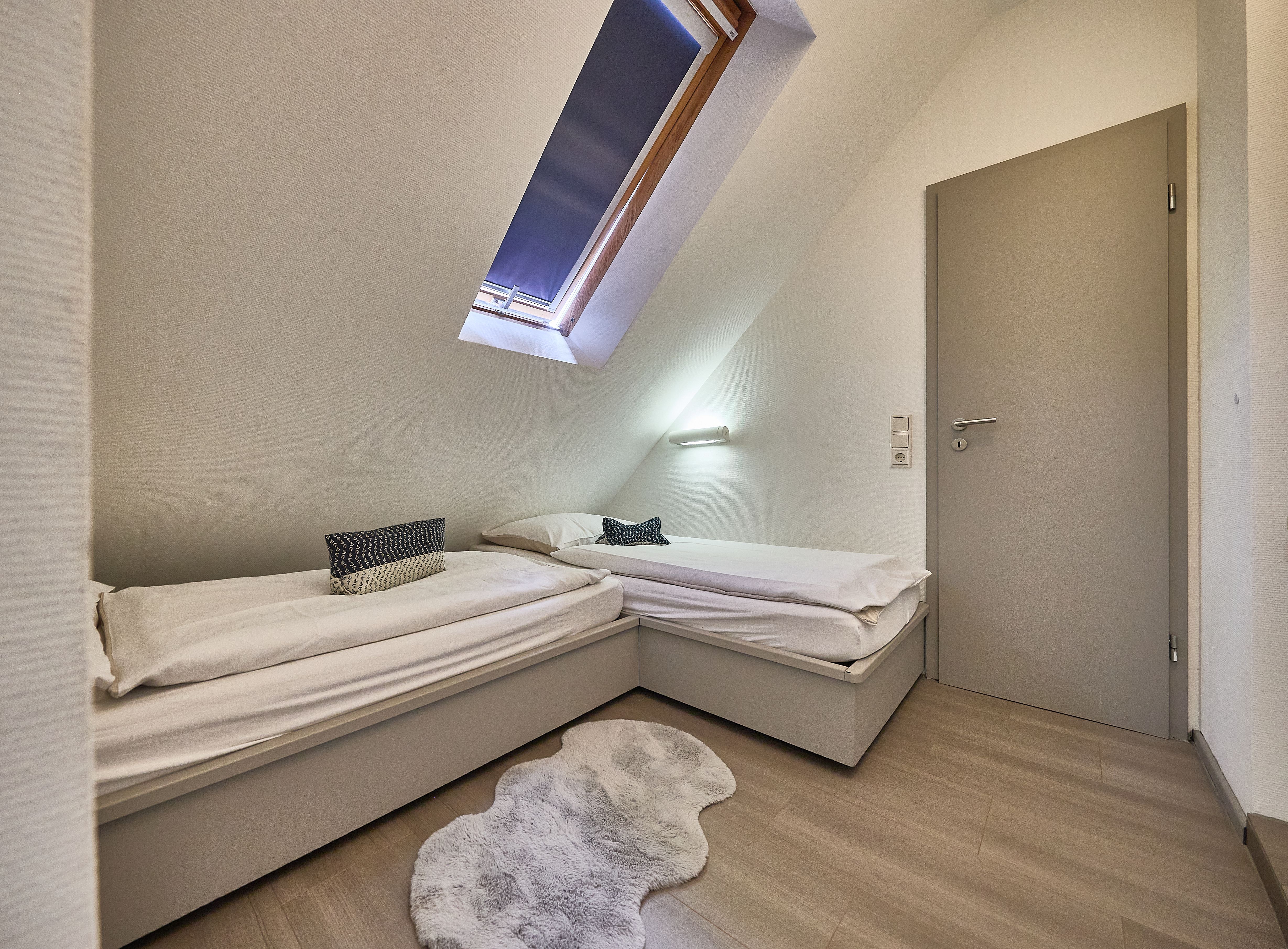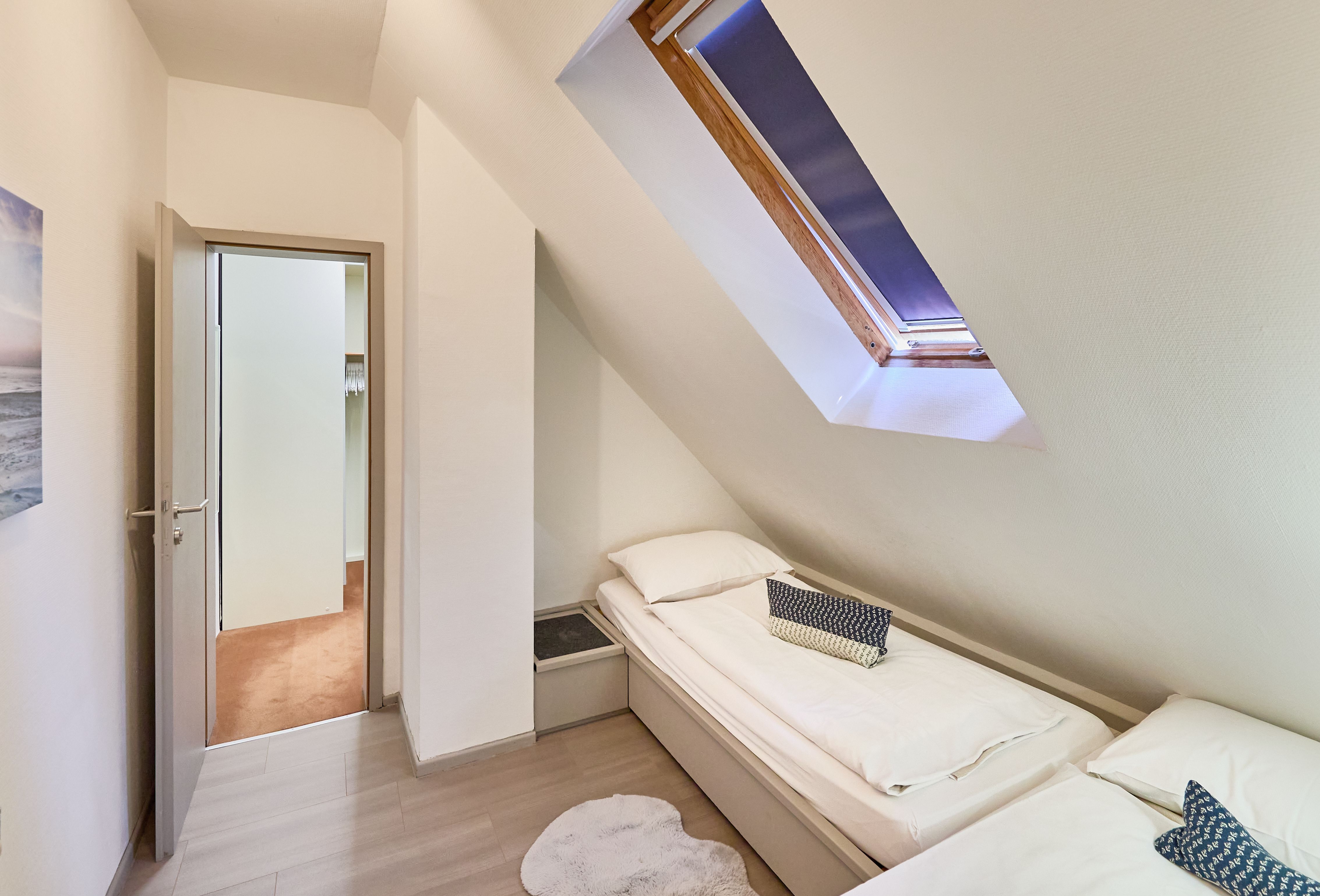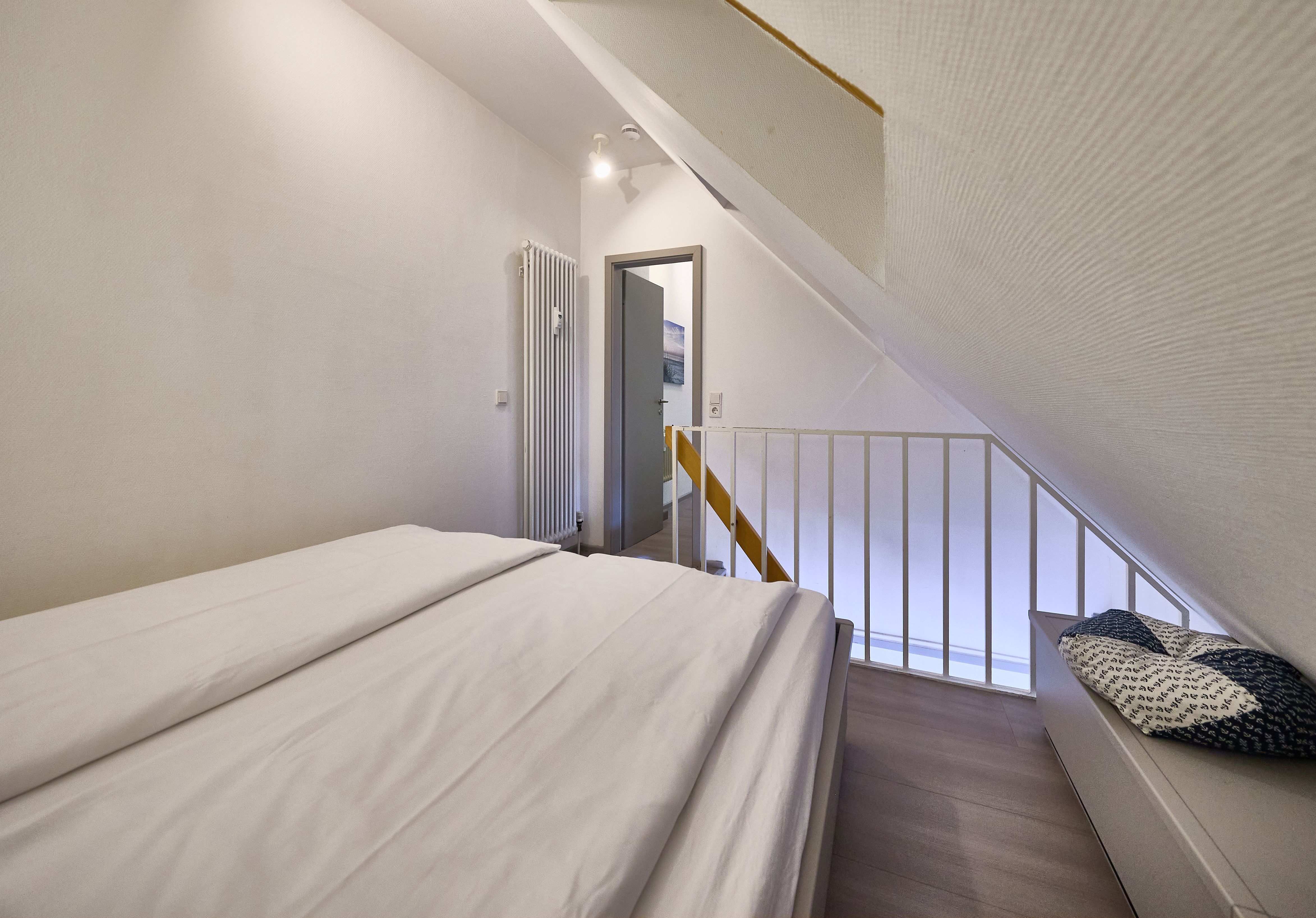 Der ausgebaute Spitzboden beherbergt zwei Schlafzimmer: in der Galerie ein bequemes Doppelbett und ein angrenzendes Zimmer mit zwei Einzelbetten, die optimal für Kinder hergerichtet sind. Eine optimale Belegung ist für 3 Erwachsene plus einem Kind. Ein begehbares Ankleidezimmer steht Ihnen ebenfalls zur Verfügung, um Ihre Garderobe ordentlich zu verstauen. Die Treppe ist bequem zu nutzen.