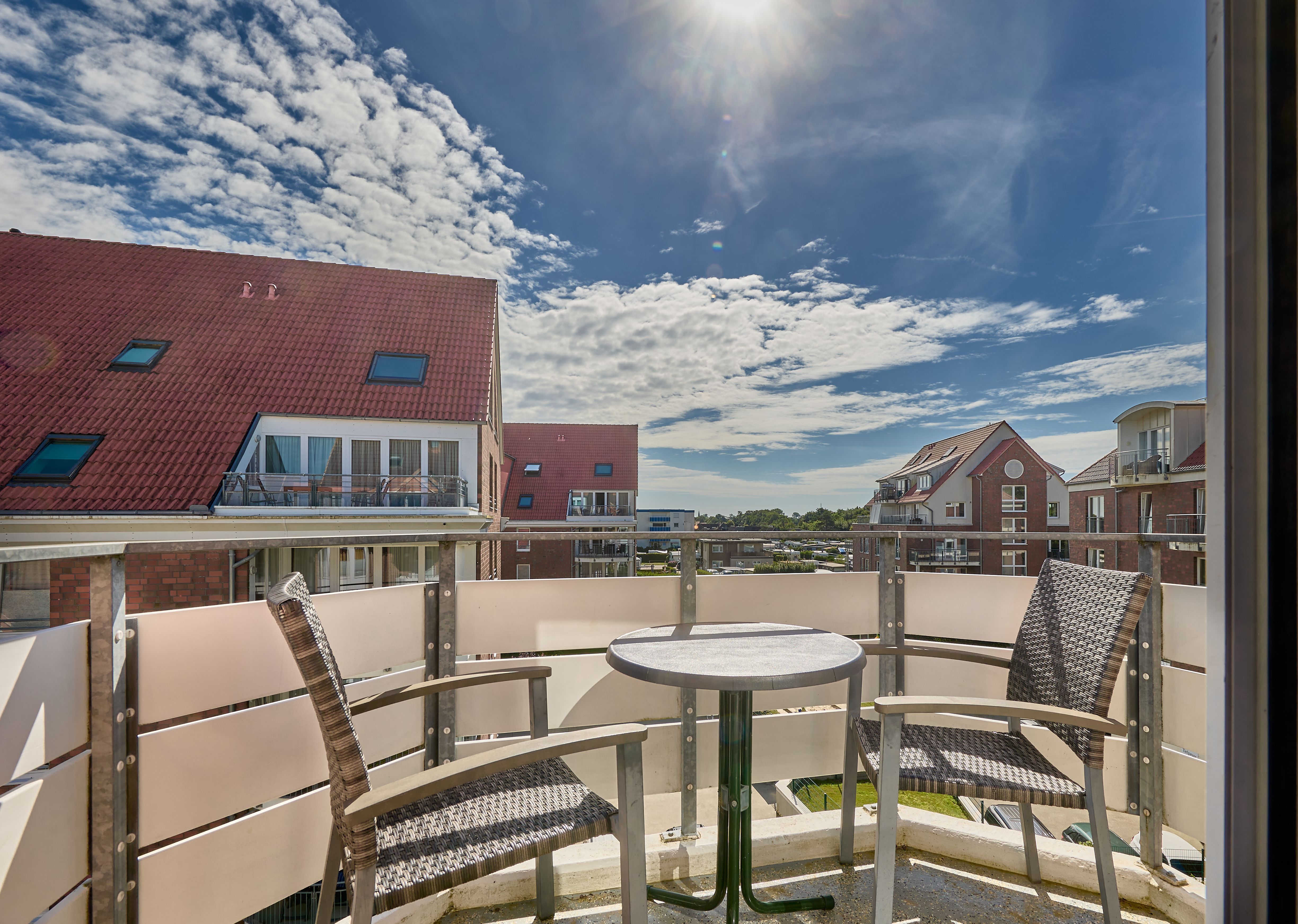 Zwei Sonnenbalkone laden dazu ein, die frische Nordseeluft in vollen Zügen zu genießen. Im Frühjahr und Herbst/Winter gewähren der Erker und der seitliche Balkon durch die umliegenden Bäume sogar einen kleinen Blick auf die Nordsee.