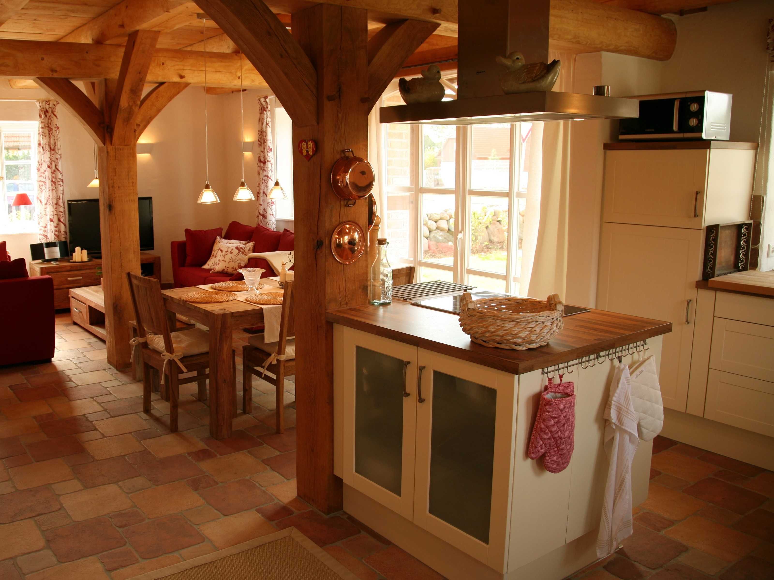 Die offene Wohnküche bietet auch dem ambitionierten Hobbykoch genug Möglichkeiten, im Urlaub nicht auf kulinarische Genüsse verzichten zu müssen. Die exklusive Ausstattung des Ferienhauses liegt weit über dem Vermietstandard anderer Ferienhäuser. Das betrifft unter anderem die Bodenbeläge (Terracotta), WLAN, großes Bad mit Wellness-Dusche und Badewanne, einem weiterem Duschbad, eine wunderschöne Galerie mit Ohrensesseln zum Lesen und einem zweiten Flachbildfernseher (man ist sich ja nicht immer einig, was das Programm angeht) und natürlich die Möblierung, die mit ihrem warmen Landhauscharakter zur Urlaubsstimmung beiträgt. Ein Gartenhaus mit Sauna und überdachter Gartenterrasse bietet Unterstellplatz für mitgebrachte Fahrräder. WLAN kostenfrei. Waschmaschine und Wäschetrockner sowie Kaminholz sind inkl. Zwei Stellplätze direkt auf dem Grundstück. Die Saunanutzung erfolgt über den Münzautomat. Es befindet sich eine Außenkamera am Haus, diese überwacht die Eingangstür und die Terrasse.