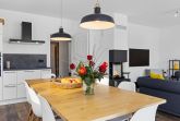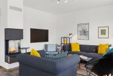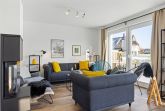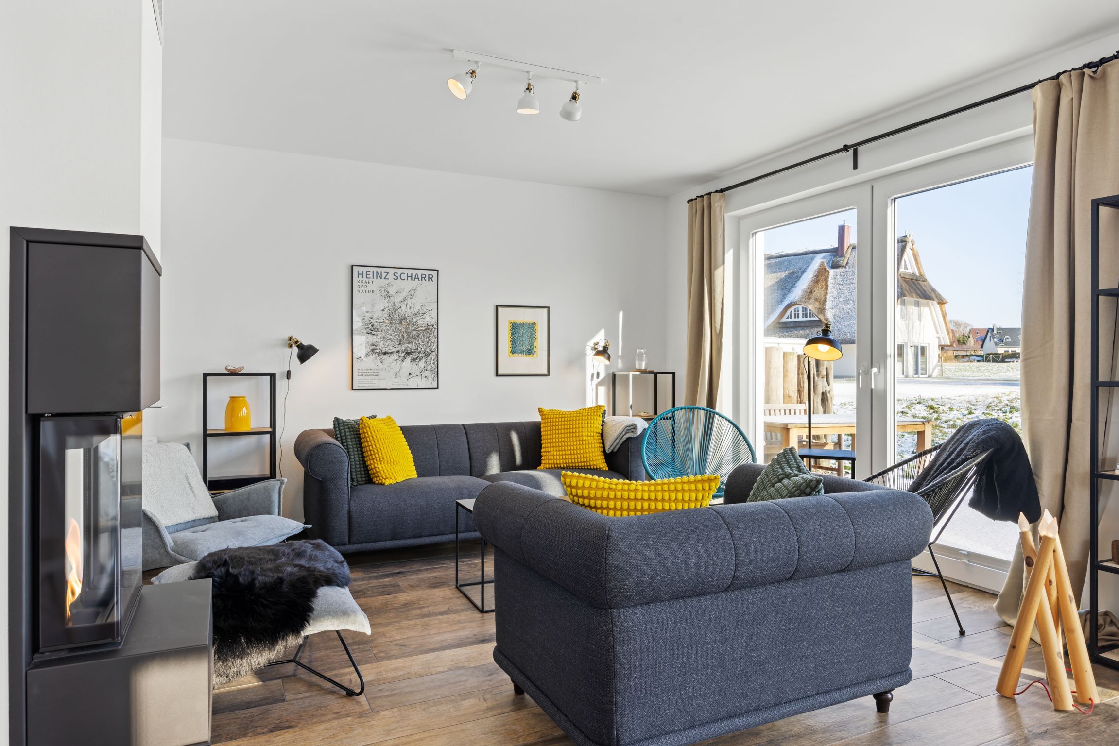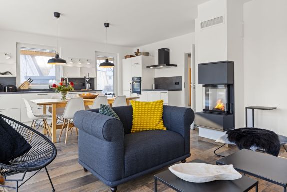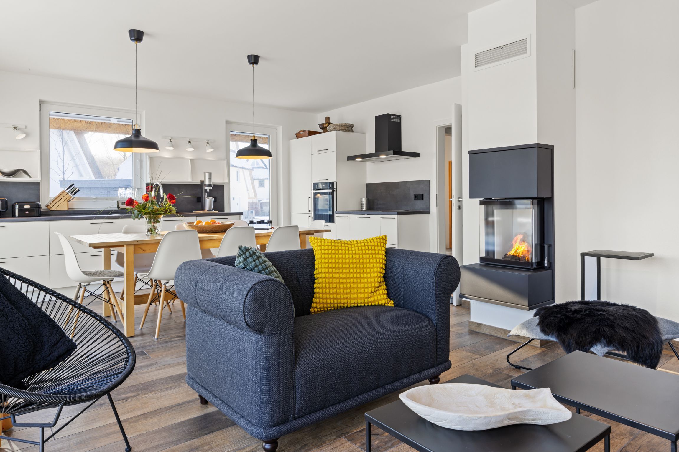 Weitläufiger Flur zum entspannten Ankommen für alle Urlaubsgäste. Großzügiger, stylisch und urgemütlich eingerichteter Wohn- Essbereich mit Sofaecke und Kamin sowie Smart TV. Die Küche verfügt über einen großen Esstisch für 8 Personen und eine umfangreiche Ausstattung mit Geschirrspüler, Backofen, Herd mit 4 Kochfeldern, Mikrowelle, Wasserkocher, Filterkaffeemaschine, Pad Maschine, Fondue und jede Menge weitere Küchenutensilien. Aus der Küche gelangt man direkt auf den schönen großen Terrassenbereich mit Blick in die freie und unverbaute Natur der Salzhaffregion. Hier kann man ebenso wunderbar den klaren Ostseehimmel genießen und einfach die Seele baumeln lassen