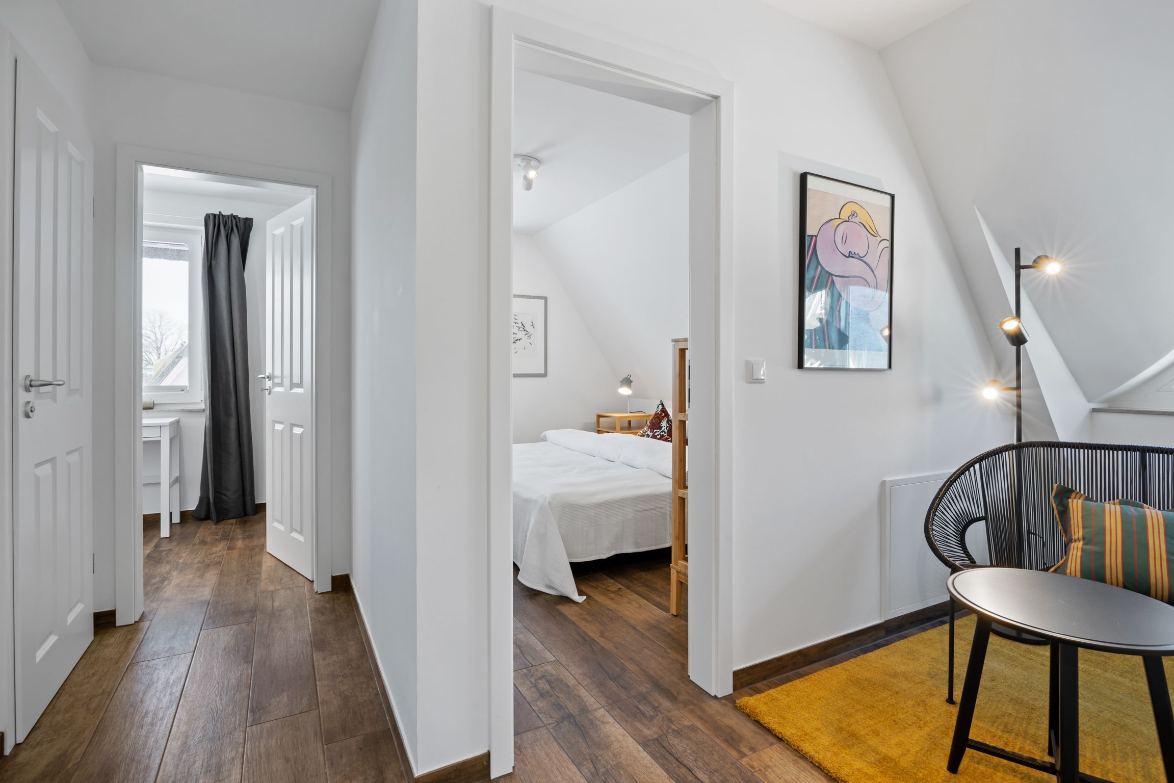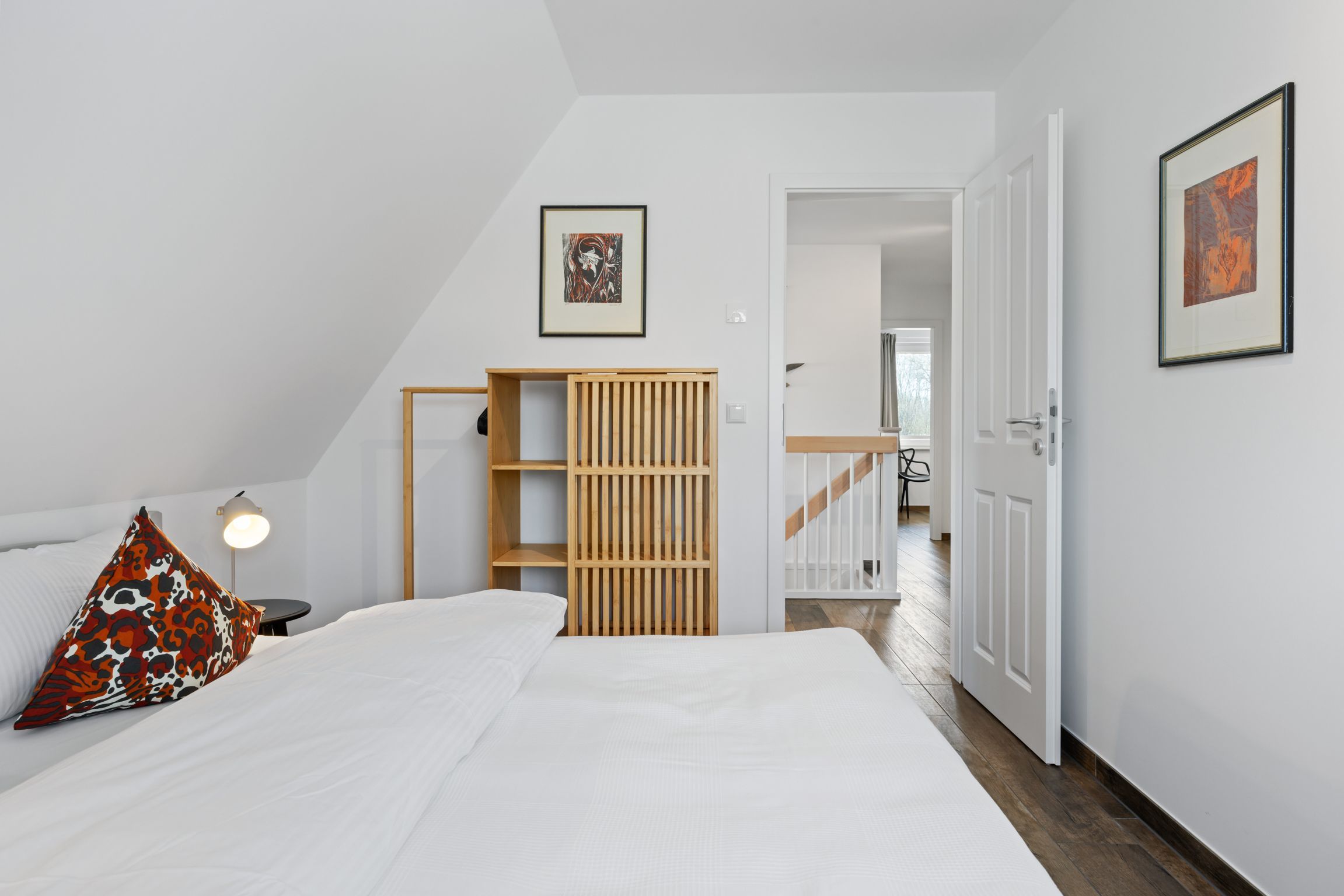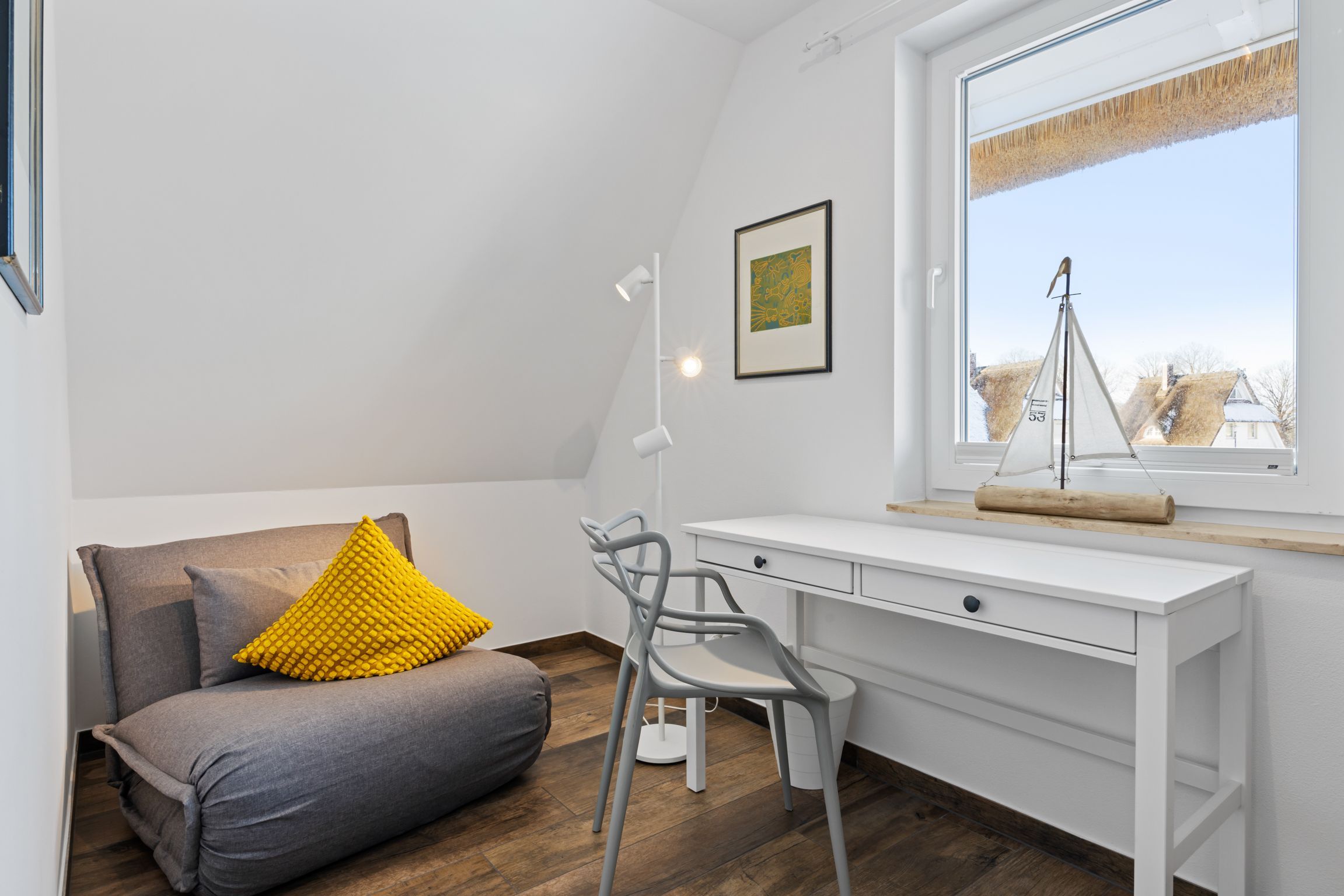 Im Obergeschoss befinden sich drei weitere Schlafzimmer sowie ein Arbeitszimmer als Rückszugort. Schlafzimmer 2 mit Doppelbett (1,80 x 2,00m), offenem Kleiderschrank. Schlafzimmer 3 mit Doppelbett (1,60 x 2,00m), und offenem Kleiderschrank, Schlafzimmer 4 mit Doppelbett (1,40 x 2,00m) und Kleiderkommode. Zimmer 5 mit Arbeitsbereich und herrlichem Ausblick vom Schreibtisch. In der Galerie des OG ist ein chilliger Bereich für die Gäste des Hauses enstanden, somit gibt es viele individuelle Rückzugsorte im haffhouse. Unter der Reetgaube lädt das Wohlfühlbad mit Rainshower- Dusche zu kleinen Wellnesseinheiten ein. Ein weiteres Gäste WC ist ebenso im OG vorhanden sowie Waschmaschine und Trockner im Flurbereich.