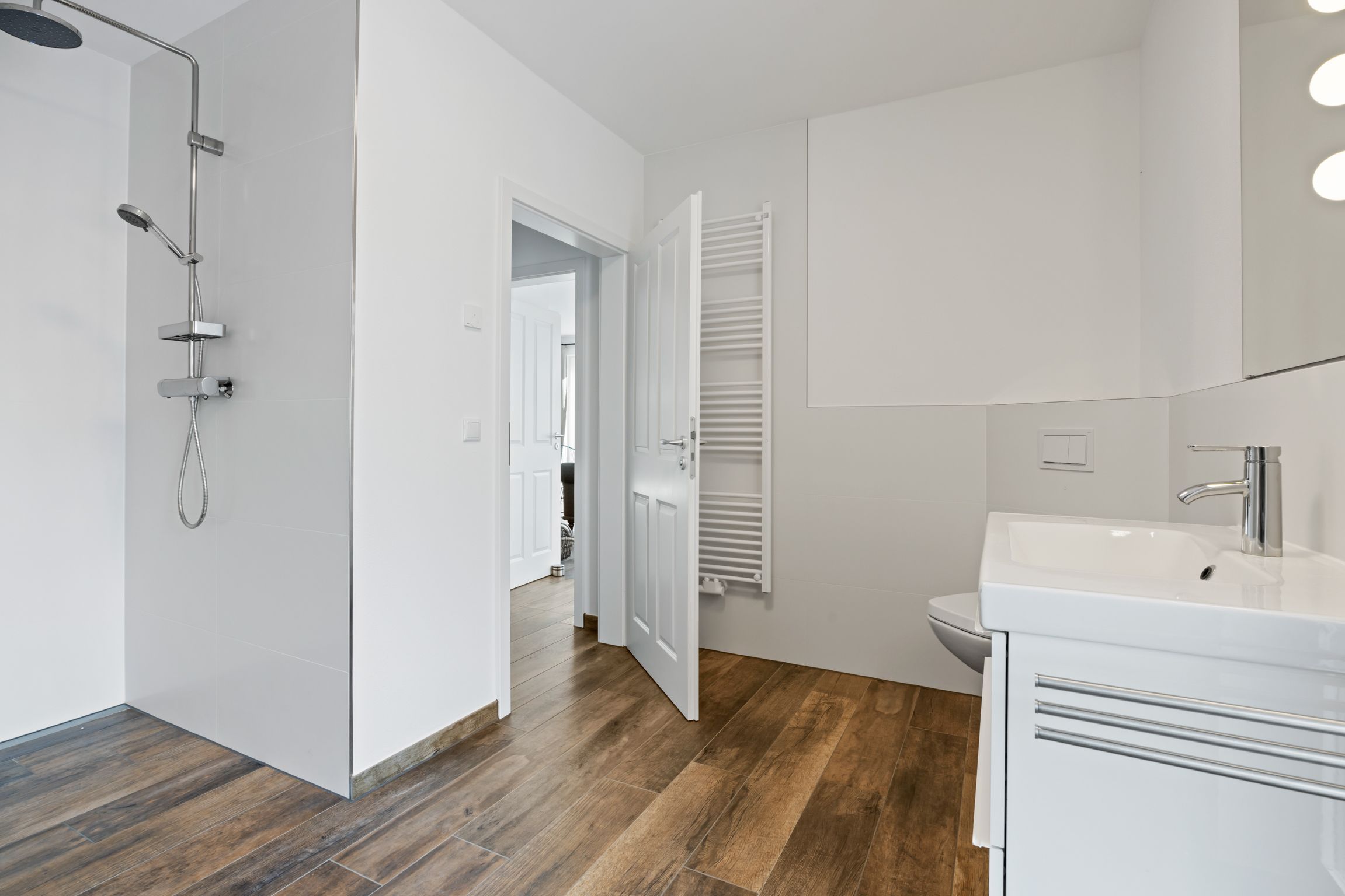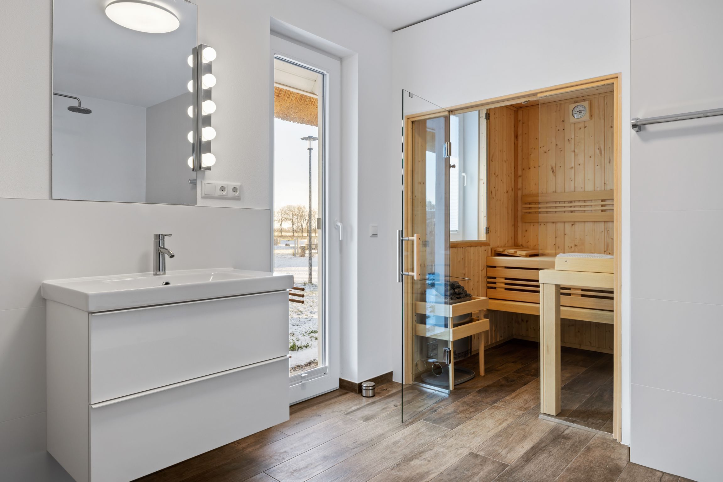 Bad mit großer ebenerdiger Rainshower- Dusche und Sauna sowie direkter Zugang zum Garten.