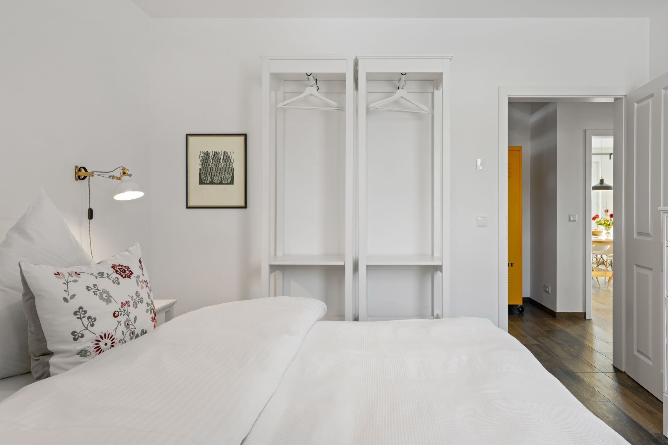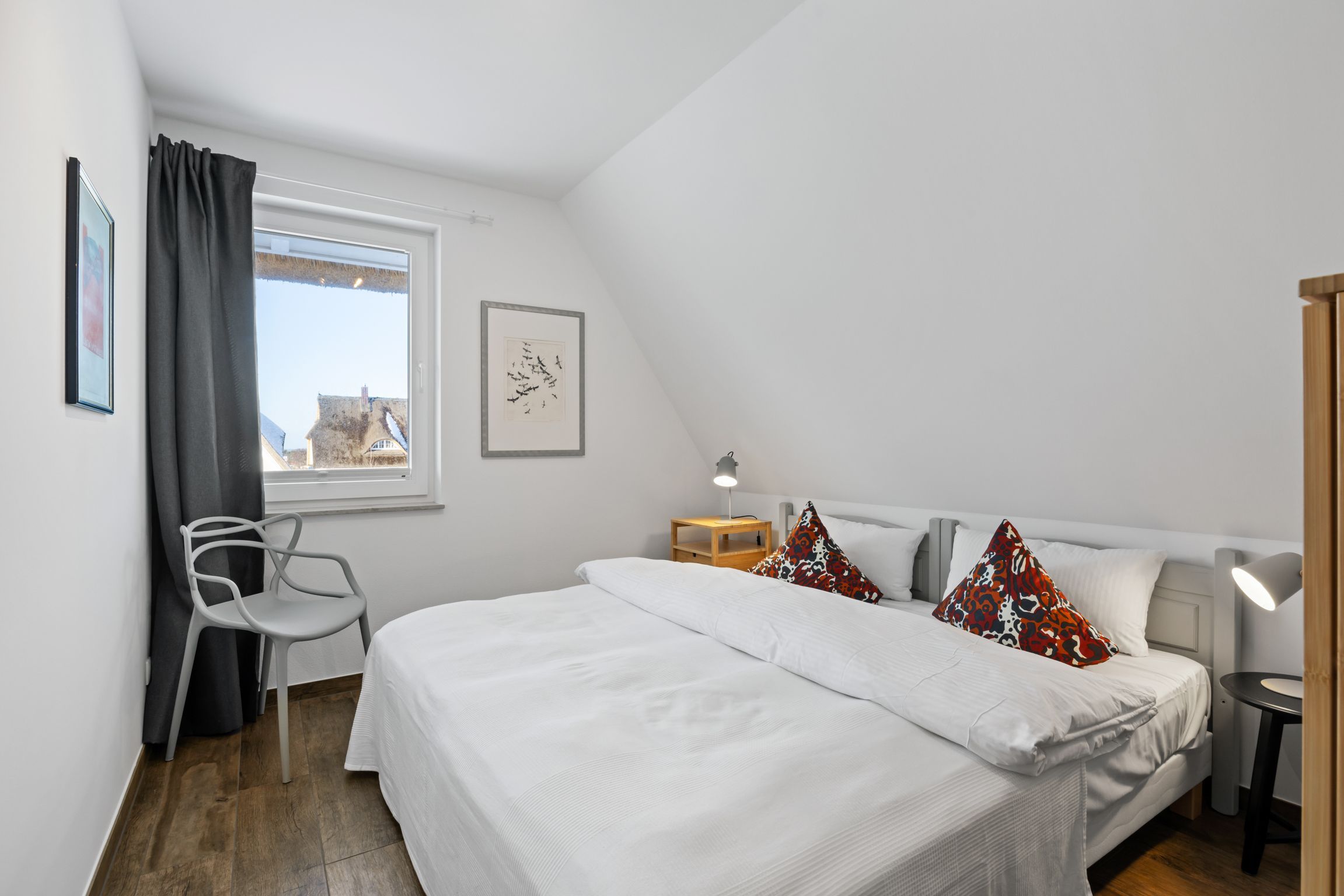Schlafzimmer 1 im EG mit Doppelbett (1,80 x 2,00m), offenem Kleiderschrank.