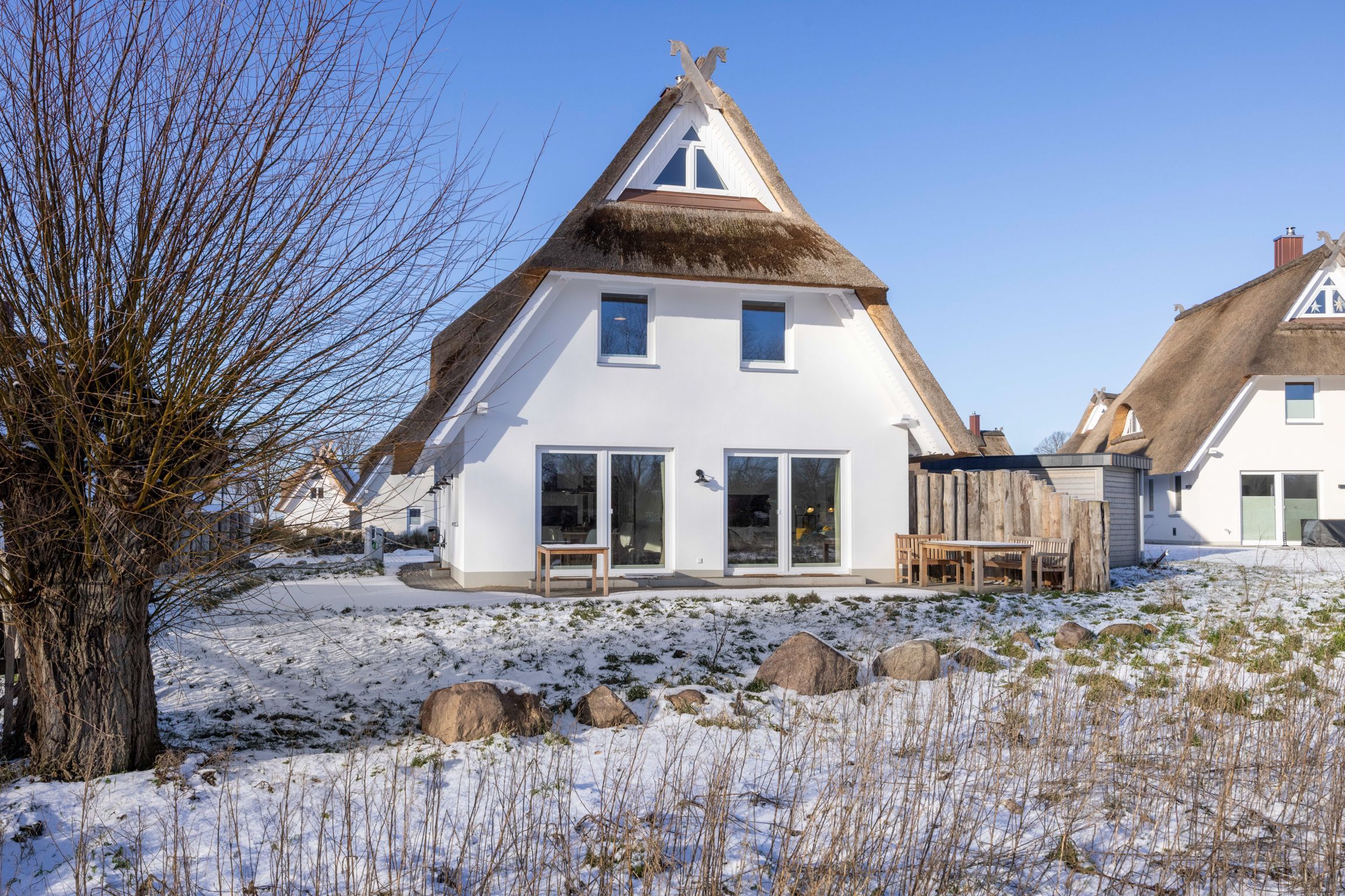Auf 130 qm verteilt, gibt es ausreichend Platz für bis zu 8 erwachsene Gäste und ein Kleinkinde bis 2 Jahre. In 4 großzügigen Schlafzimmern, 2 Bädern, einem Gäste WC und einem urgemütlichen Wohn- Essbereich mit freier Aussicht in die Landschaft der Salzhaffregion. Das EG des Ferienhauses ist barrierefrei und rollstuhlfreundlich gestaltet.