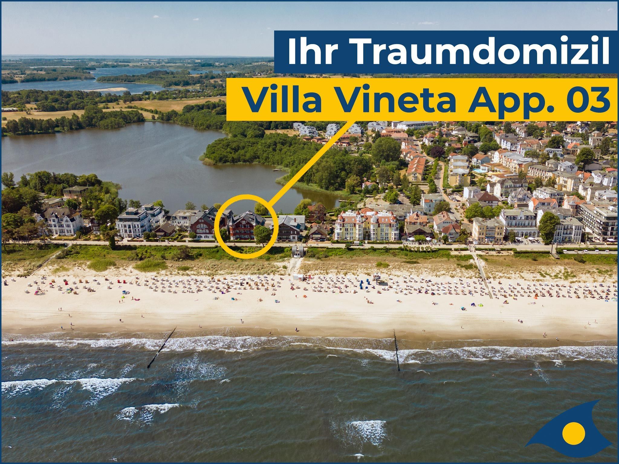 Die Villa Vineta liegt in bester Lage direkt an der Strandpromenade von Bansin. Mit ihren 2 charakteristischen Türmen ist sie eine der schönsten Strandvillen der Insel Usedom. Nach vollständiger Renovierung bietet die Villa Vineta modernen Komfort (z.B. Aufzug, Sauna) in historischem Ambiente. Umgeben von der Ostsee auf der einen und dem Schloonsee auf der anderen Seite bietet sich ein herrlicher Ausblick aufs Wasser. Die Lage unmittelbar am Strand in der Umgebung schöner Villen ist nicht zu übertreffen.