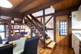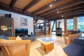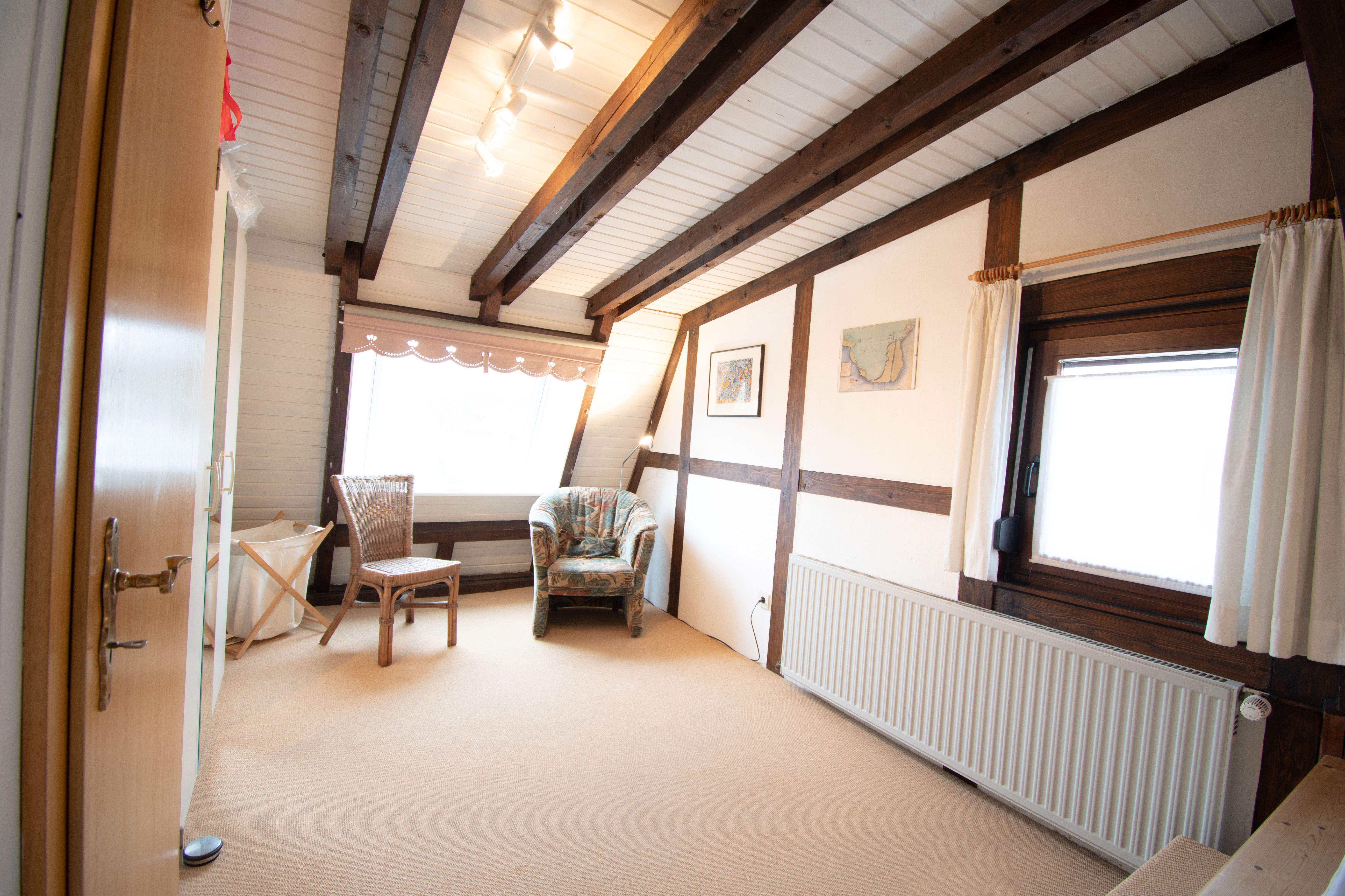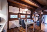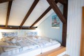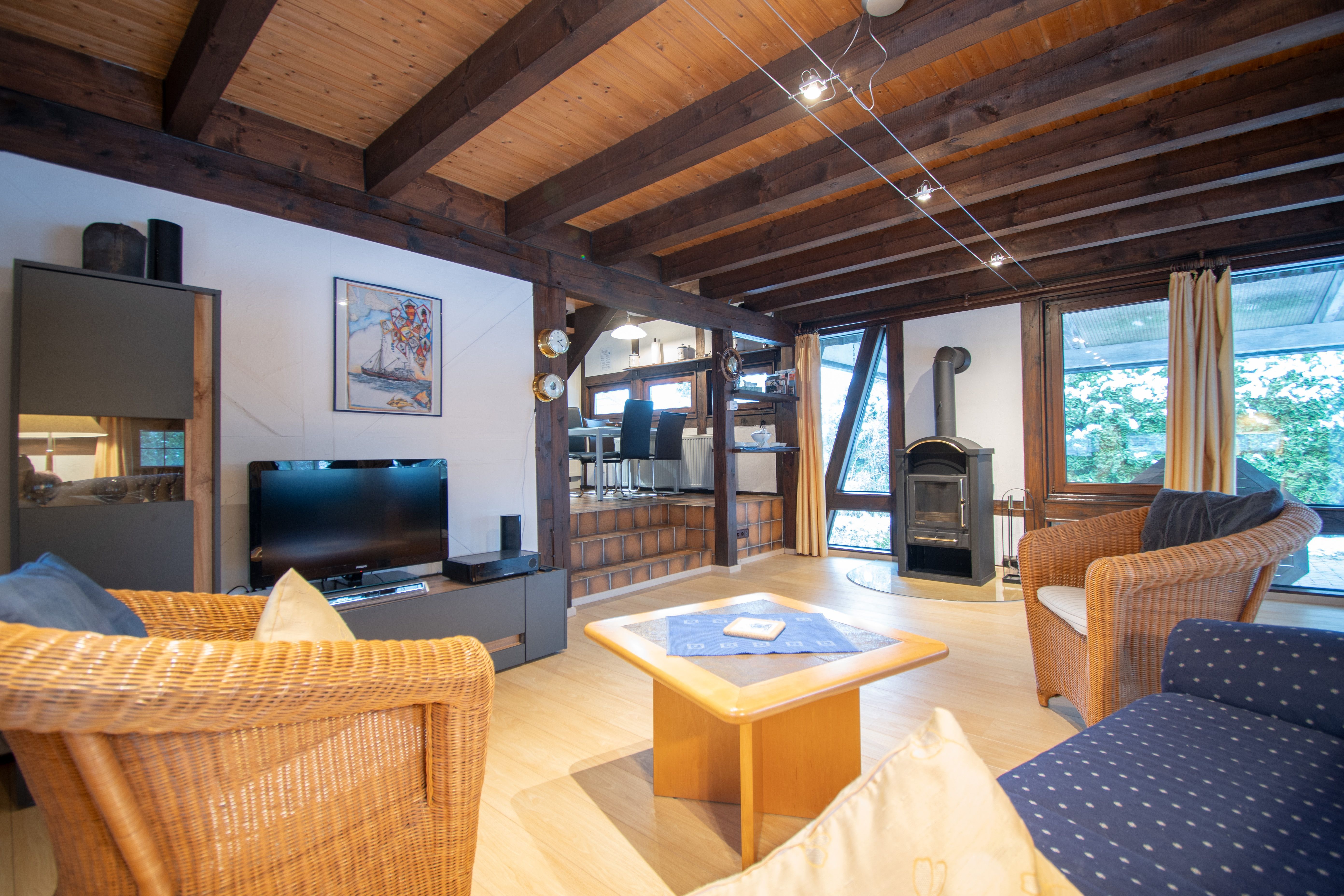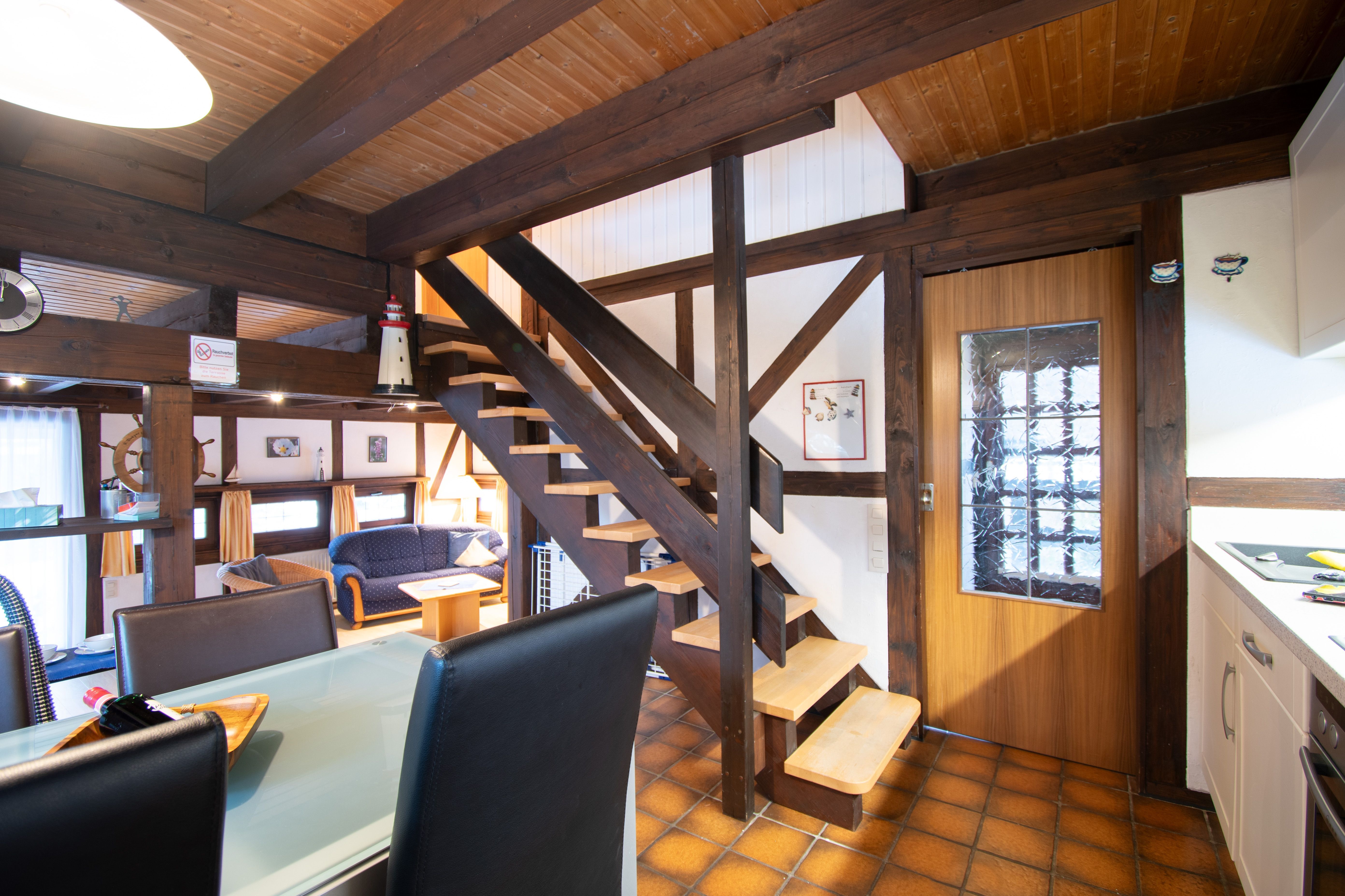 Das gemütliche Wohnzimmer mit Kamin ist behaglich. Ein paar Stufen hinauf befindet sich die komplett ausgestattete Wohnküche mit vorgelagerterm Essbereich - alles da für´s gemütliche Frühstück oder das entspannte Kochen. Im EG liegt auch das modernisierte Duschbad. Über eine offene Holztreppe gelangen Sie zu den beiden Schlafzimmern mit je einem Doppelbett - beide Räume haben reichlich Platz für Kleidung. Entpannen Sie auf 2 möblierten Terrassen und Gartenanteil mit Grillmöglichkeit.