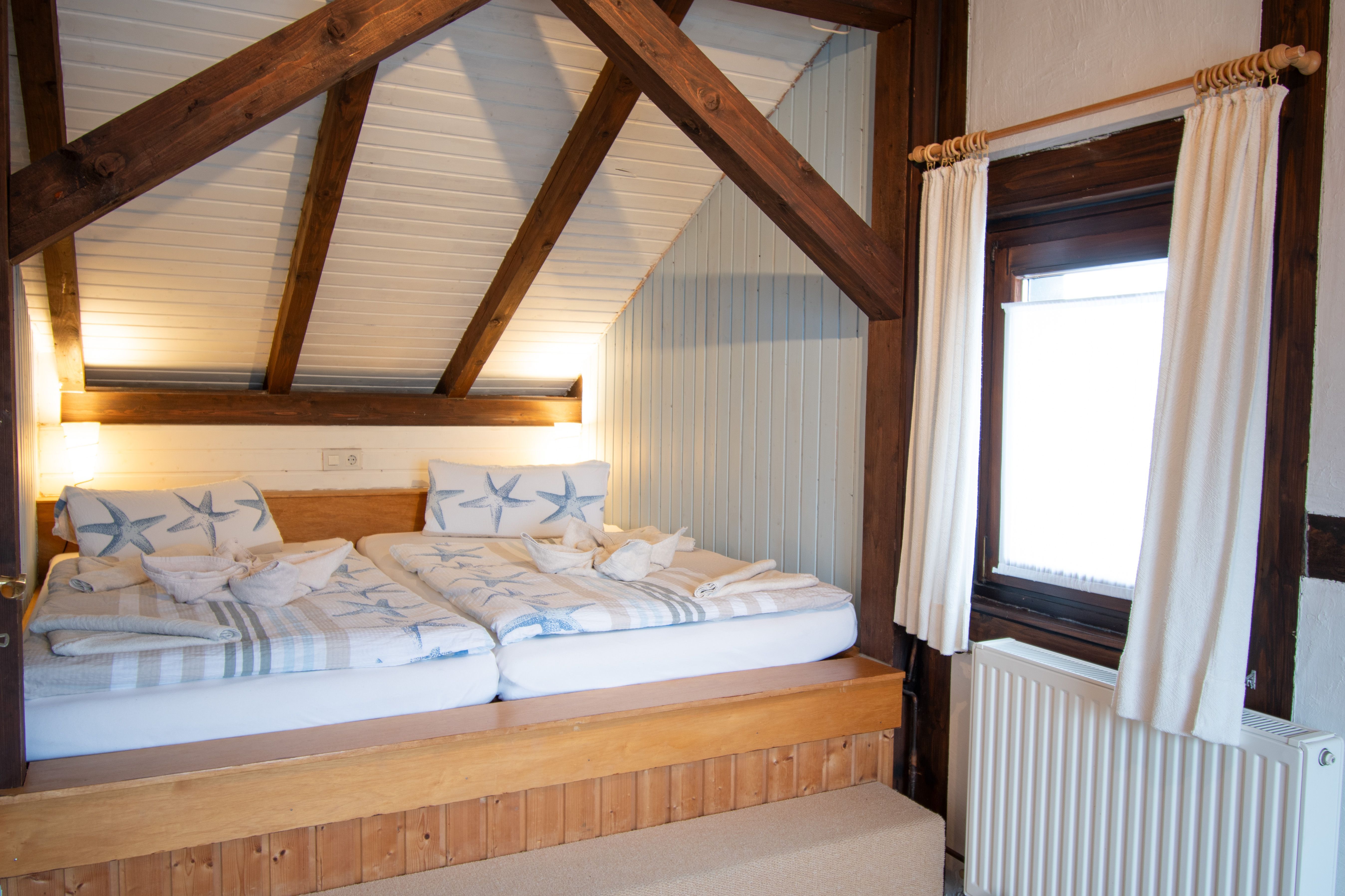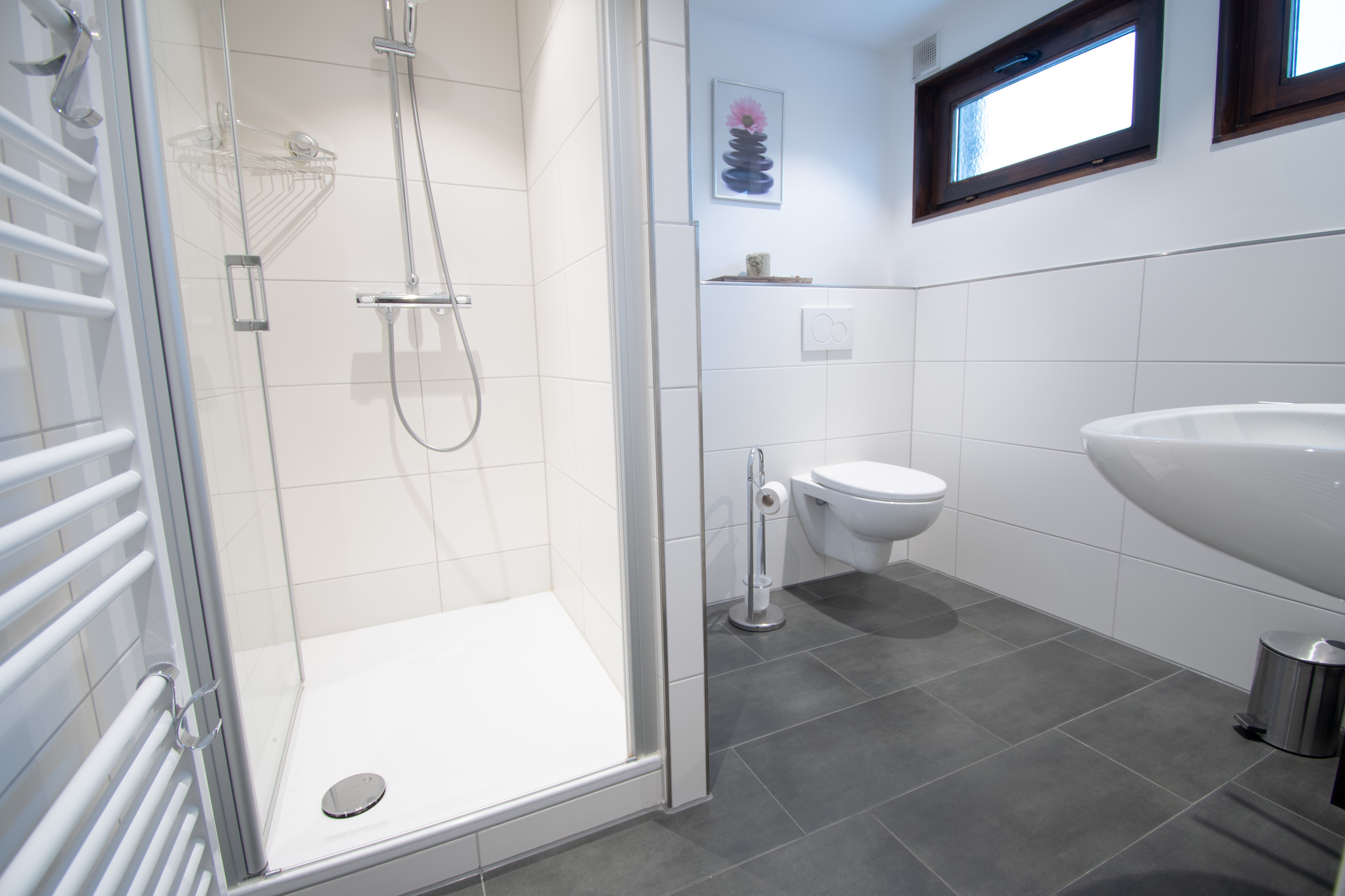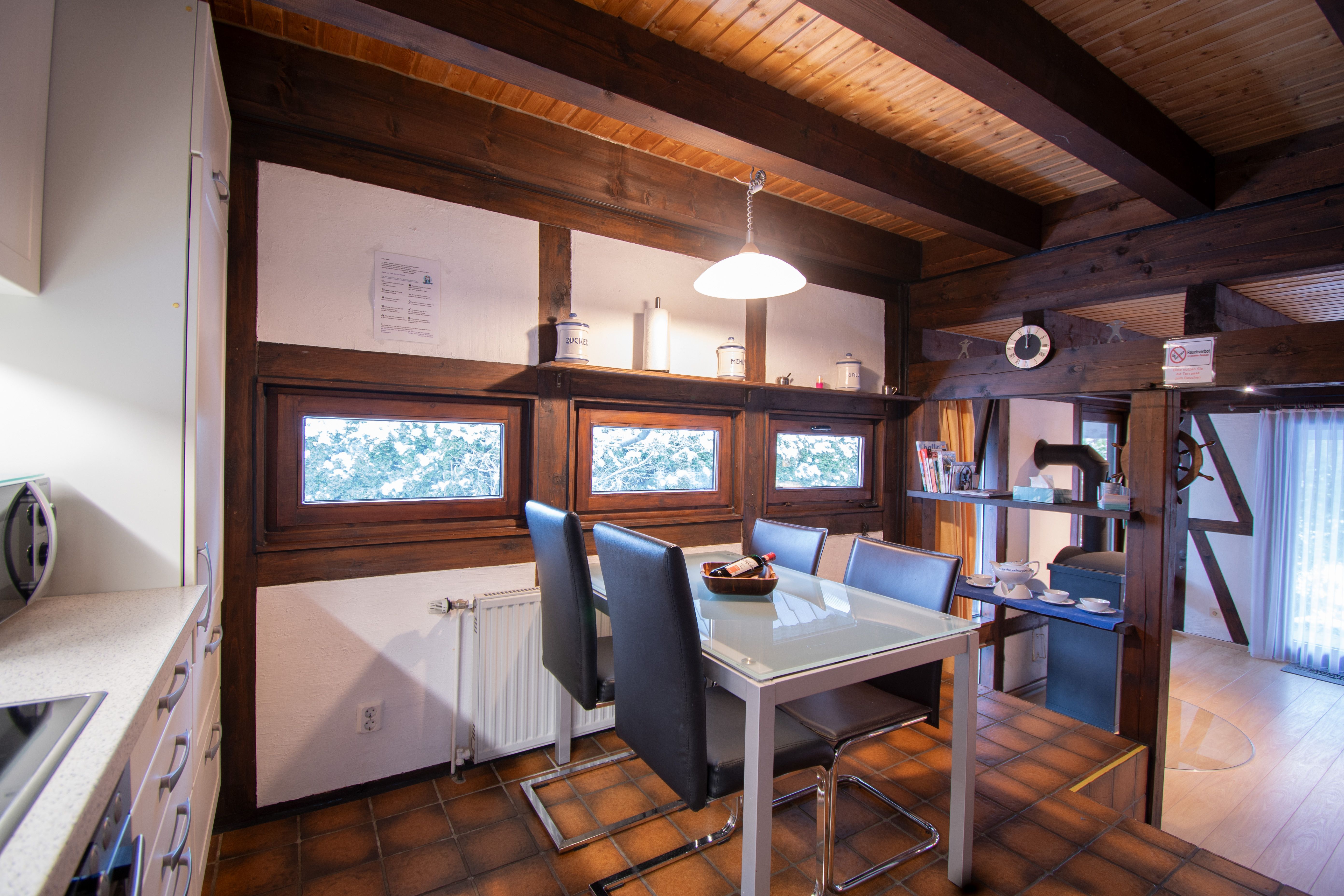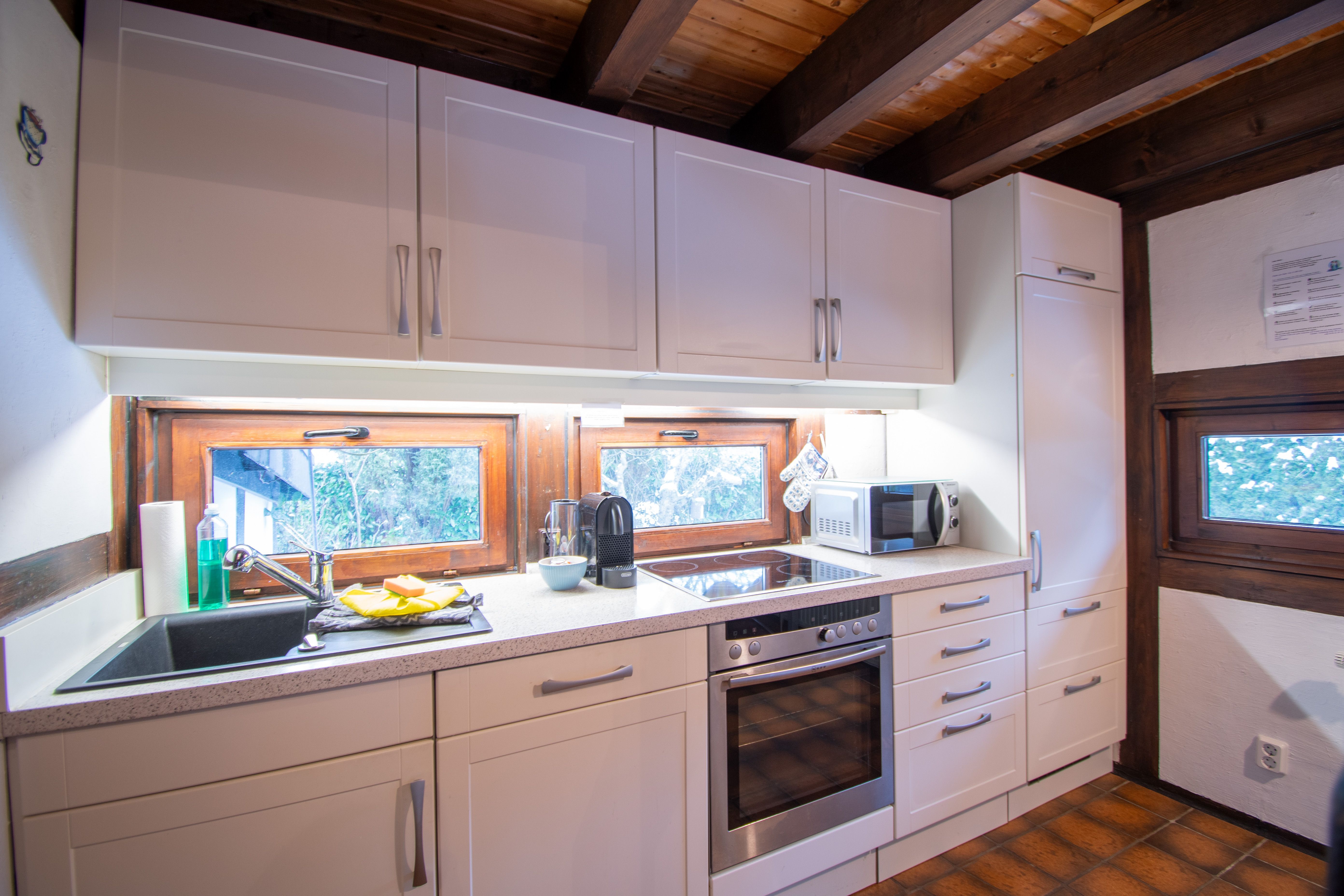 Das gemütliche Wohnzimmer mit Kamin ist behaglich. Ein paar Stufen hinauf befindet sich die komplett ausgestattete Wohnküche mit vorgelagerterm Essbereich - alles da für´s gemütliche Frühstück oder das entspannte Kochen. Im EG liegt auch das modernisierte Duschbad. Über eine offene Holztreppe gelangen Sie zu den beiden Schlafzimmern mit je einem Doppelbett - beide Räume haben reichlich Platz für Kleidung. Entpannen Sie auf 2 möblierten Terrassen und Gartenanteil mit Grillmöglichkeit.