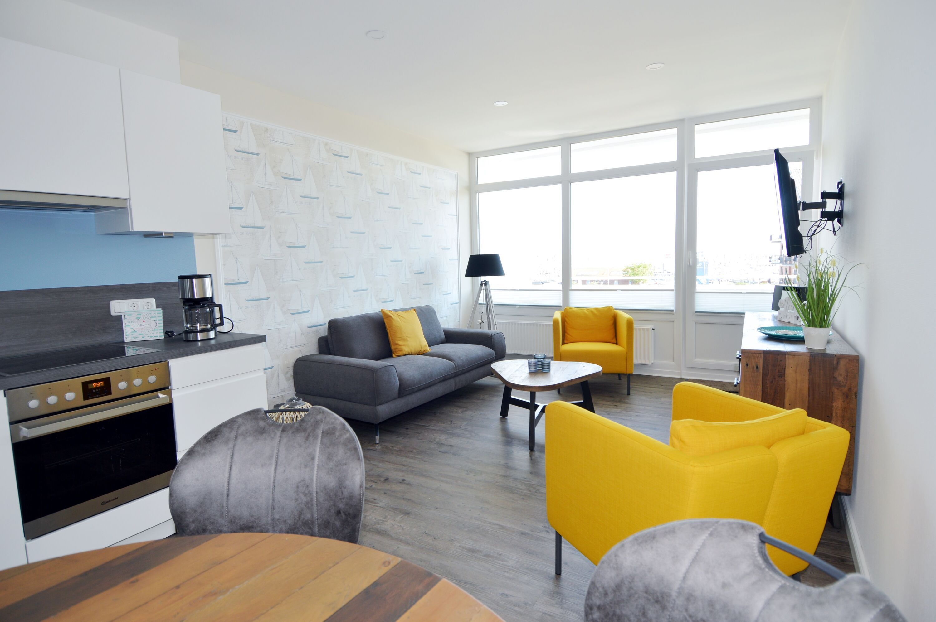 2 separate Schlafzimmer, einen großzügiges Wohn- und Esszimmer und ein Bad mit Dusche. Von den Schlafzimmern blicken sie in Richtung Kirche, vom Wohnzimmer über den Hafenvorplatz zum Yachthafen.