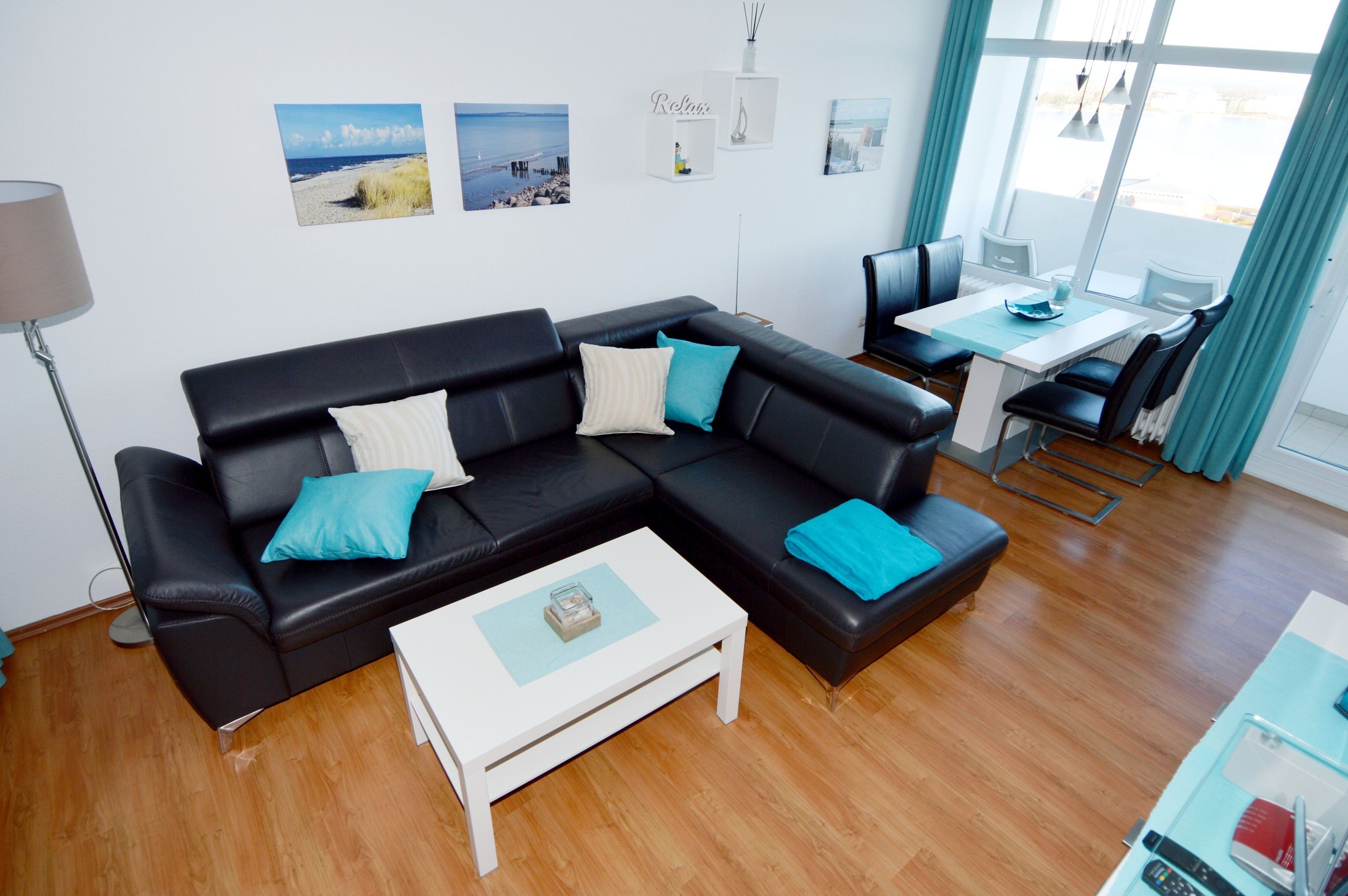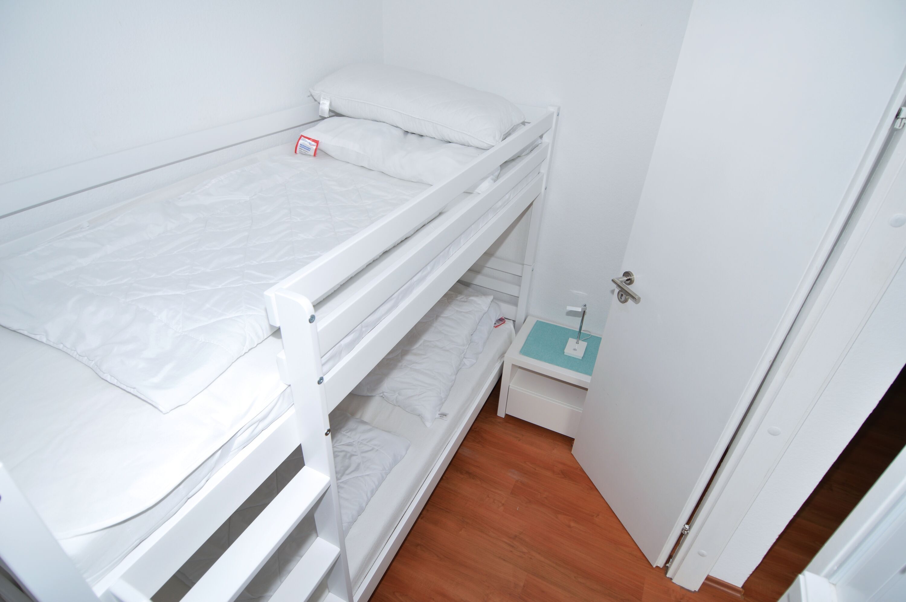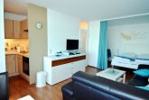 Die zweckmäßige Ausstattung des Appartements bietet alles, was Sie für Ihren Aufenthalt benötigen. Der kombinierte Wohn- und Schlafraum ist mit einem komfortablen Doppelbett ausgestattet, sodass Sie nach einem erlebnisreichen Tag zur Ruhe kommen können. Für die kleinen Urlauber gibt es ein gemütliches Kinderzimmer mit einem Etagenbett. Eines der Highlights des Wohnbereichs ist die großzügige Couchgarnitur, auf der die ganze Familie zusammenkommen kann, um einen Filmabend zu genießen oder einfach nur die Zeit miteinander zu verbringen. Der Esstisch am Fenster ist der perfekte Ort, um gemeinsam zu frühstücken, während Sie den Blick auf das Wasser genießen.