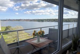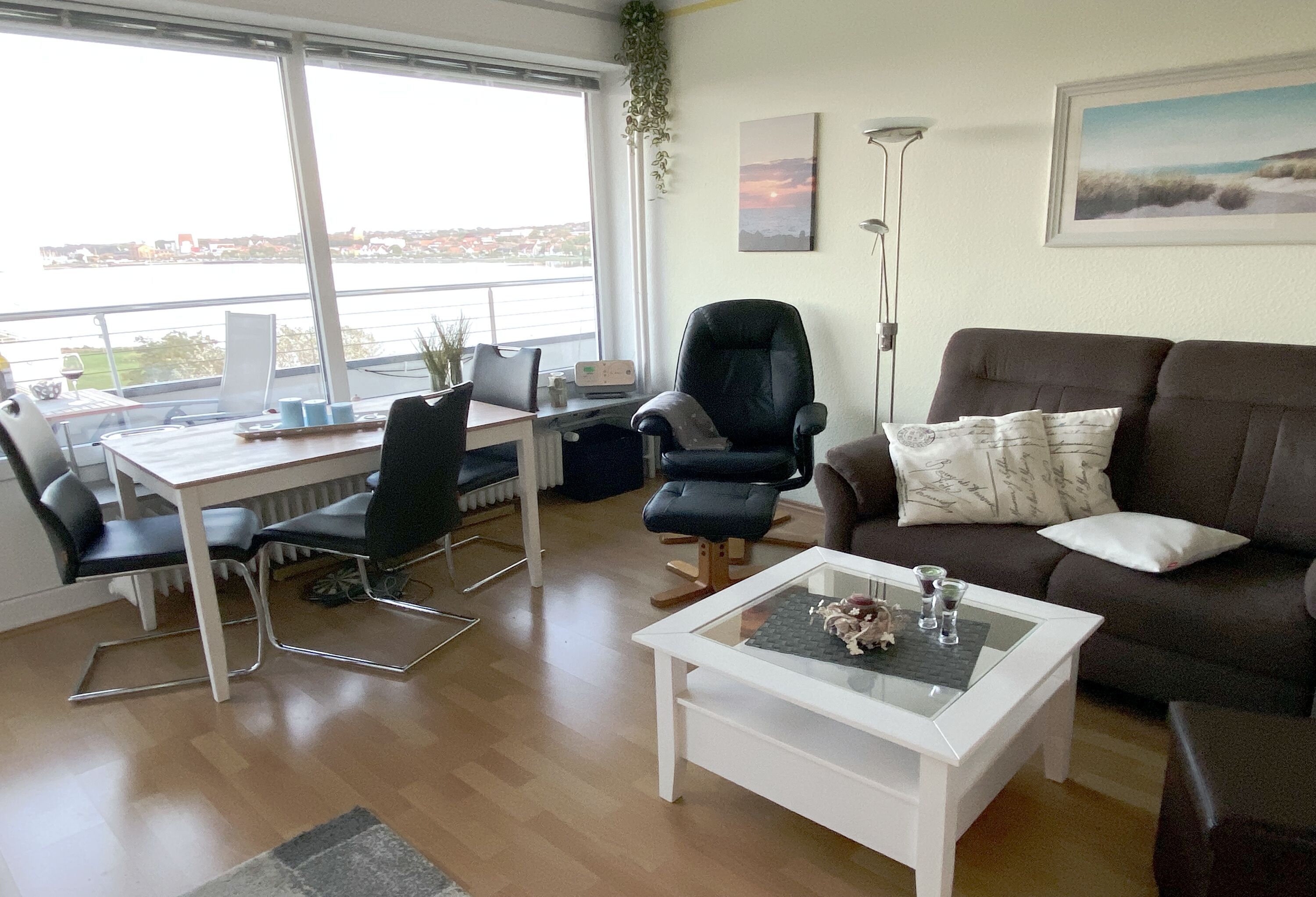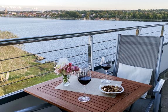Der möblierte Balkon bietet einen traumhaften Ausblick auf den Binnensee mit Heiligenhafen als Hintergrund, sowie der Blick auf ein Biotop, dann die Ostsee mit der Insel Fehmarn.