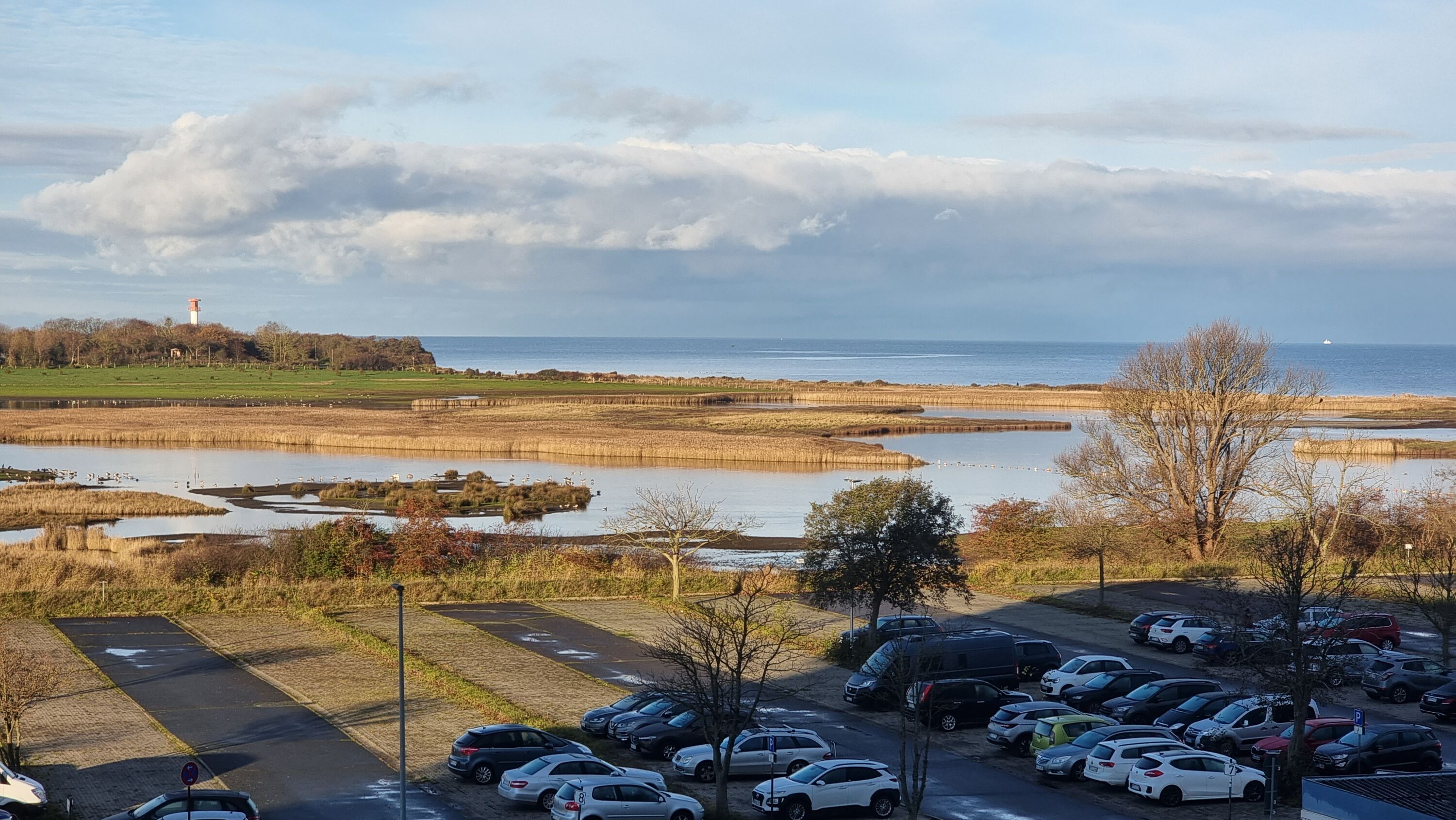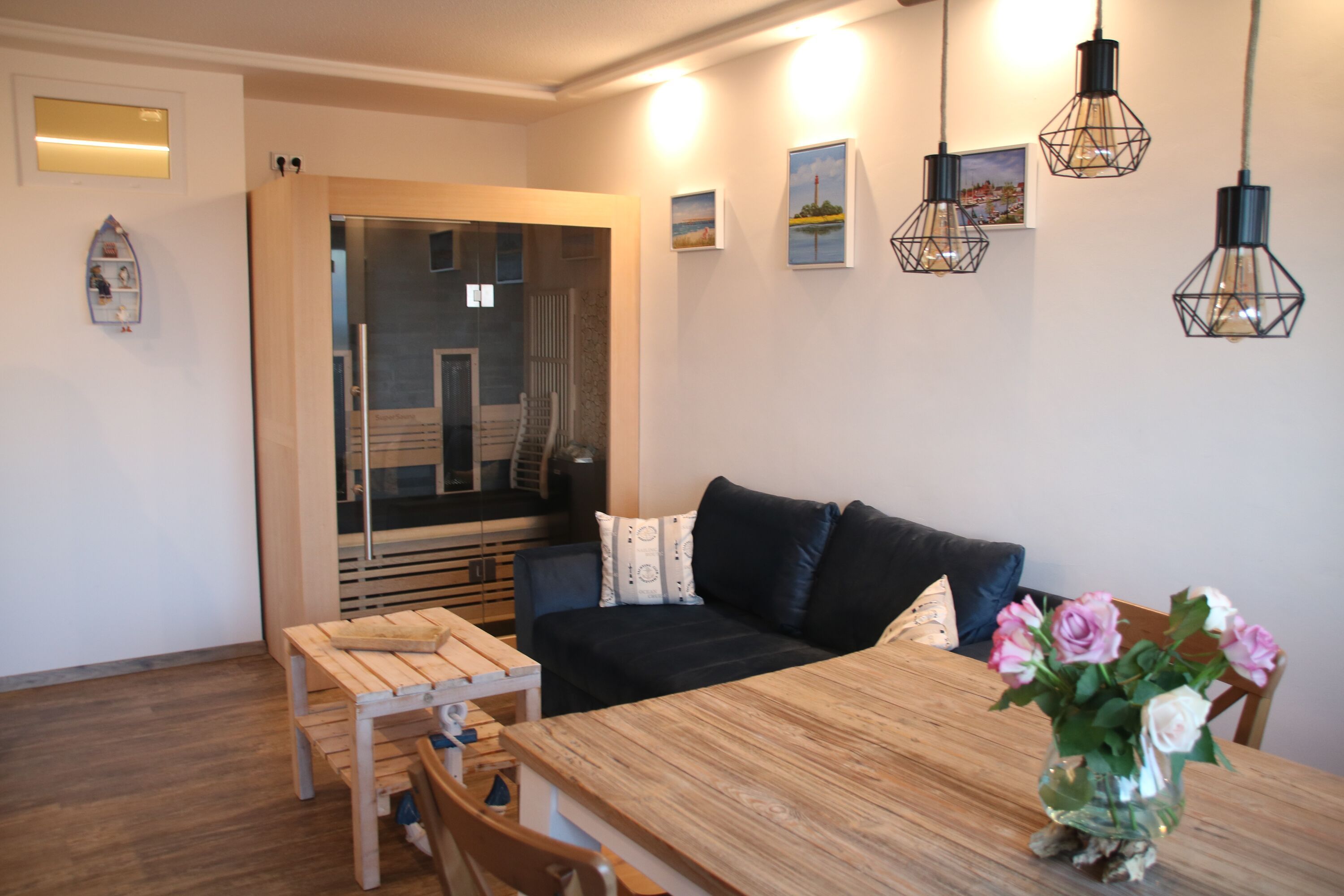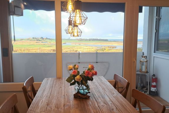 Im Wohnzimmer sitzt man an einem rustikalen Holztisch und schaut über die Salzwiesen mit ihren Gallowayrindern zum Leuchtturm und Ostsee.