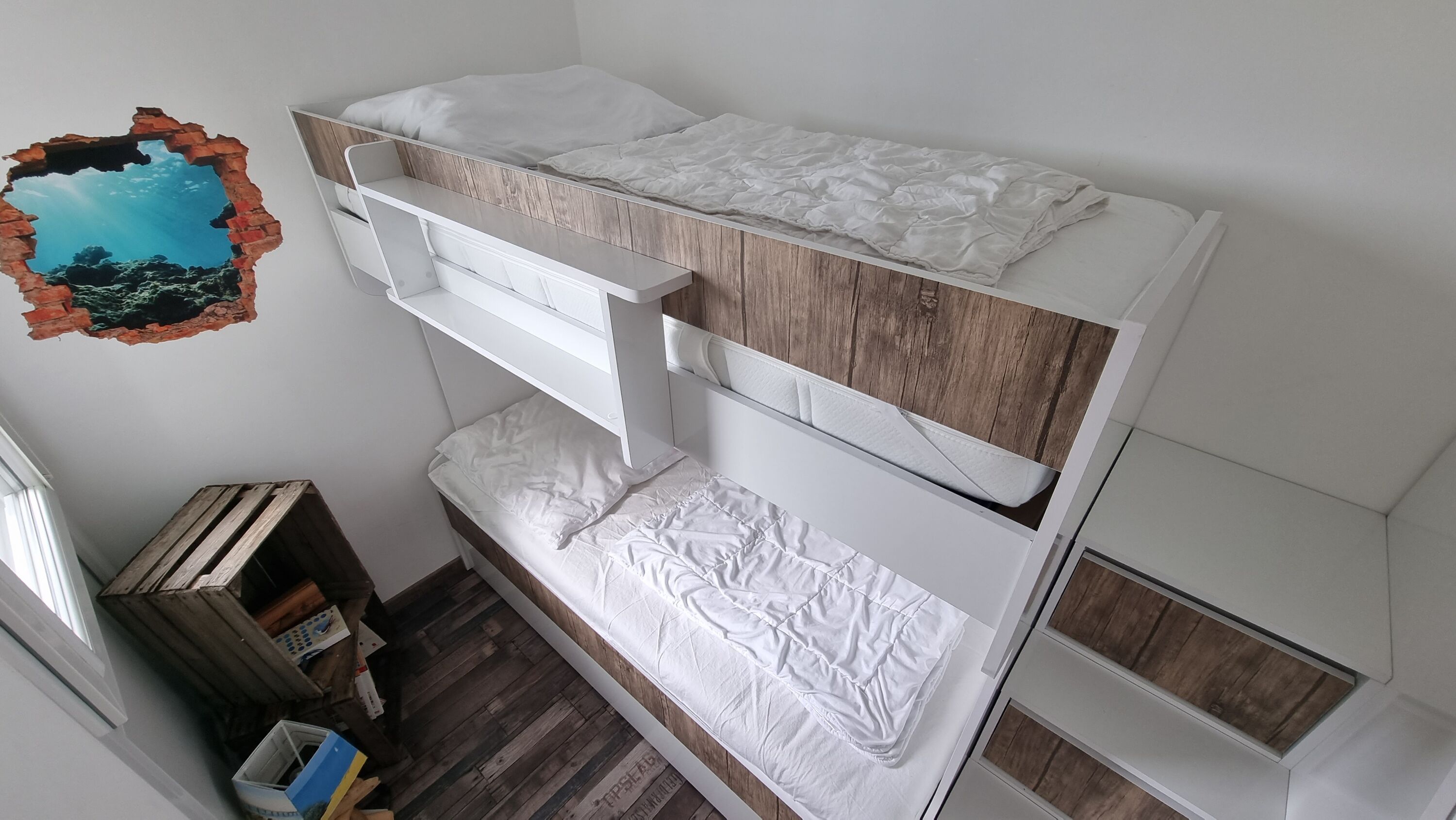 Zur Wohnung gehört ein Schlafzimmer mit Doppelbett (160×200m), ein Kinderzimmer mit Etagenbett, ein Badezimmer mit WC und Dusche sowie eine offene Küche mit Wohnbereich. Für eine weitere erwachsene Person steht ein Schlafsofa zur Verfügung. Sollte ein weiteres Kind mit anreisen, kann dieses auch auf einer Schlafmatratze im Kinderzimmer nächtigen.