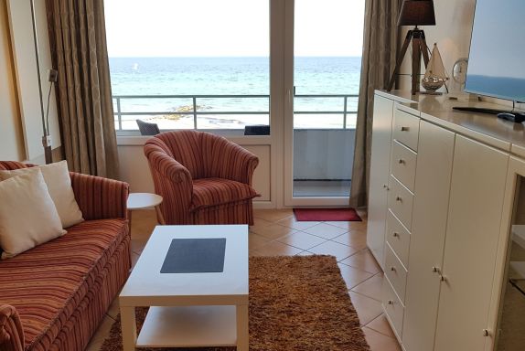 Das Wohn-/Esszimmer hat Meerblick ist ausgestattet mit Sofa + Sessel und Esstisch mit 4 Stühlen.