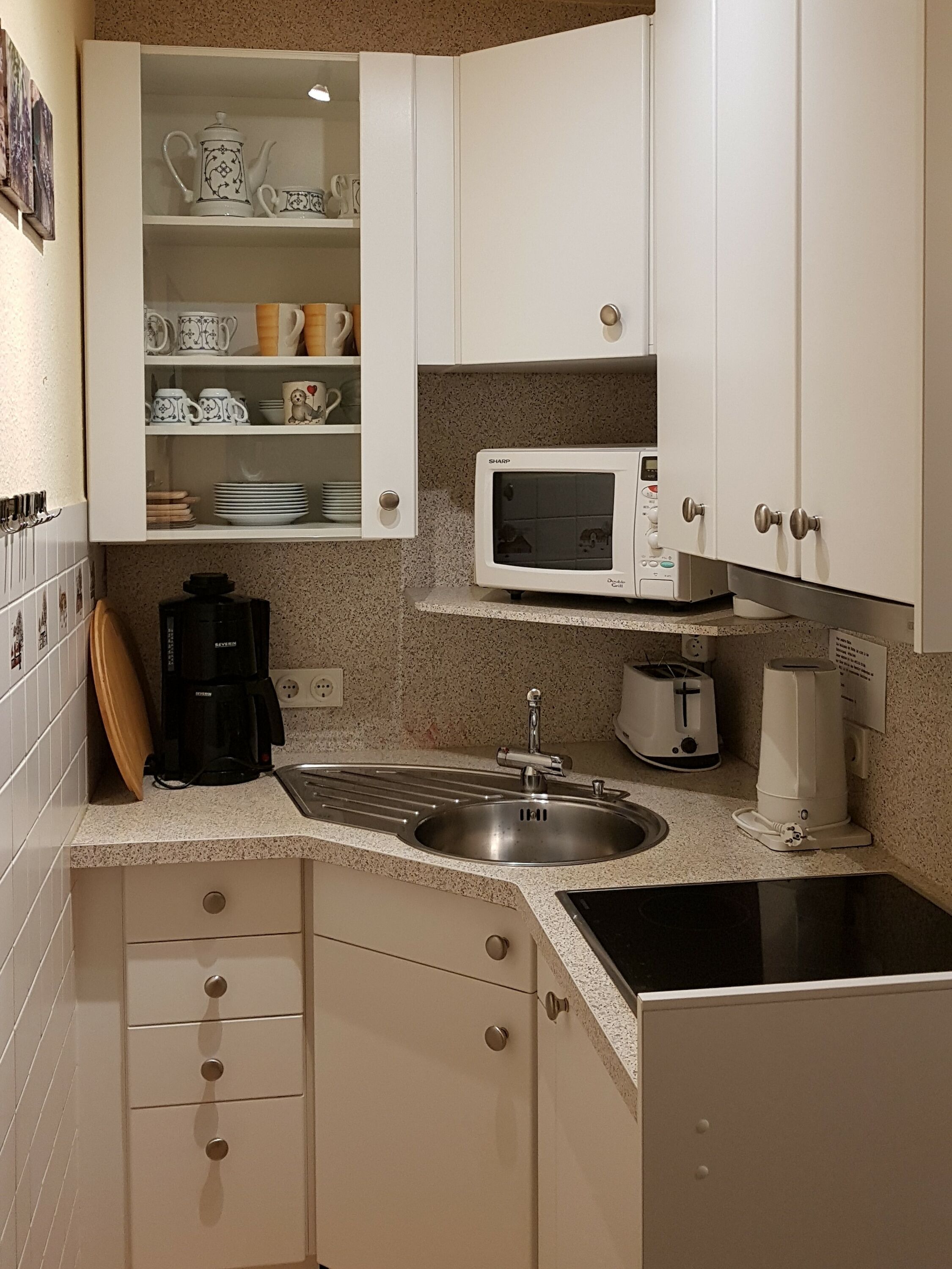 Einbauküche ist komplett eingerichtet: Ceranfeld mit 4 Kochfeldern, Kühlschrank mit Eisfach, Kaffeemaschine, Toaster, Wasserkocher, Mikrowelle mit Grillfunktion, Geschirr usw.
