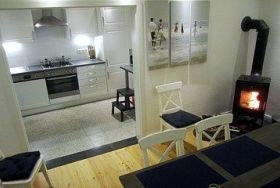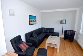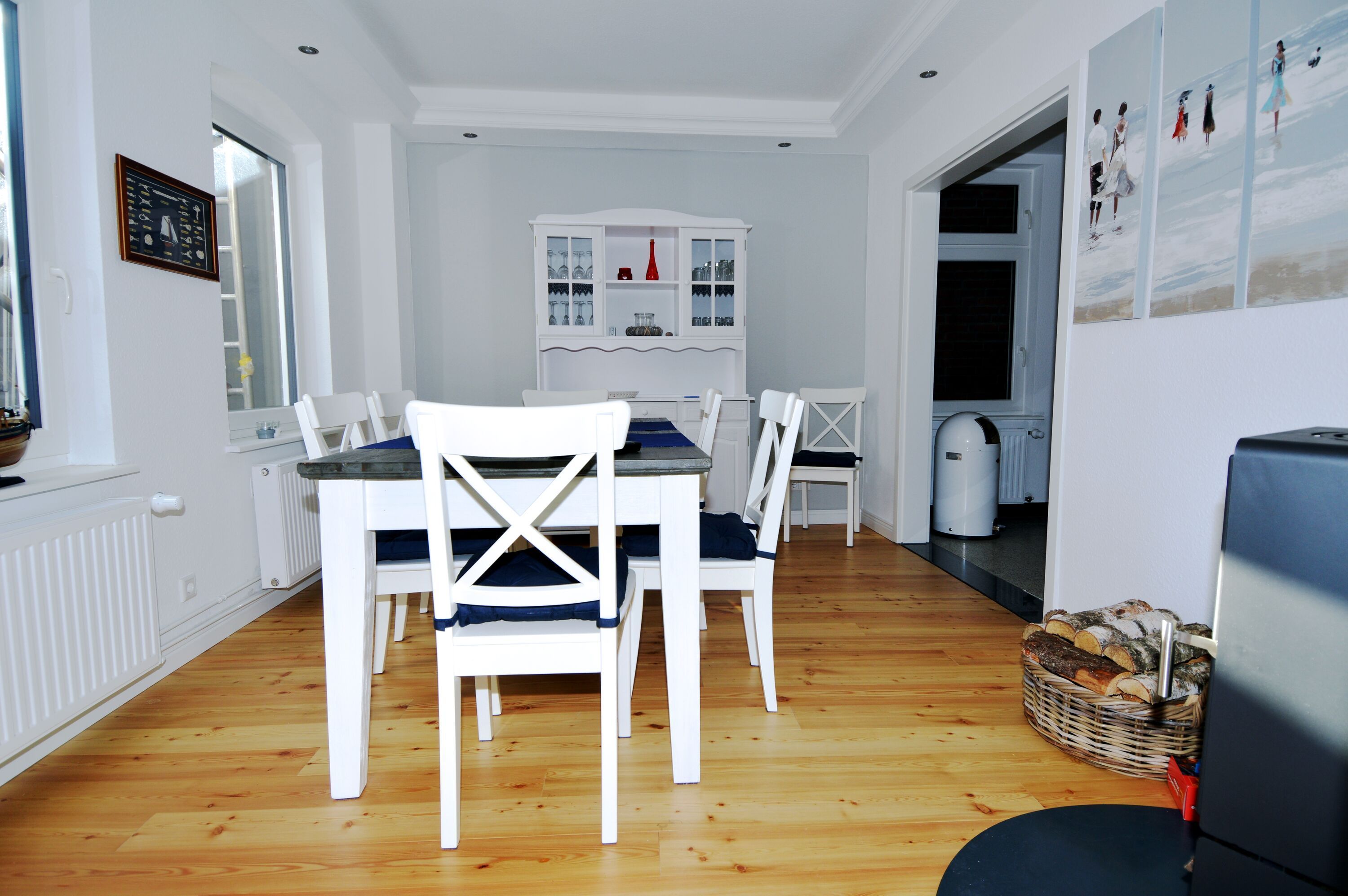 Das großzügige Wohnzimmer mit Kaminofen (bitte beachten Sie, dass Holz nicht zur Verfügung steht) ist der perfekte Ort für gesellige Abende. Genießen Sie entspannte Stunden vor dem Fernseher oder lassen Sie sich von der behaglichen Atmosphäre des Kamins verzaubern.
