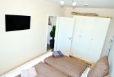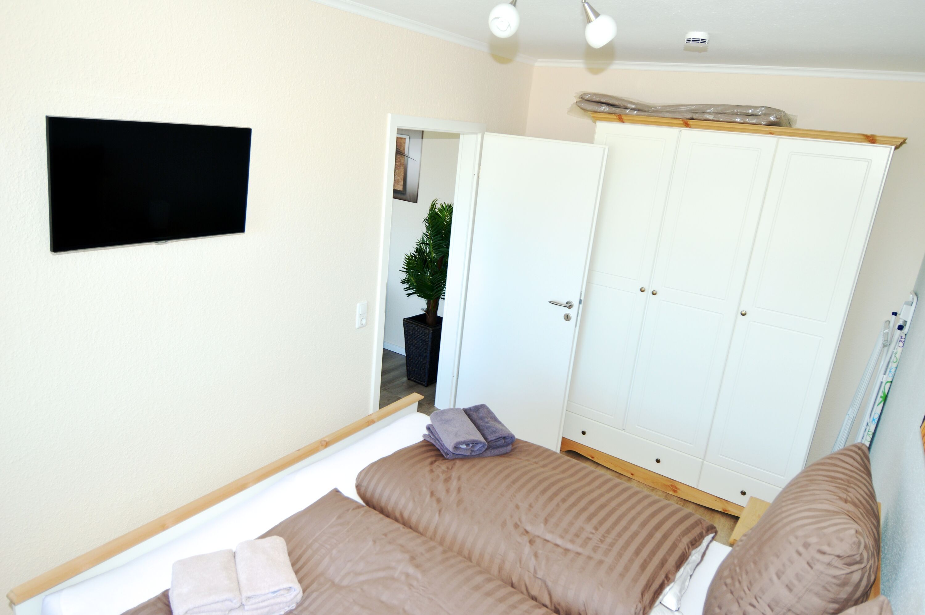Das separate Schlafzimmer ist mit einem Doppelbett und einem Kleiderschrank sowie einem weiteren TV ausgestattet. Zur Wohnung gehört ein eigener Parkplatz in unmittelbarer Nähe des Eingangs und das Haus verfügt über einen abschließbaren Fahrradunterstand. Ihr Hund ist herzlich willkommen.