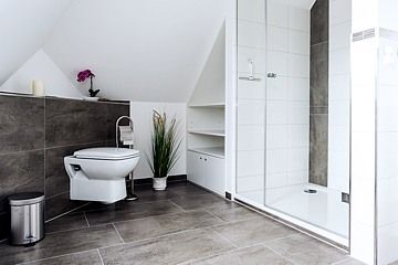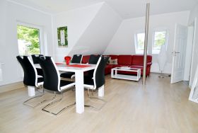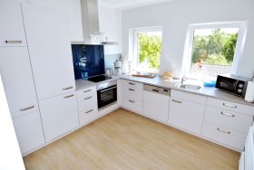 Die große Küche bietet alles, was Sie im Urlaub benötigen: Ceranfeld, Backofen, Mikrowelle, Kaffeemaschine, Geschirrspüler und Kühlschrank mit Gefrierfach. Die Küche ist zum Flur und Wohnraum hin offen. Der Wohn- und Essraum bietet eine große Couch und einen großen Esstisch. Ein TV darf natürlich auch hier nicht fehlen. Auch das Bad ist modern gestaltet und mit Dusche ausgestattet.
