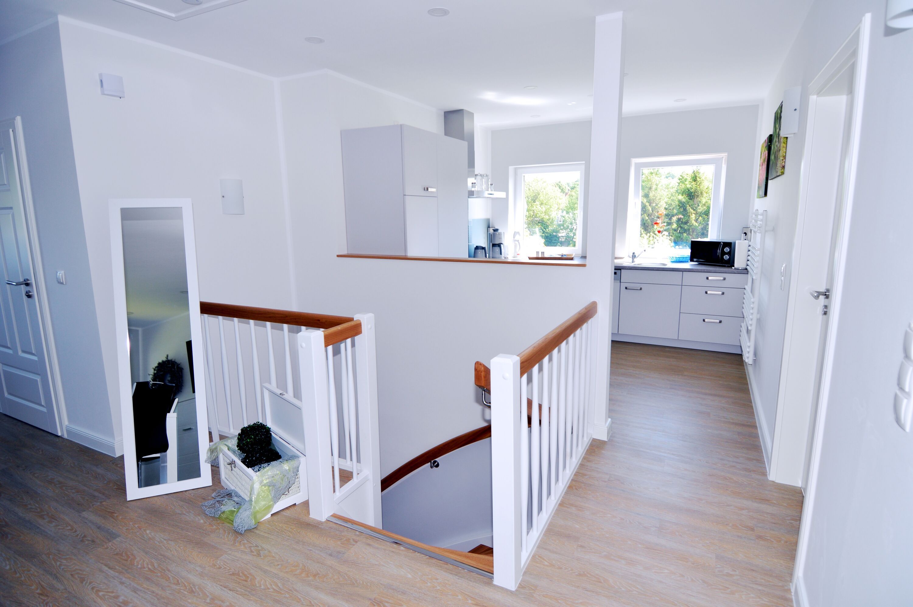 Die Wohnung erreichen Sie über eine großzügige Außentreppe, dort finden Sie die Eingangstür. Zur Wohnung gehen Sie innerhalb des Hauses noch eine Treppe höher in die 2. Etage.