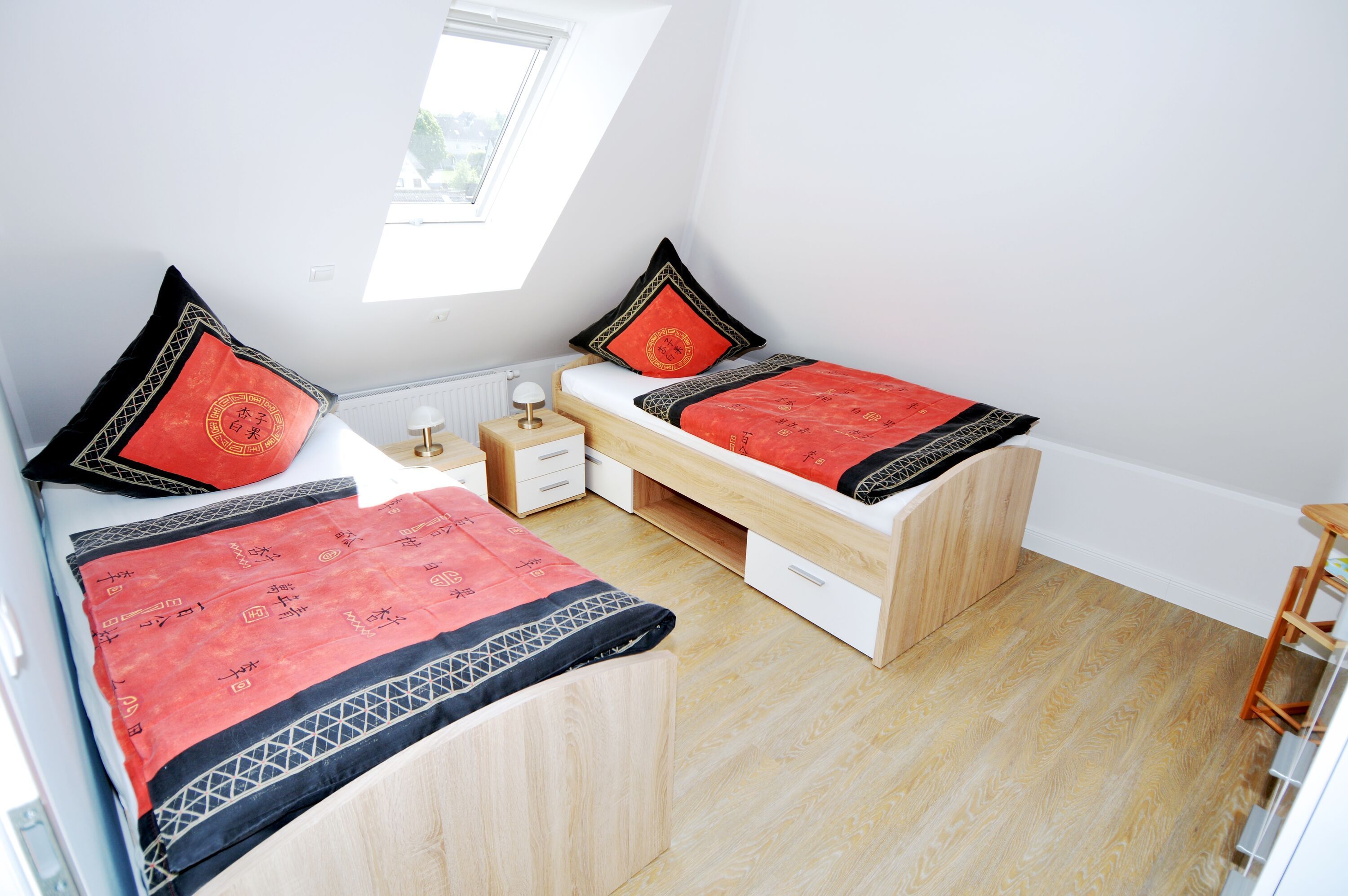 Die Ferienwohnung Lütjenburger Weg 27 OG liegt auf einem kleinen Stadt-Bauernhof in Heiligenhafen und wird liebevoll gepflegt. Bei der hellen und modernen Ausstattung fühlt man sich sofort wohl. Das große Schlafzimmer ist mit einem Doppelbett, Schrank und einem Fernseher ausgestattet, ein Kinderbett hätte hier auch noch ausreichend Platz. Das Kinderschlafzimmer verfügt über zwei Einzelbetten und kann natürlich auch von Erwachsenen bewohnt werden. Babybett und Hochstuhl gehören zur Ausstattung der Wohnung.