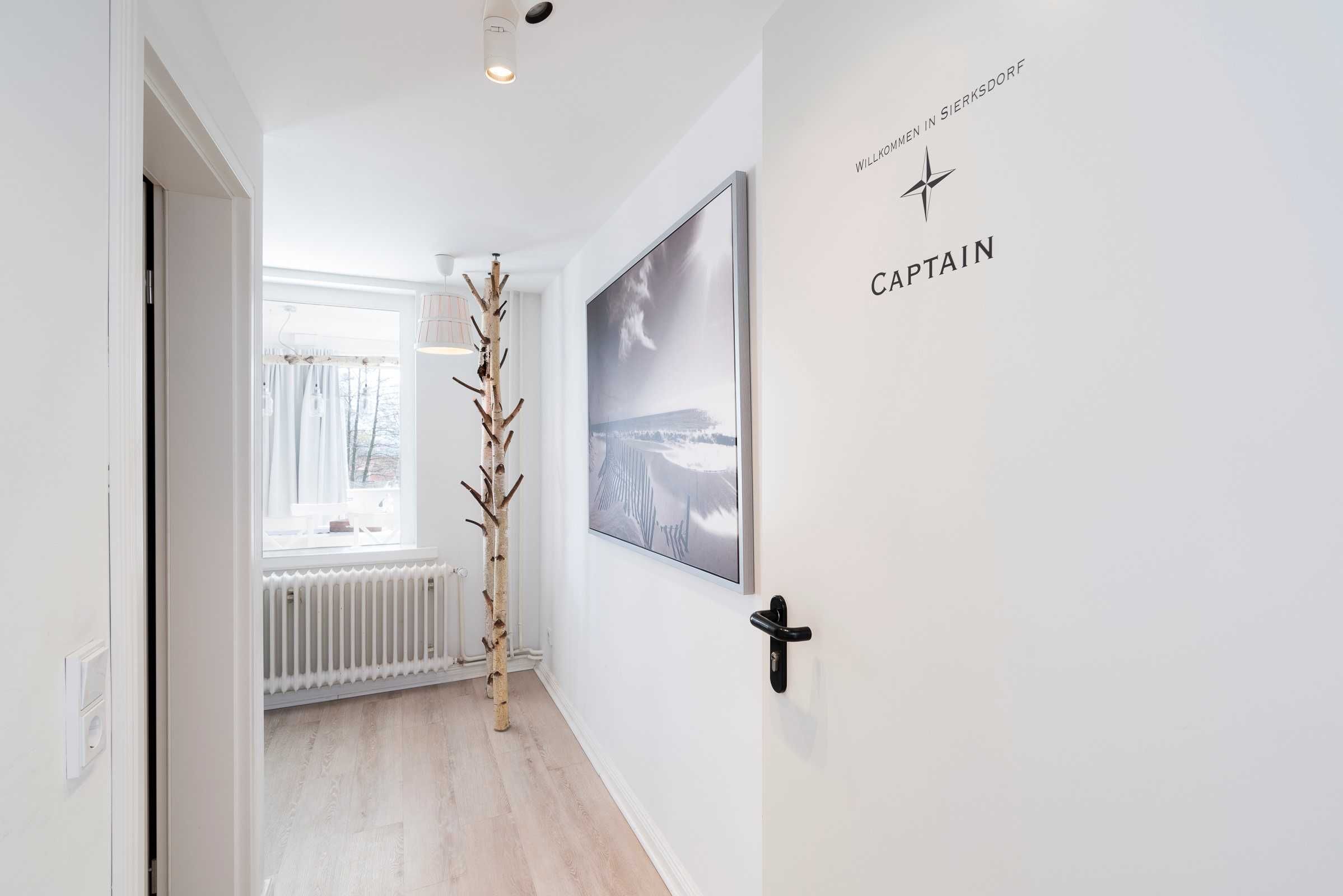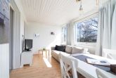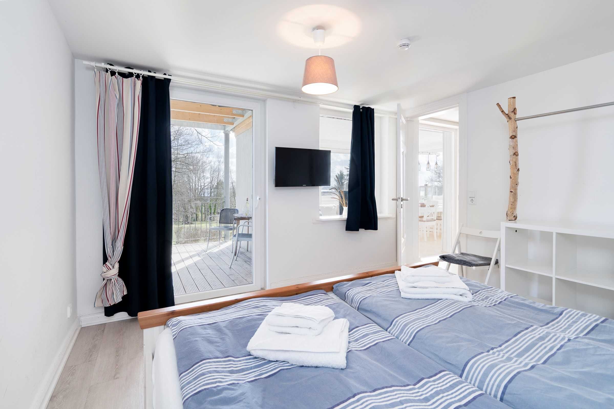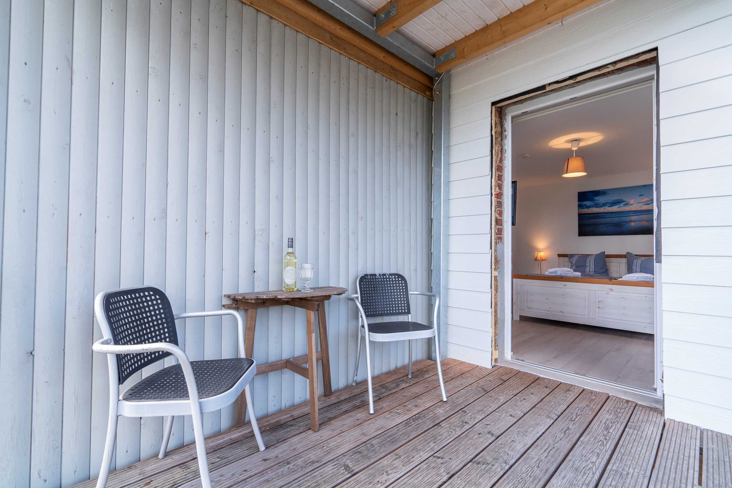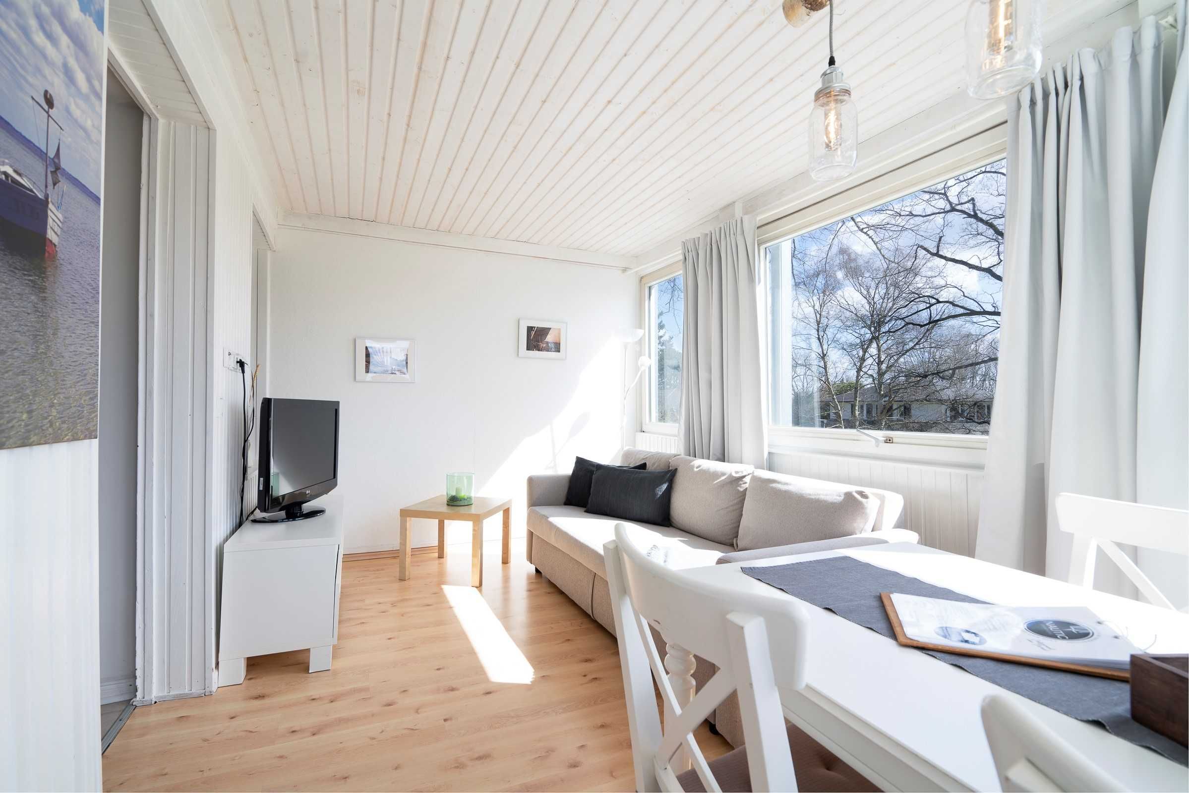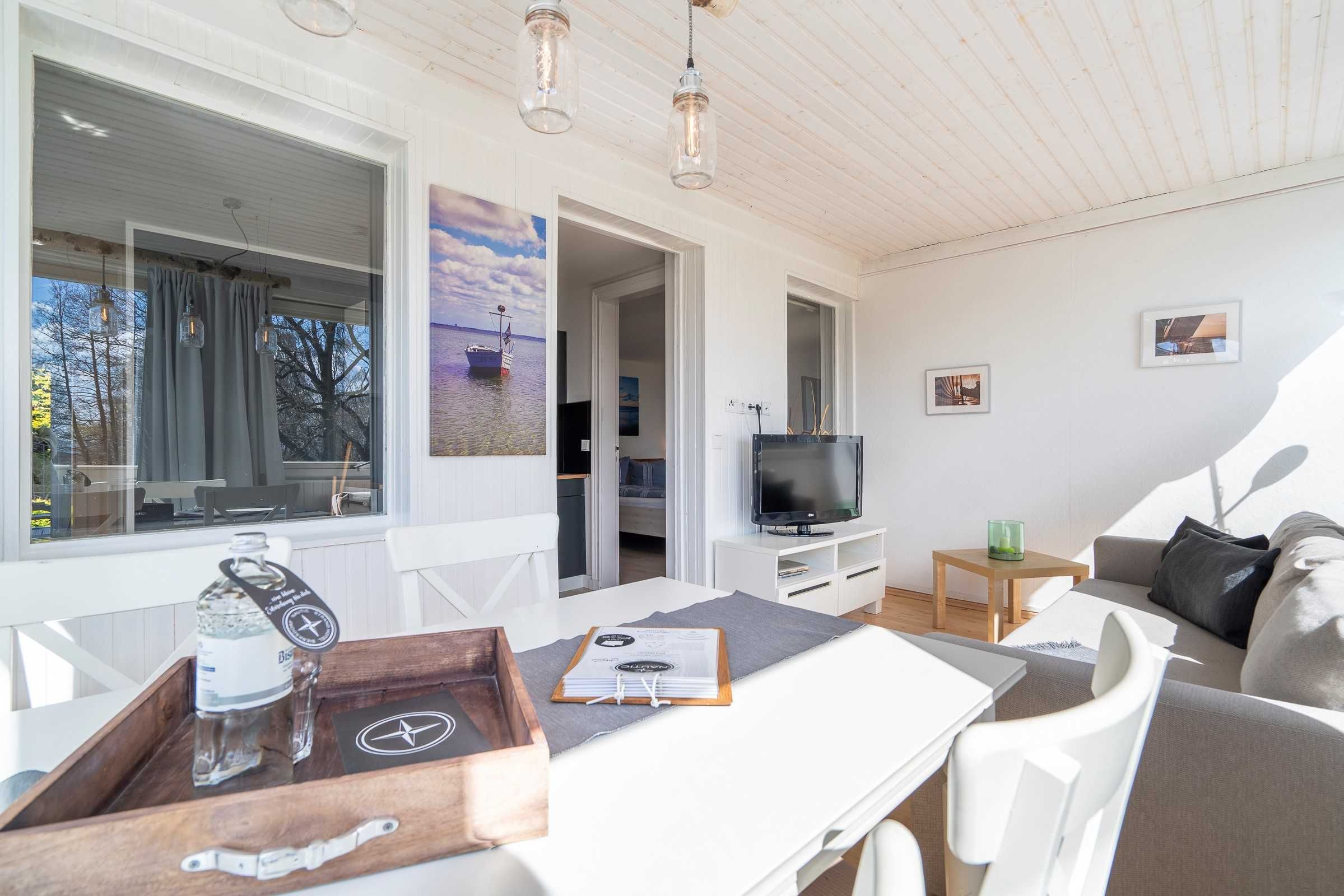 Unsere Ferienwohnung Captain bietet alles, was man für einen Strandurlaub brauchst. Die 3-Zimmer-Ferienwohnung wurde im Frühjahr 2022 renoviert und neu eingerichtet. Die Wohnung besteht aus einem hellen Logia-Wohnzimmer mit großem Fenster zum Wasser und Balkon, einem Schlafzimmer, einer Küche im Flur und einem Bad mit Walk-In-Dusche. Die Veranda bzw. Logia ist großflächig verglast und herrlich hell. Dort steht der Esstisch mit vier Stühlen und einem Umklappsofa (140 x 200cm). Im Schlafzimmer gibt es ein 180 cm Doppelbett. Vom Wohnzimmer geht Richtung Meer ein Balkon mit Tisch und Stühlen ab.